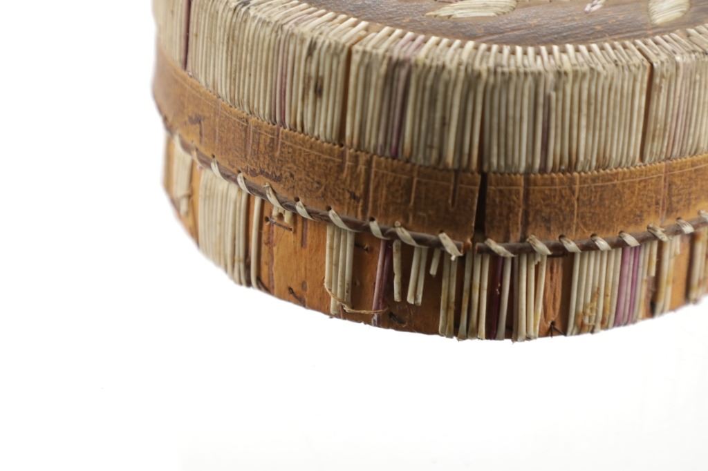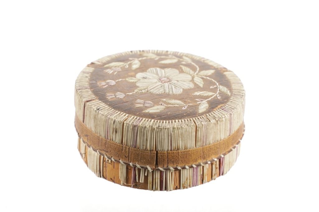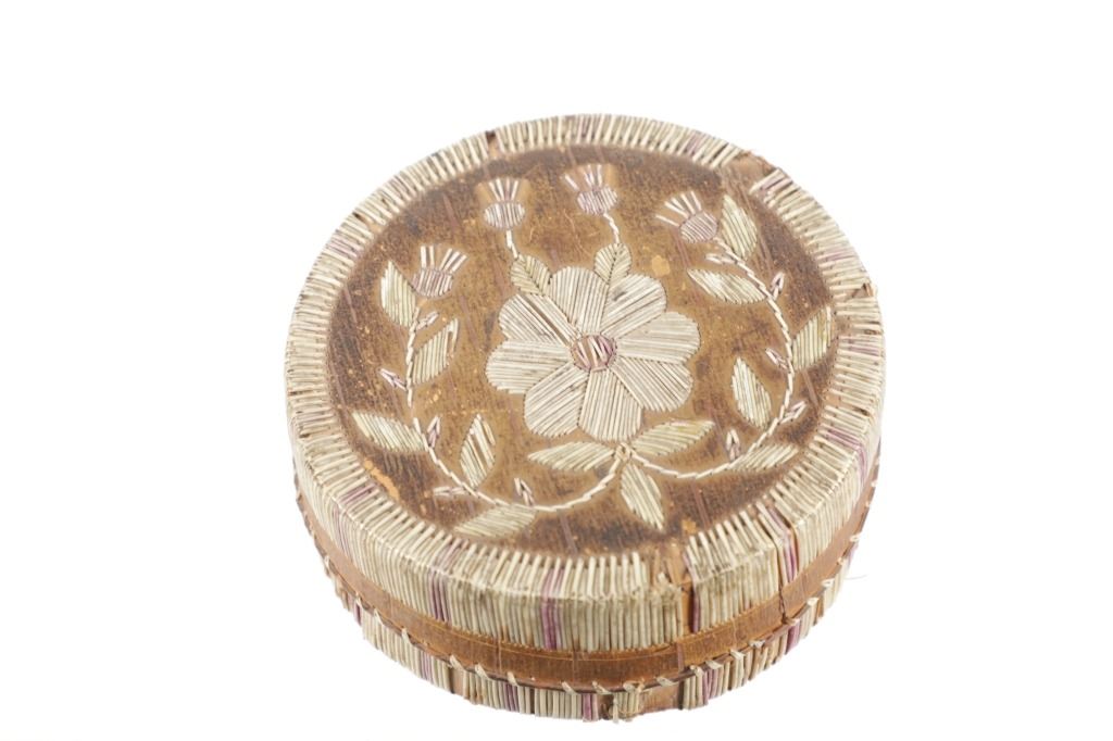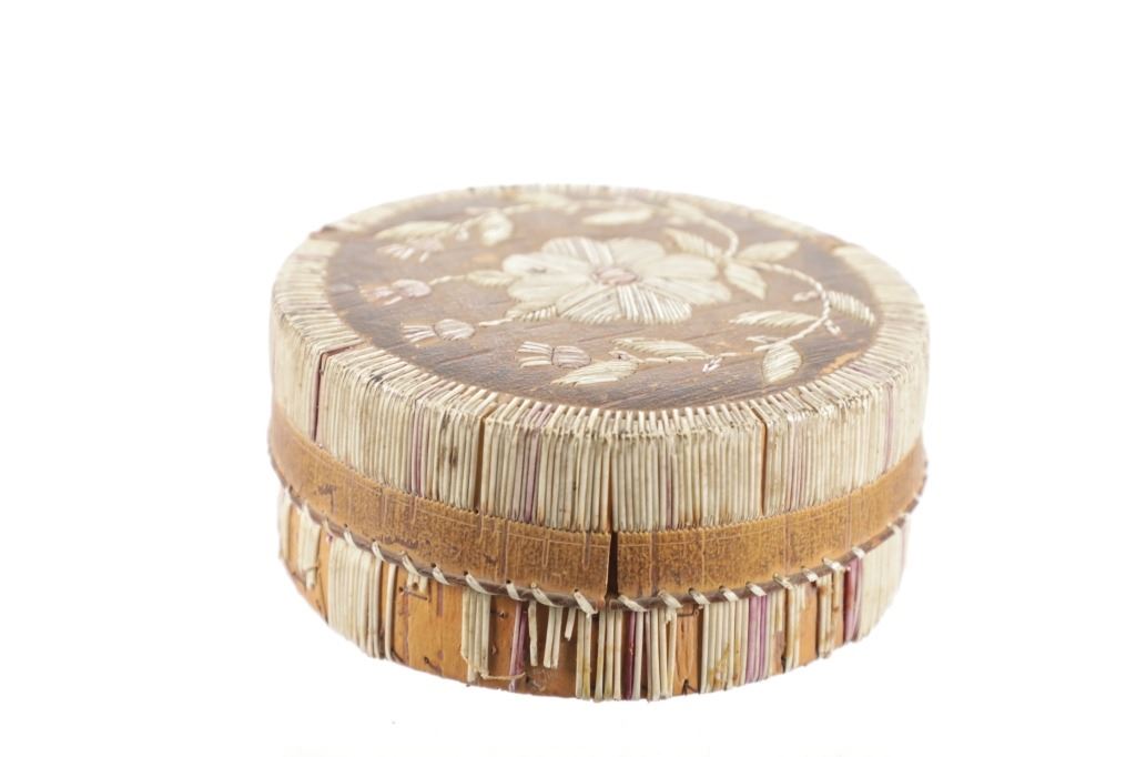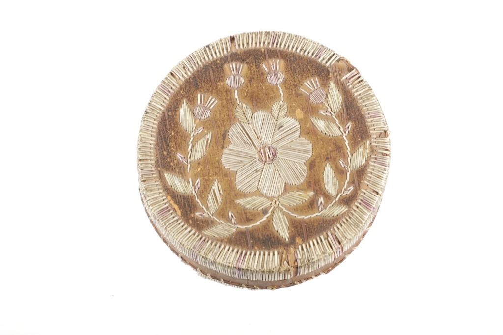 The lot features a circa 1920’s porcupine quill quillwork box from the Chippewa / Ojibwa. The box is comprised of a birch bark construction with artful porcupine quill quillwork designs over both the lid and base and the top of the lid has a wonderful whimsical quilled flower design. The art of decorating items with porcupine quills is unique to North America. The Native peoples living in the Great Lakes area were doing quill work before the first European contact in 1615. Much sought after, this work was encouraged by French fur traders these Native American peoples-- mostly the Ottawa and Chippewa-- began to place quill decorations on birch bark boxes. The box has some quill loss, some natural color fading and some nice patina. Nice overall medium size measures 5 5/8-inch diameter by 2.5-inches high.