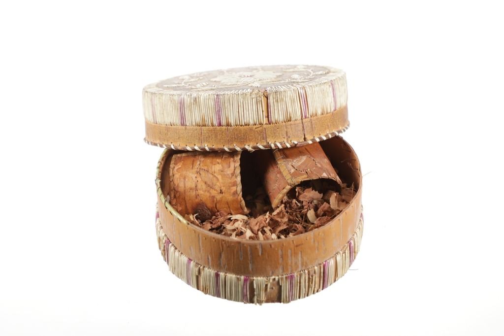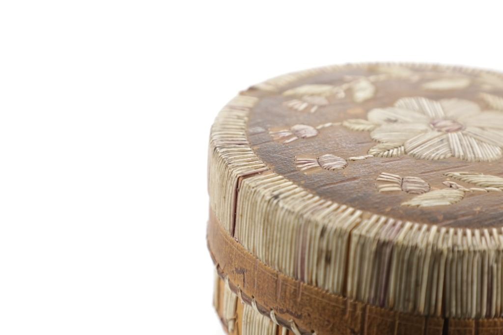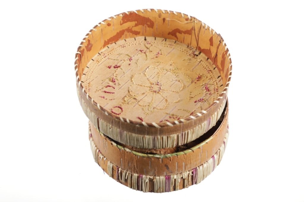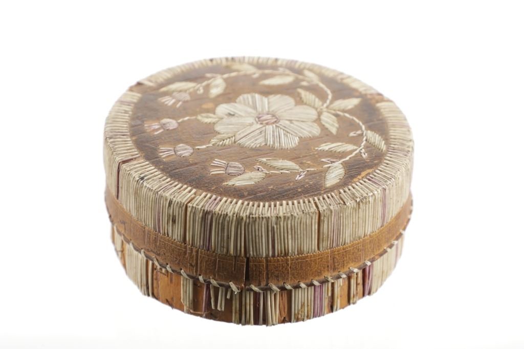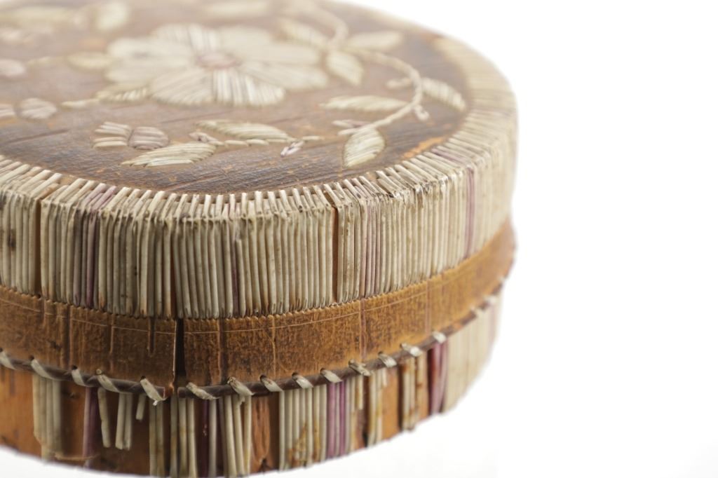 The lot features a circa 1920’s porcupine quill quillwork box from the Chippewa / Ojibwa. The box is comprised of a birch bark construction with artful porcupine quill quillwork designs over both the lid and base and the top of the lid has a wonderful whimsical quilled flower design. The art of decorating items with porcupine quills is unique to North America. The Native peoples living in the Great Lakes area were doing quill work before the first European contact in 1615. Much sought after, this work was encouraged by French fur traders these Native American peoples-- mostly the Ottawa and Chippewa-- began to place quill decorations on birch bark boxes. The box has some quill loss, some natural color fading and some nice patina. Nice overall medium size measures 5 5/8-inch diameter by 2.5-inches high.