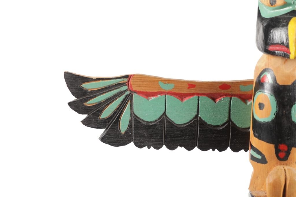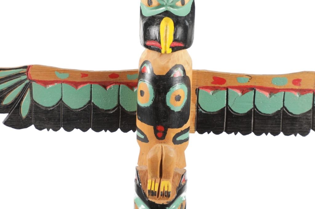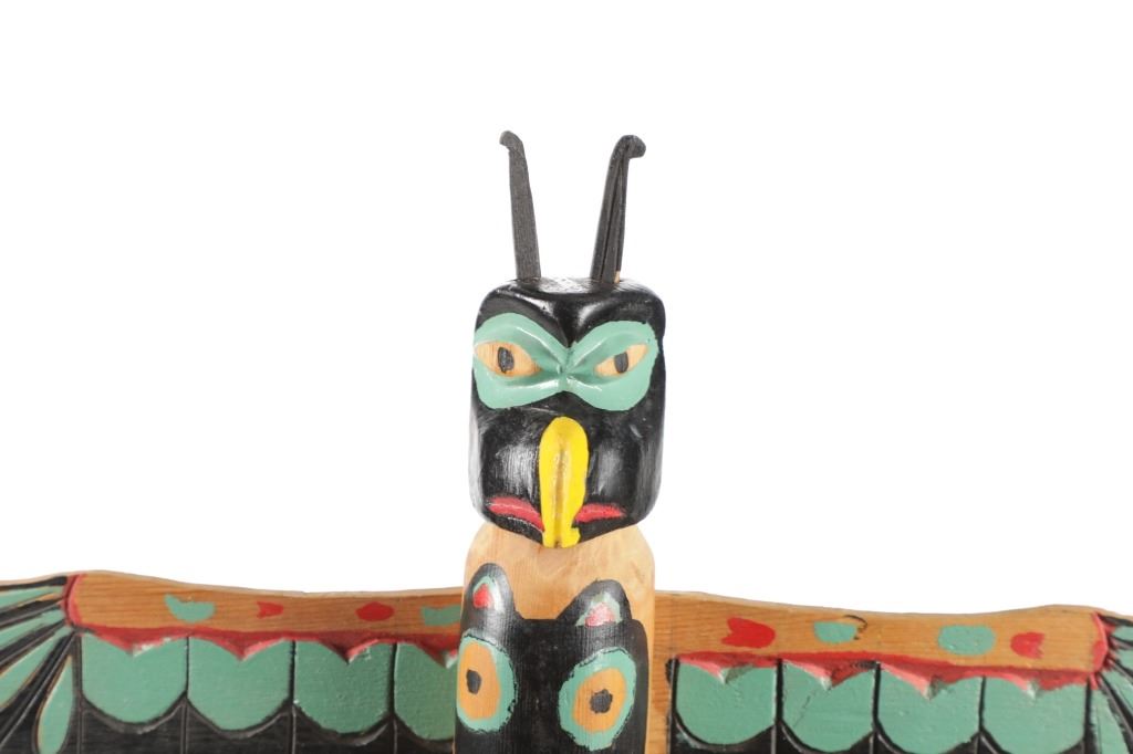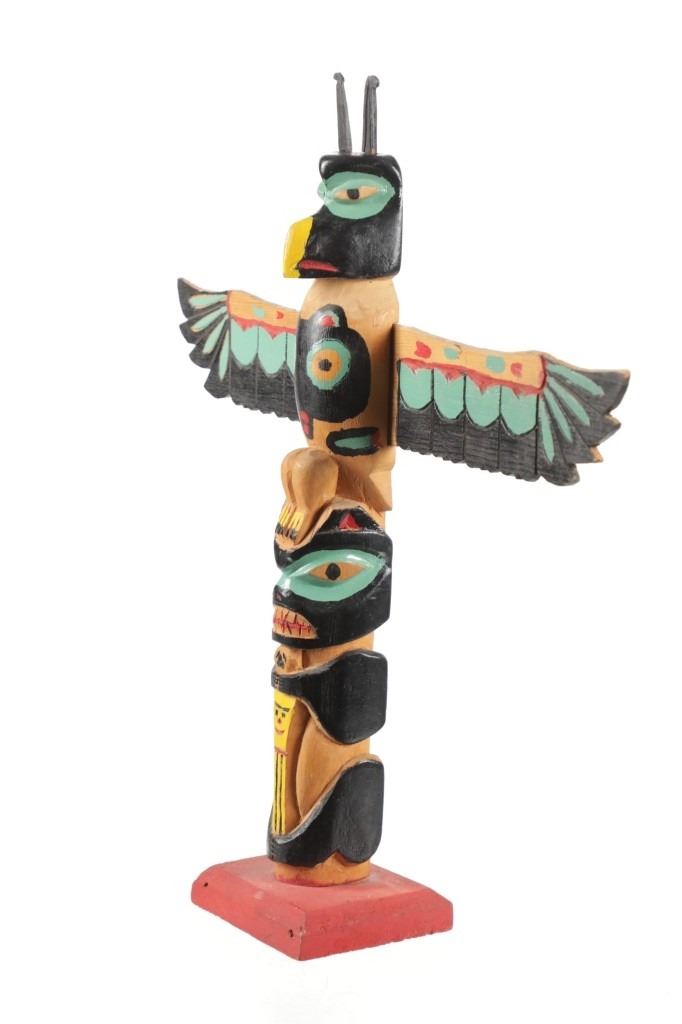 The lot features a hand-signed and stamped circa 1920-1940 Tlingit Frances Carlson carved and painted tourist trade totem pole sculpture with U.S. Indian Department stamping. The bottom is hand signed in fountain pen ink, "Frances Carlson Skagway, Alaska" and stamped on the back, "(D) U.S.I.D. ALASKA (something illegible)." U.S.I.D. stands for the United States Indian Department. The name U.S. Indian Department dates to circa 1849-1947, in 1947 the Department of the Interior adopted the name "Bureau of Indian Affairs". The piece has the totem, removable wings and two removable horns all carved from cedar. Measures overall 16.25-inches high by 14-inches wide by 3.75-inches deep.