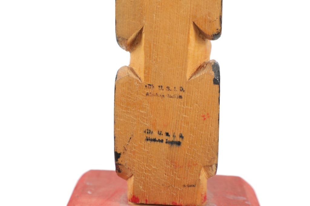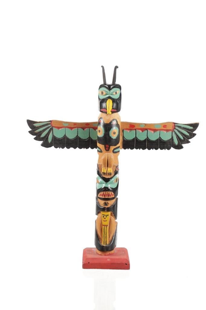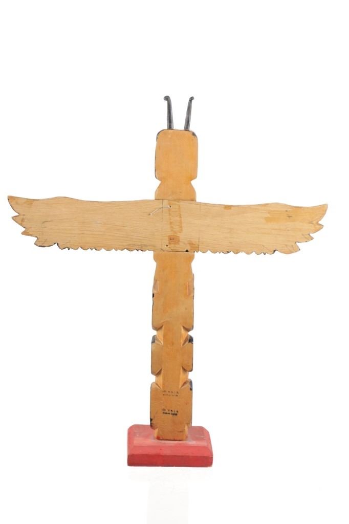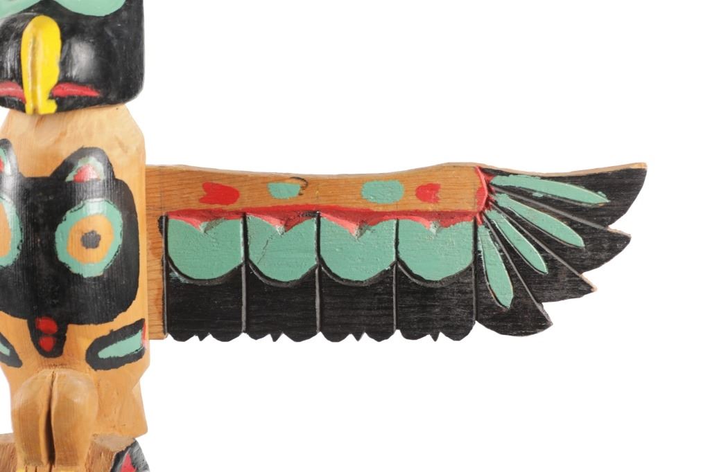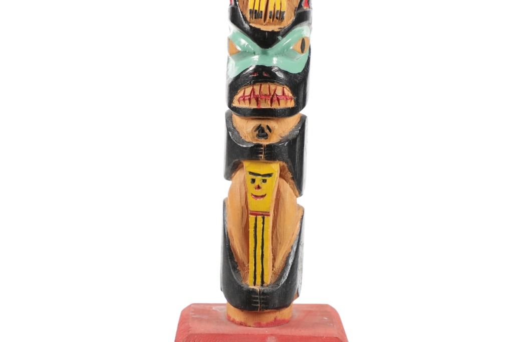 The lot features a hand-signed and stamped circa 1920-1940 Tlingit Frances Carlson carved and painted tourist trade totem pole sculpture with U.S. Indian Department stamping. The bottom is hand signed in fountain pen ink, "Frances Carlson Skagway, Alaska" and stamped on the back, "(D) U.S.I.D. ALASKA (something illegible)." U.S.I.D. stands for the United States Indian Department. The name U.S. Indian Department dates to circa 1849-1947, in 1947 the Department of the Interior adopted the name "Bureau of Indian Affairs". The piece has the totem, removable wings and two removable horns all carved from cedar. Measures overall 16.25-inches high by 14-inches wide by 3.75-inches deep.