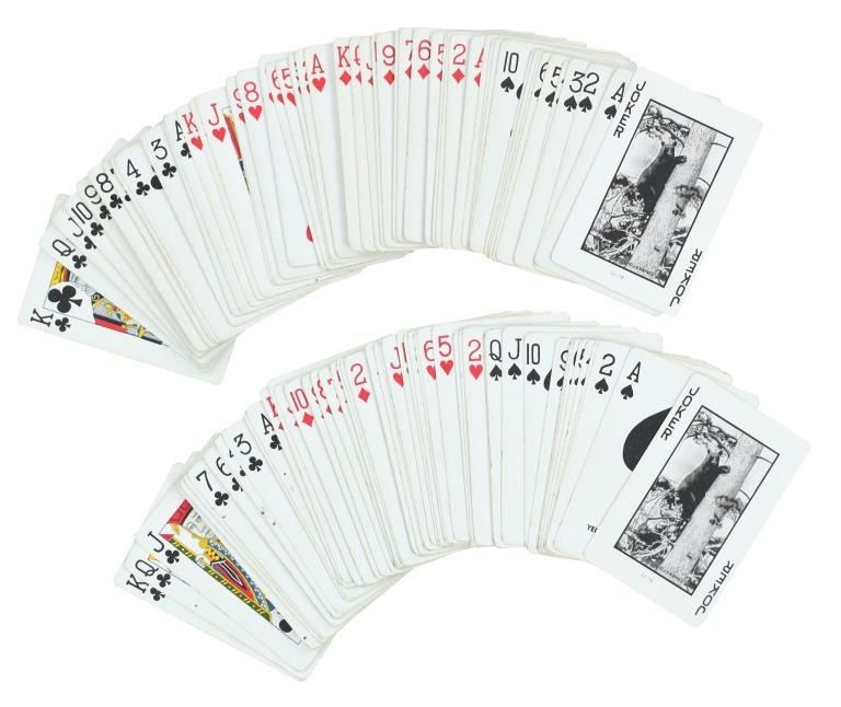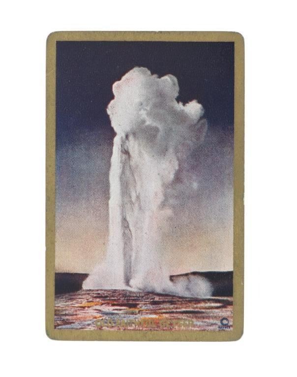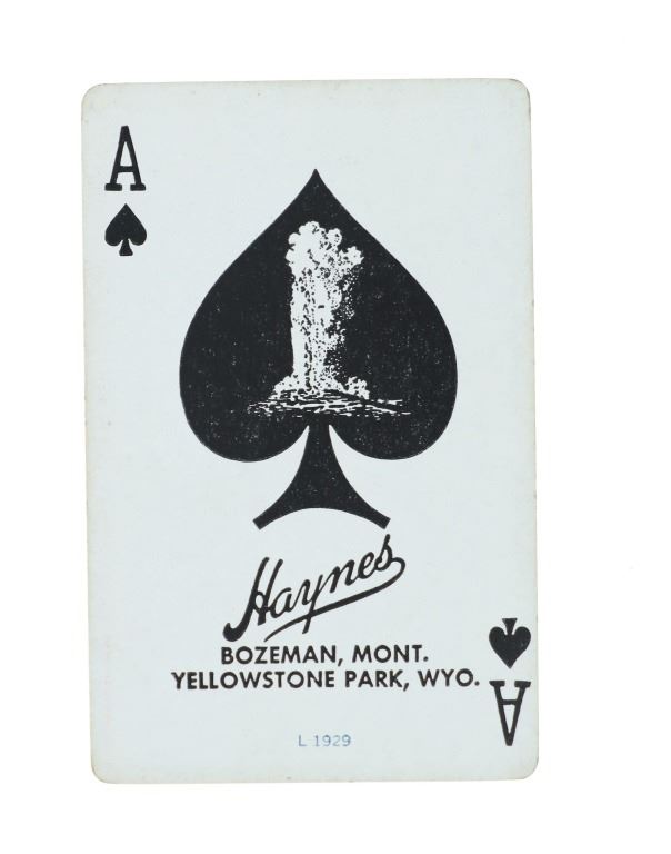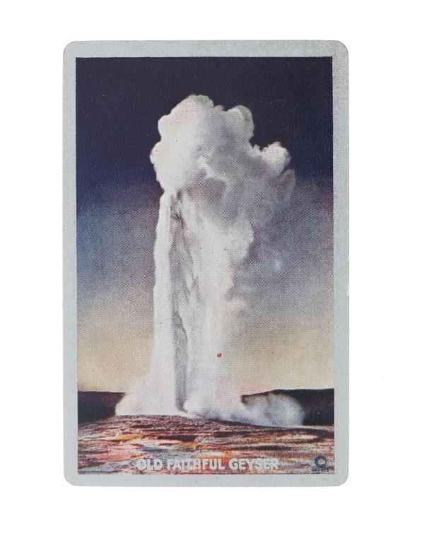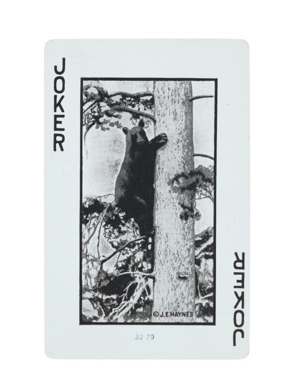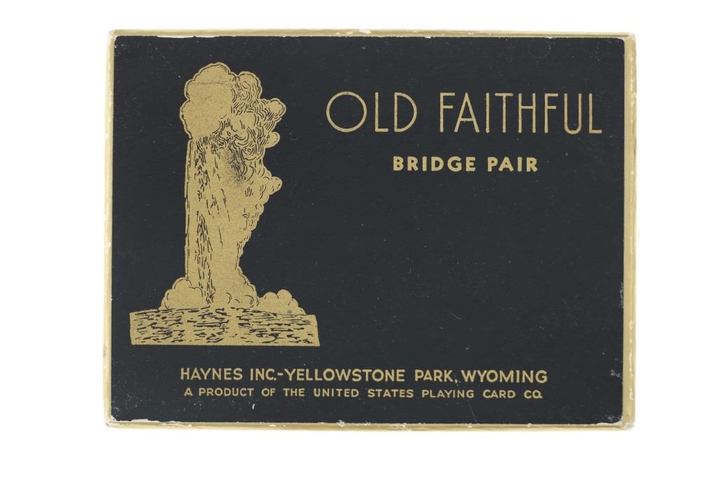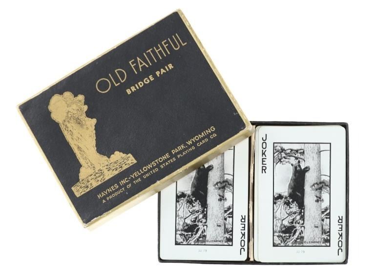 The lot features an Old Faithful Bridge Pair Haynes Photographer Yellowstone Park playing card double deck set dated to circa 1929. The set is in a dark brown and gilt gold box that is marked, “OLD FAITHFUL BRIDGE PAIR HAYNES INC. – YELLOWSTONE PARK, WYOMING A PRODUCT OF THE UNITED STATES PLAYING CARD CO.” Each deck shows the J.E. Haynes 32 79 black bear climbing a tree Yellowstone photograph Joker card. Each deck has the ace of spades showing an Old Faithful geyser in the center and marked, “Haynes Bozeman, Mont. Yellowstone Park, Wyo. L 1929”. Each deck has a colorized photograph of Old Faitful Geyser Haynes on the back of each card. Both decks have 53 total cards (52 number and face cards with 1 Joker each; a total of 106 playing cards). The box measures 5-inches by 3.75-inches by 7/8-inches.