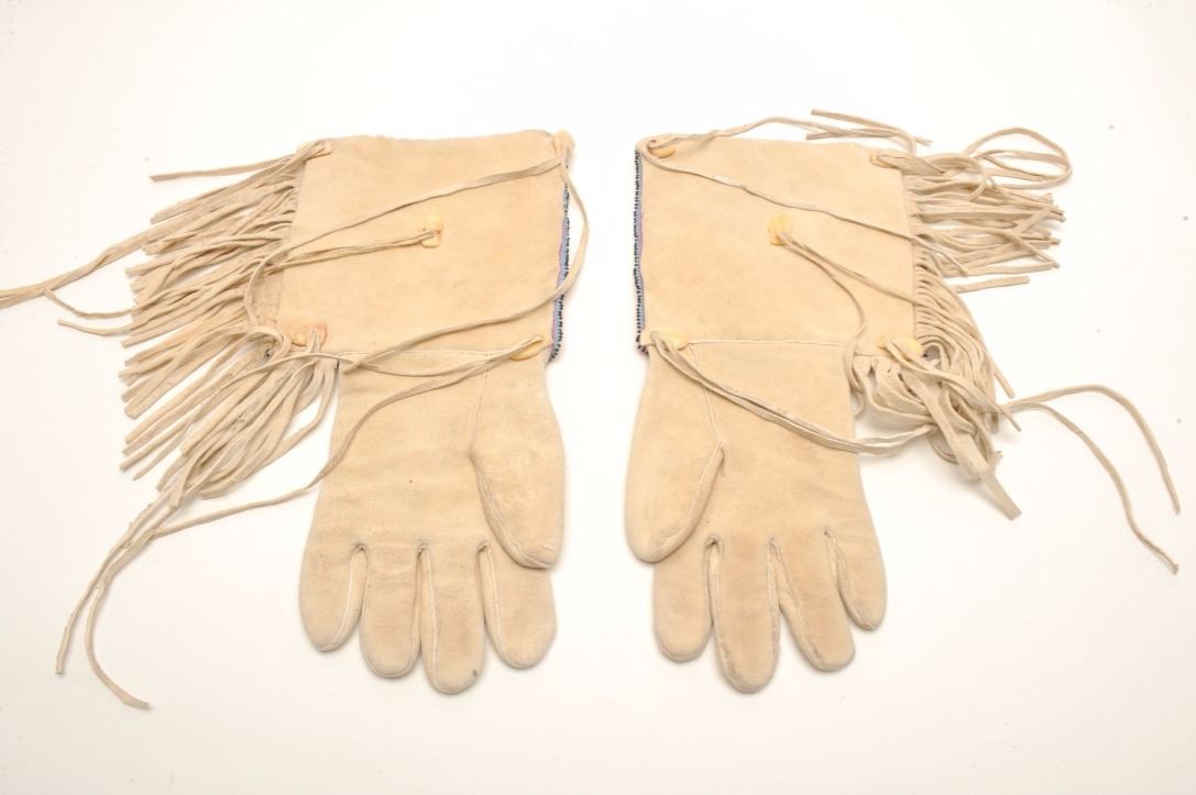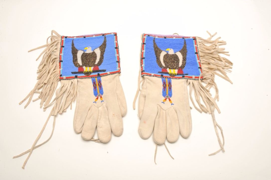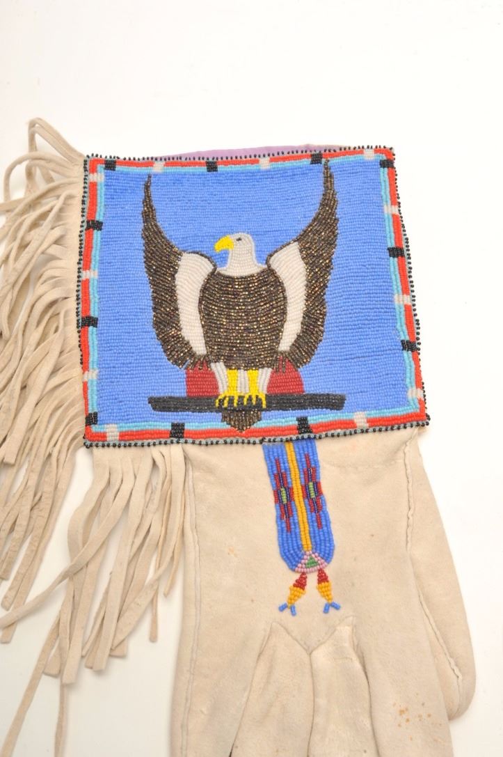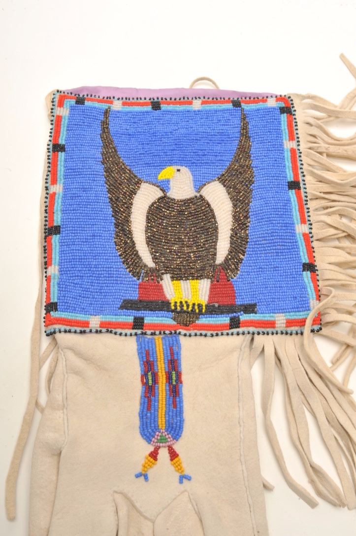 Ca. 1930’s Blackfoot men’s pair of gauntlets with fringes and beaded eagle design; approximately 15” x 7.5” in overall fine condition and with a Certificate of Authenticity dated Nov. 15th, 1994,indicating the gauntlets were from Julie Wades-In-The-Water and were previously in the Hanneman collection of Billings, MT. (collection #H-145). Est.: $1,000-$2,000.