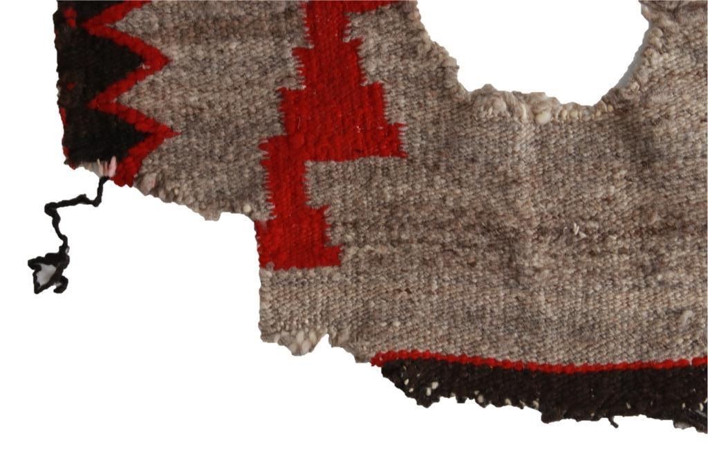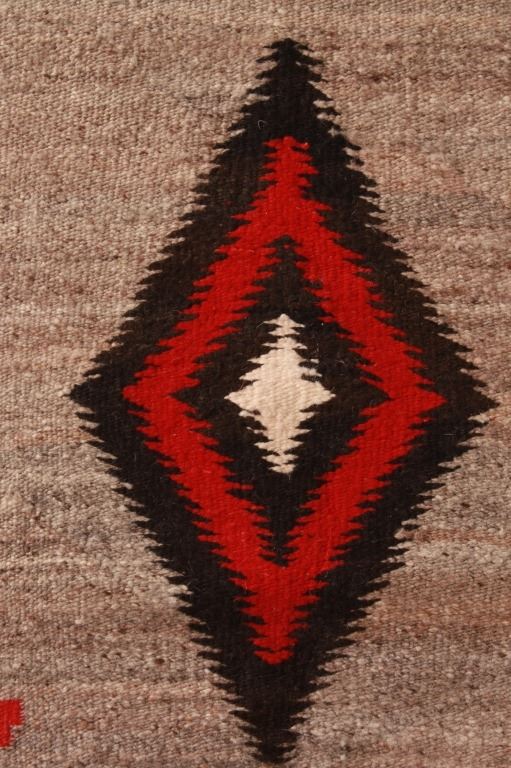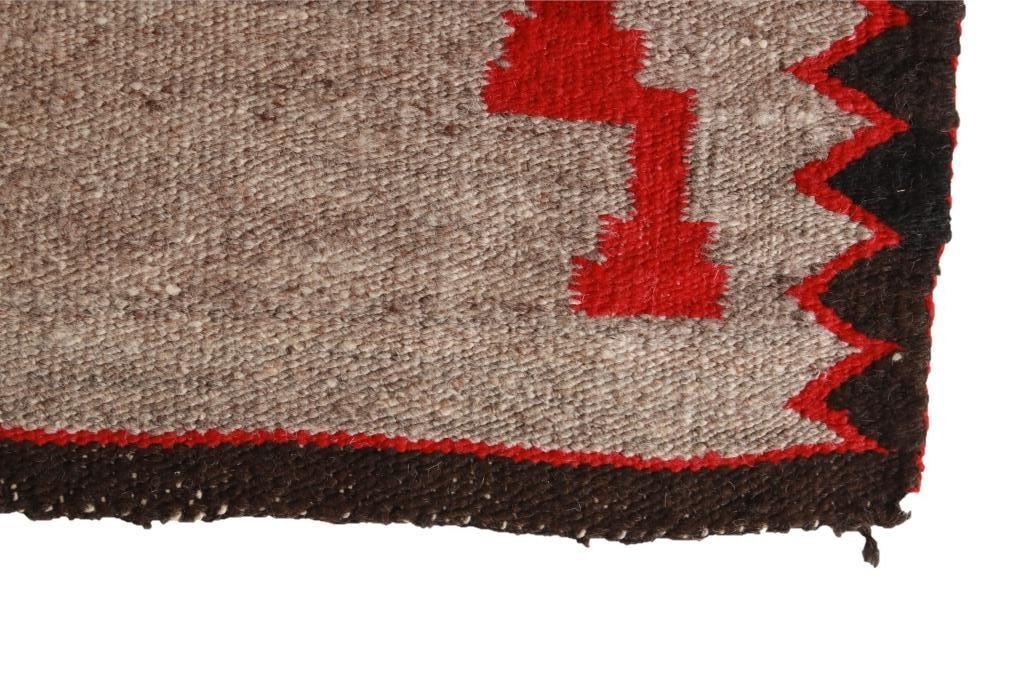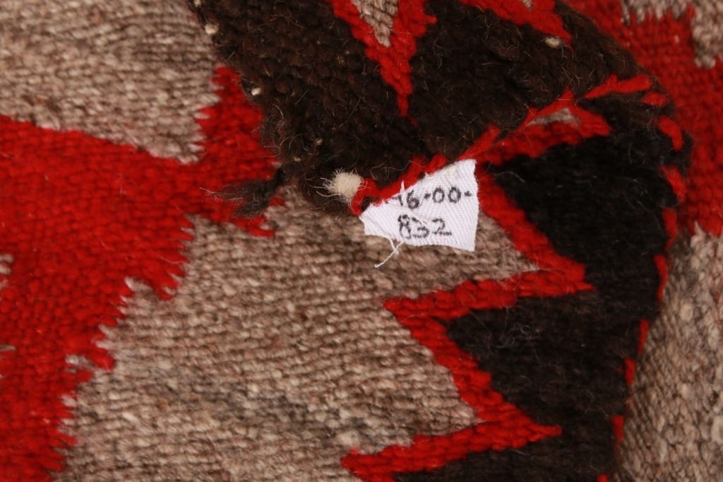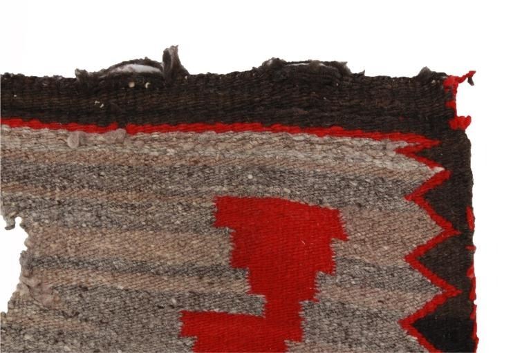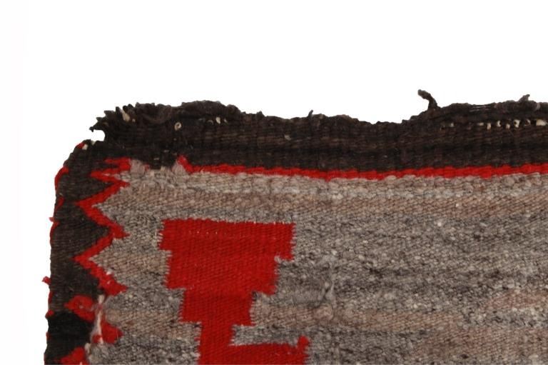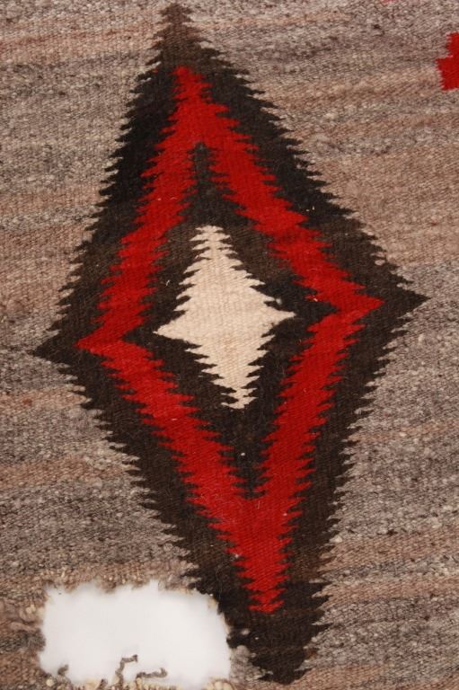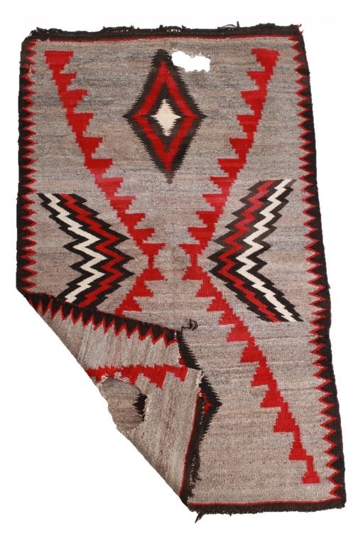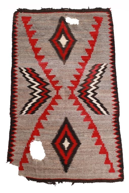 Featured in this lot is this Navajo Klagetoh Trading Post heavy rug circa 1930-1940's. The rug features a wonderfully and professionally crafted wool construction that shows a intricate detail of geometric and lightening patterns with a stepped triangular border and diamond medallions on either side of the central axis. The rug shows a heathered grey field with black, red, and off white coloration to the geometric patterns with some tassels shown missing but others in the corners of the rug. The Klagetoh weaving is very similar to the Ganado rugs, but with a predominantly gray background instead of the Ganado’s red. Some experts do not consider Klagetoh a specific regional rug but a sub-type of Ganado. The condition of this Navajo rug shows some larger holes due to age and wear to the main body of the rug and some fading to the grey coloration of the rug. The measurements of this rug is 61 1/2" x 37 3/4". The thread count of this rug is 120 threads per square inch. There is a old tag from the weaver that is marked as follows: 996-00 832.