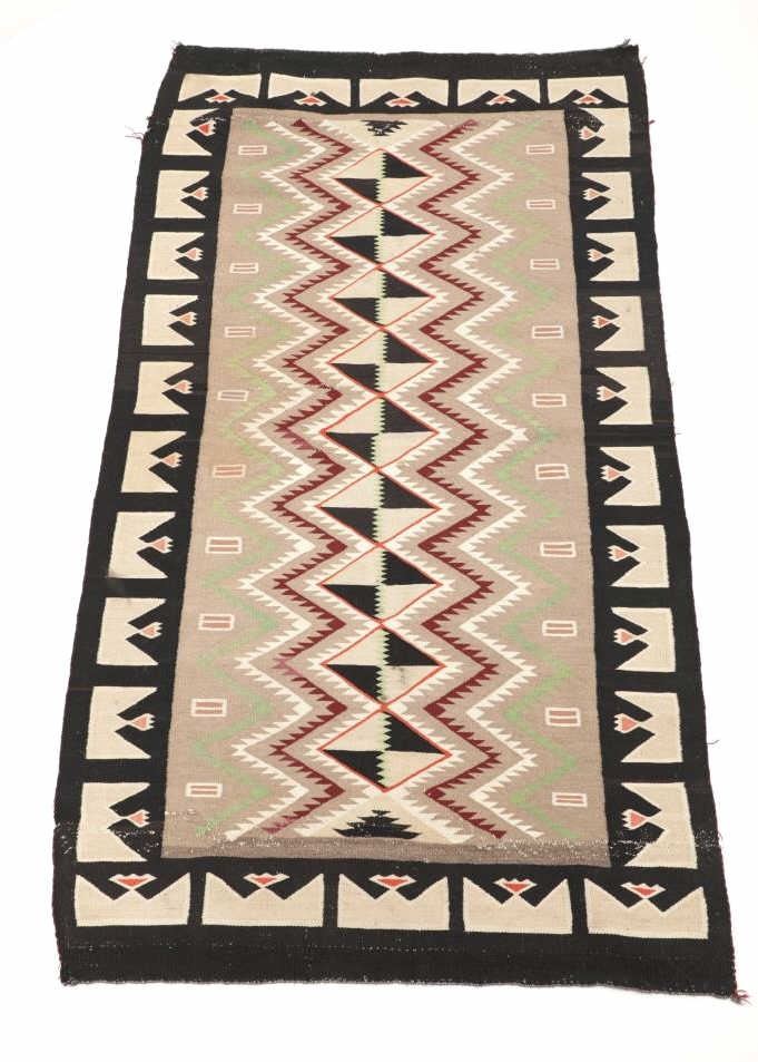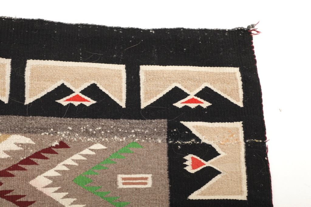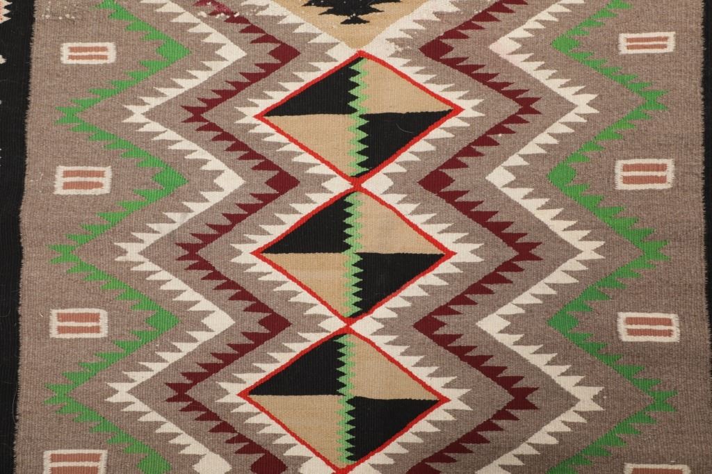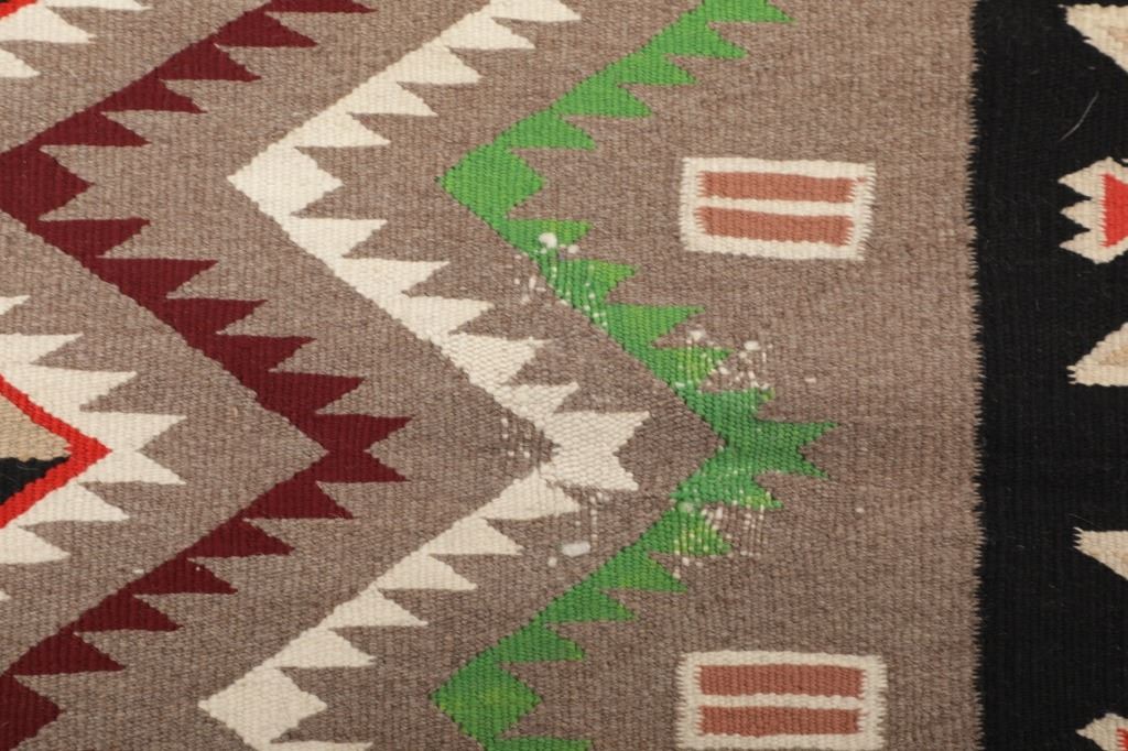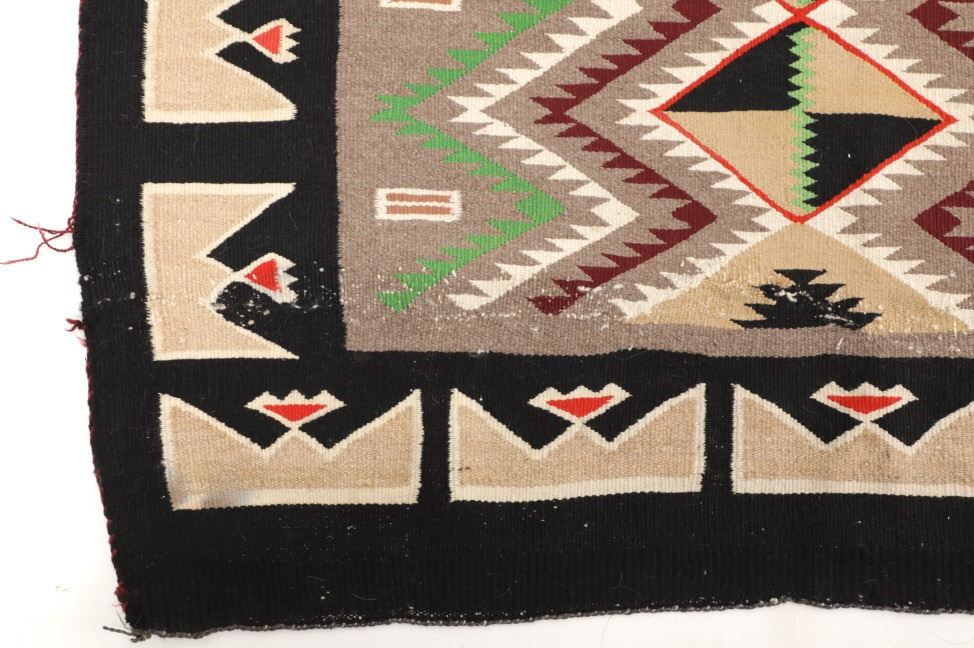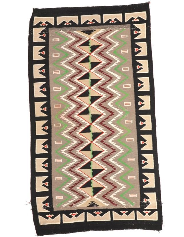 Featured in this lot is this Navajo Teec Nos Pos hand woven rug circa 1930's. The rug shows a wonderfully and professionally crafted wool construction. The rug features stepped decoration with a ventral medallion and shows coloration of light grey, off white, light brown, red, and green. The rug features a Lazy Lines throughout the rug consistent with showing age and authenticity of the rug. Teec Nos Pos is located in the northeast corner of Arizona and rose to prominence in 1905, spinning off of J.B. Moore’s Crystal weaving style. The Teec Nos Pos pattern is widely considered to be the most intricate and detailed of all Navajo rug designs offering a truly exceptional distinct look. The rug was hand woven by skilled weavers and shows bright natural style dyes in a traditional geometric Teec Nos Pos Crystal Pattern. The rug is made in the style, manner and quality craftsmanship of Navajo Weavings, but not made by a Navajo Indian. The condition of this Navajo rug shows some minor repairs and some wear to the fringe but otherwise shows well preserved condition. The measurements of this rug is 81" x 45 1/4".