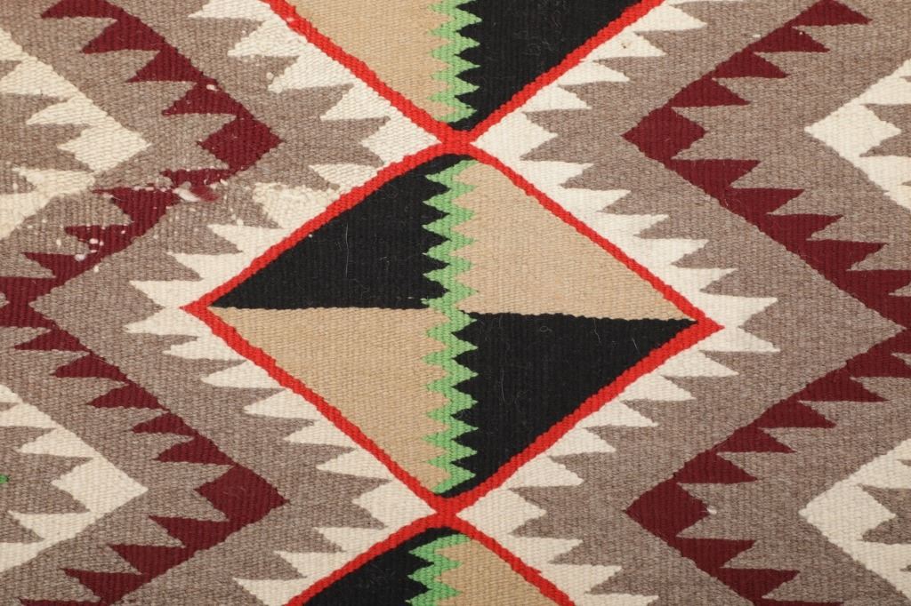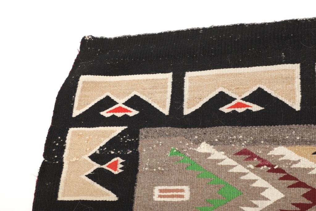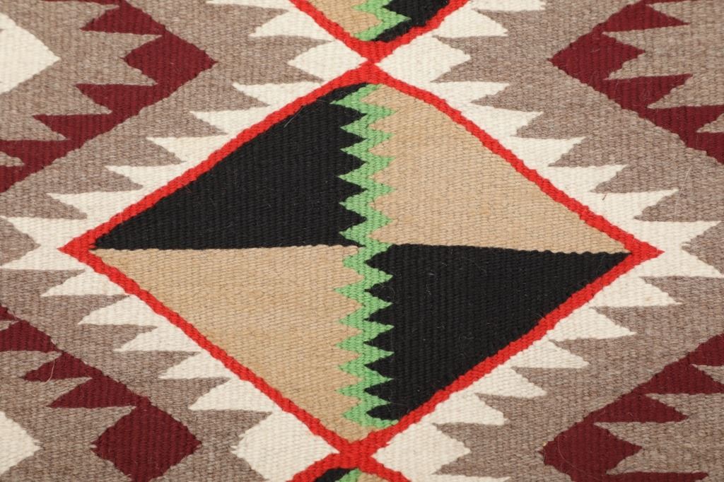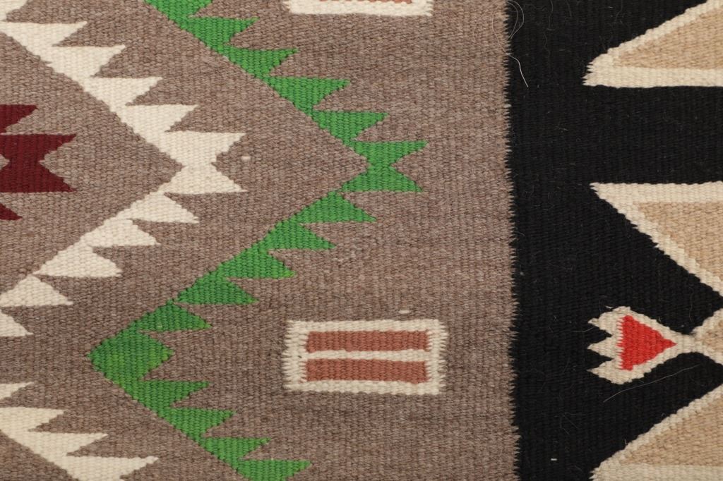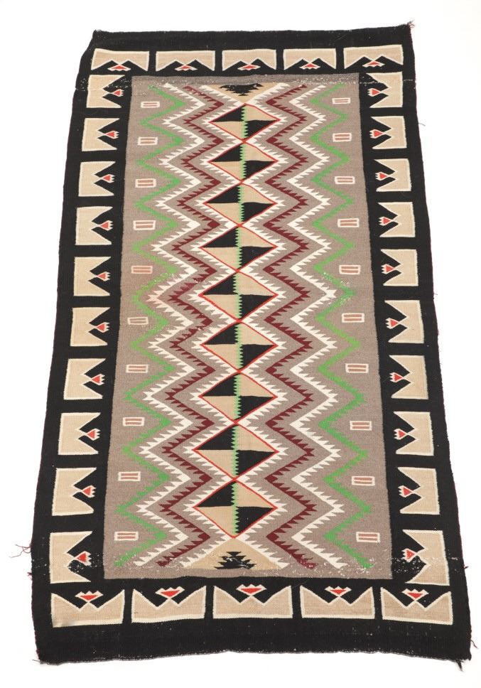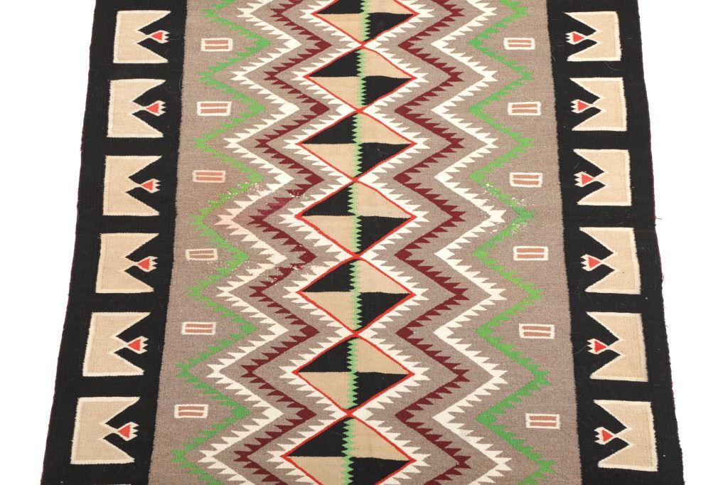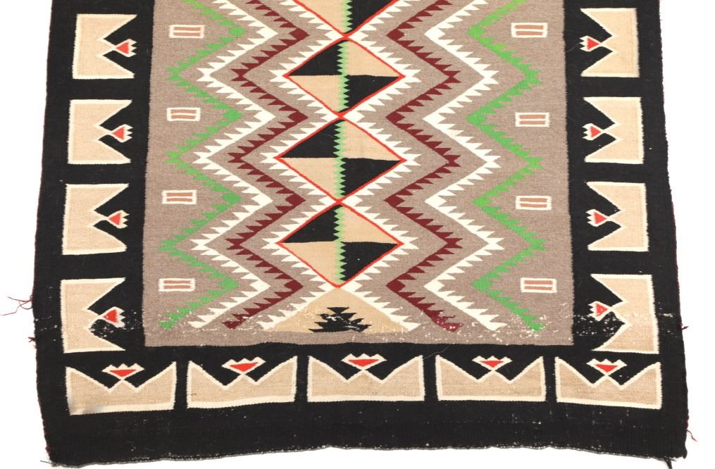 Featured in this lot is this Navajo Teec Nos Pos hand woven rug circa 1930's. The rug shows a wonderfully and professionally crafted wool construction. The rug features stepped decoration with a ventral medallion and shows coloration of light grey, off white, light brown, red, and green. The rug features a Lazy Lines throughout the rug consistent with showing age and authenticity of the rug. Teec Nos Pos is located in the northeast corner of Arizona and rose to prominence in 1905, spinning off of J.B. Moore’s Crystal weaving style. The Teec Nos Pos pattern is widely considered to be the most intricate and detailed of all Navajo rug designs offering a truly exceptional distinct look. The rug was hand woven by skilled weavers and shows bright natural style dyes in a traditional geometric Teec Nos Pos Crystal Pattern. The rug is made in the style, manner and quality craftsmanship of Navajo Weavings, but not made by a Navajo Indian. The condition of this Navajo rug shows some minor repairs and some wear to the fringe but otherwise shows well preserved condition. The measurements of this rug is 81" x 45 1/4".