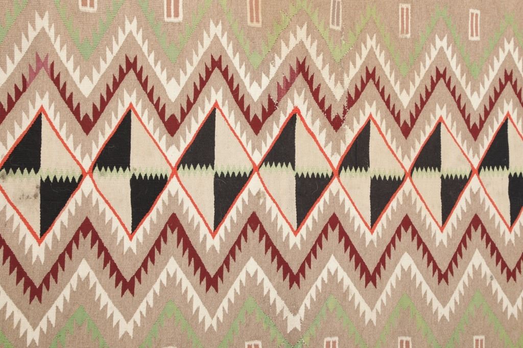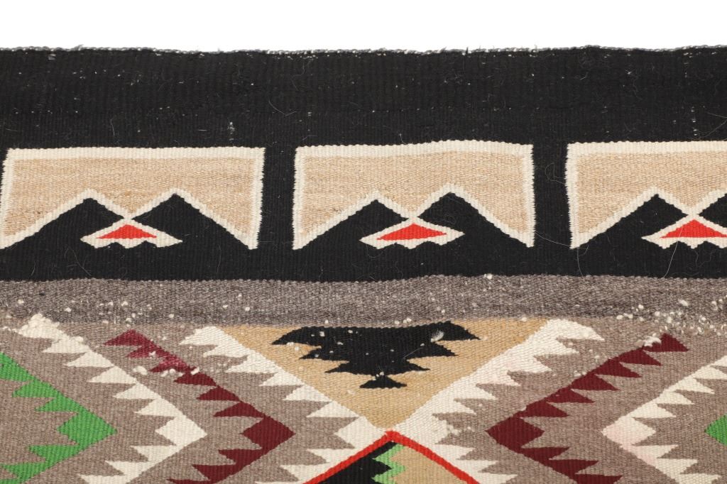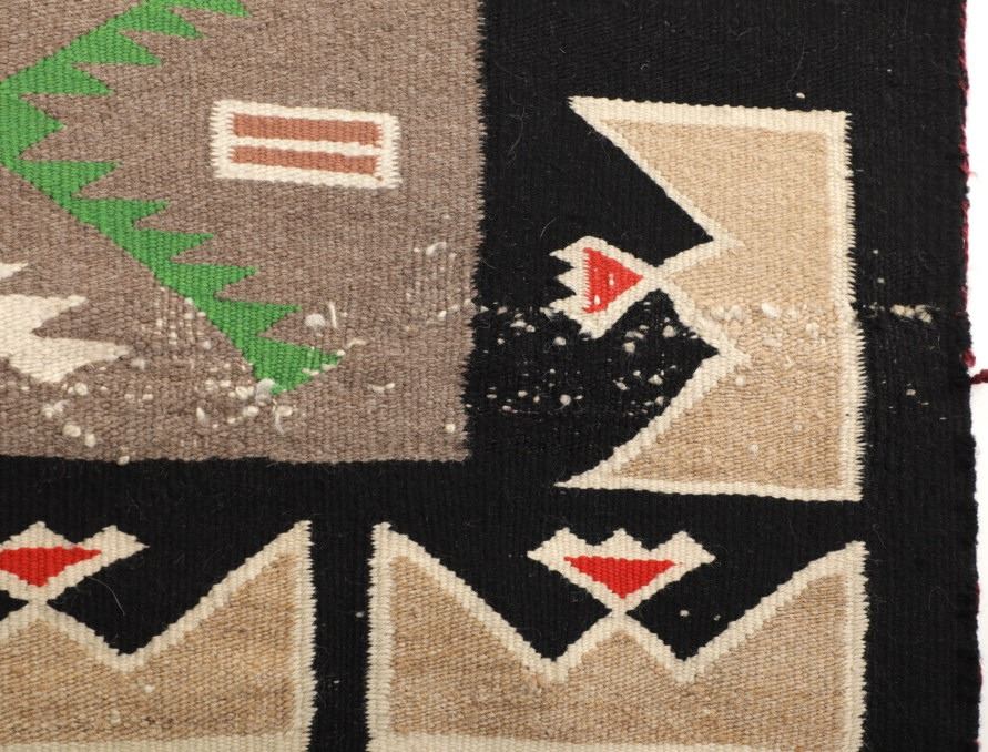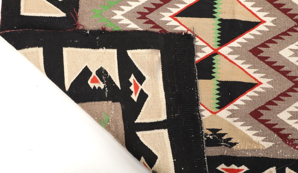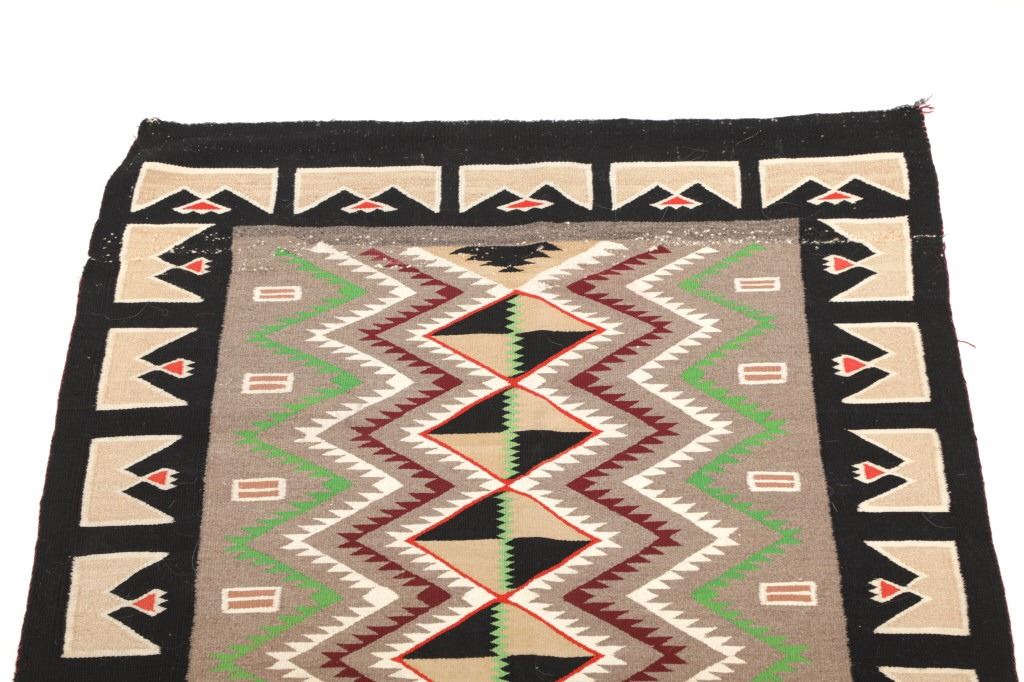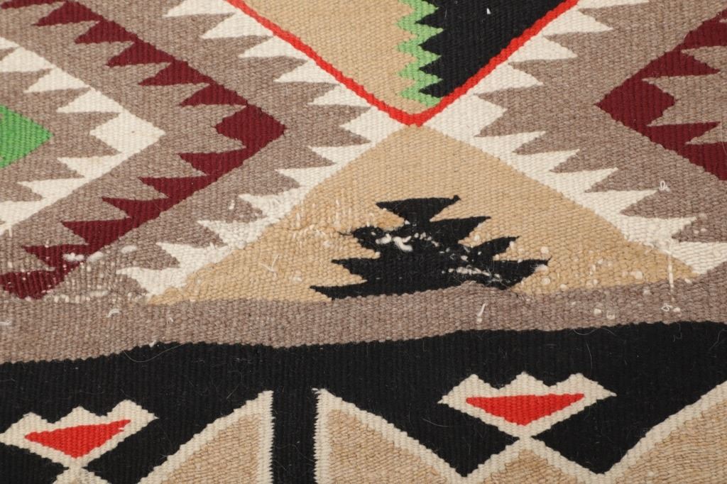 Featured in this lot is this Navajo Teec Nos Pos hand woven rug circa 1930's. The rug shows a wonderfully and professionally crafted wool construction. The rug features stepped decoration with a ventral medallion and shows coloration of light grey, off white, light brown, red, and green. The rug features a Lazy Lines throughout the rug consistent with showing age and authenticity of the rug. Teec Nos Pos is located in the northeast corner of Arizona and rose to prominence in 1905, spinning off of J.B. Moore’s Crystal weaving style. The Teec Nos Pos pattern is widely considered to be the most intricate and detailed of all Navajo rug designs offering a truly exceptional distinct look. The rug was hand woven by skilled weavers and shows bright natural style dyes in a traditional geometric Teec Nos Pos Crystal Pattern. The rug is made in the style, manner and quality craftsmanship of Navajo Weavings, but not made by a Navajo Indian. The condition of this Navajo rug shows some minor repairs and some wear to the fringe but otherwise shows well preserved condition. The measurements of this rug is 81" x 45 1/4".