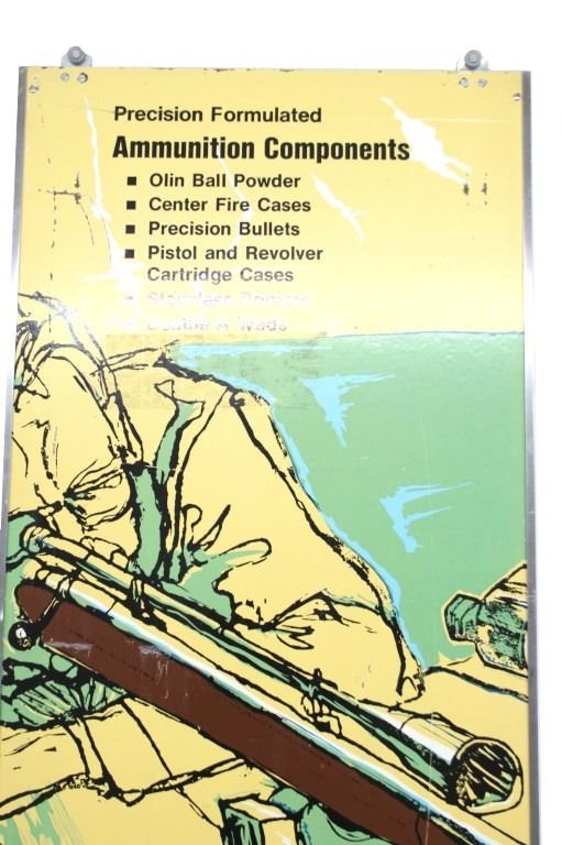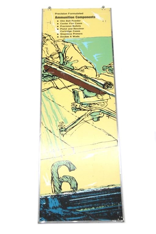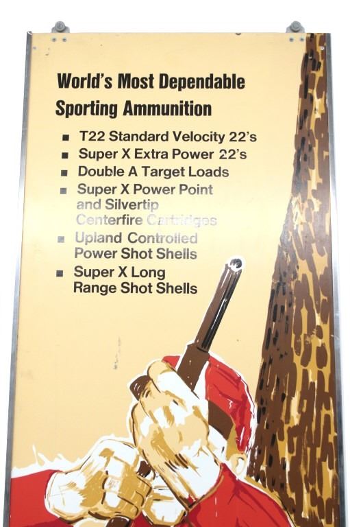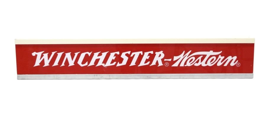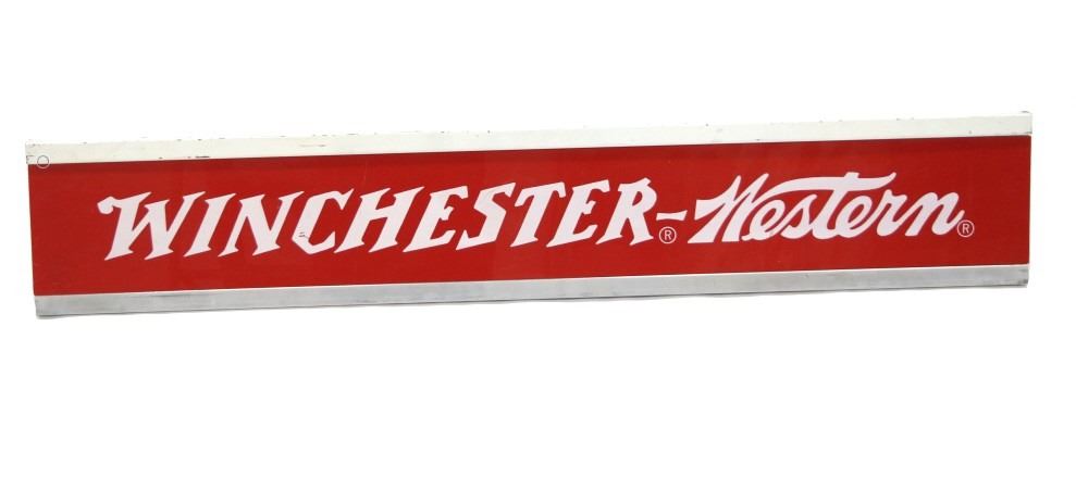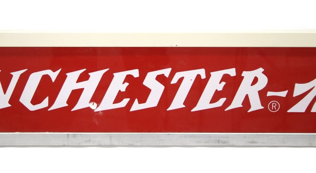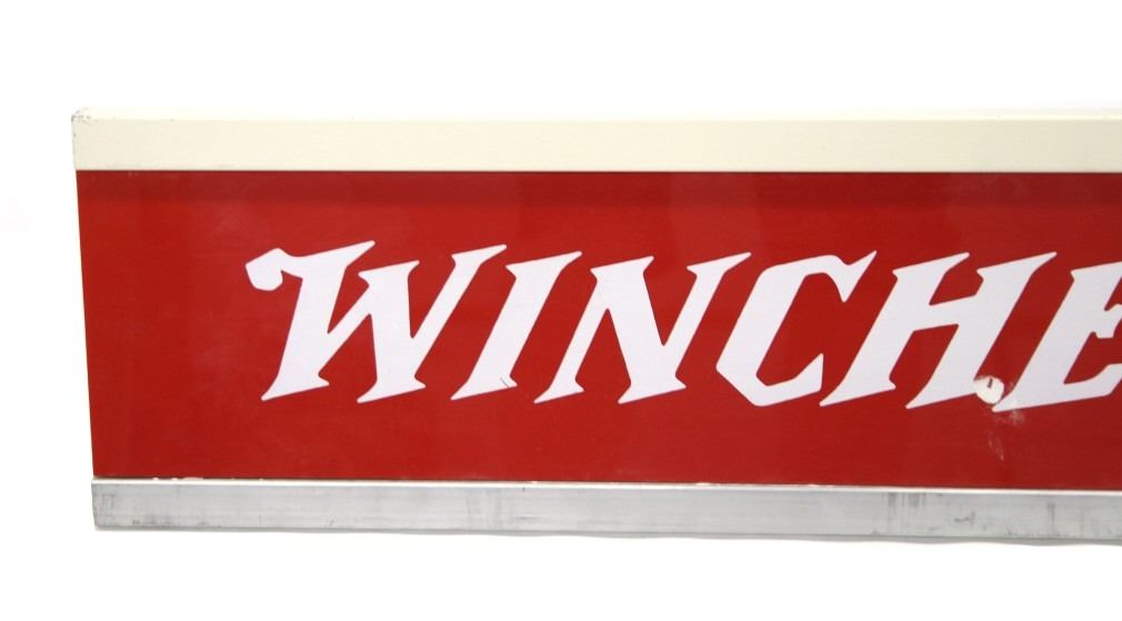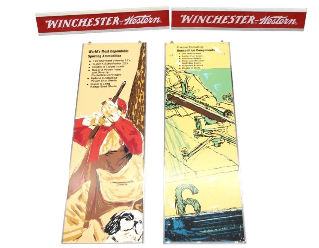 Included in this lot are two (2) Rare Winchester Repeating Arms Company Storage cabinet top-hung sliding doors with separate overhead signs, circa 1935 to 1940. These 22"W x 72"L sliding doors and respective 8"W x 46"L signs would have been part of a dealer's stand alone storage cabinet, functioning the same as closet sliding doors on wheel casters. Each sign slides over the casters, mounting securely on the top frame of the cabinet. Each panel has separate descriptive language about Winchester ammunition,