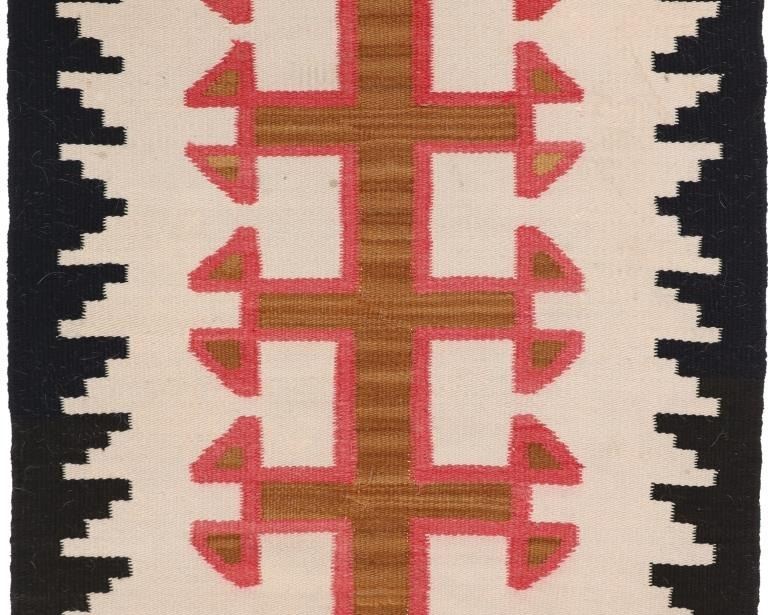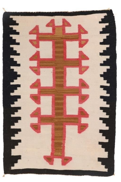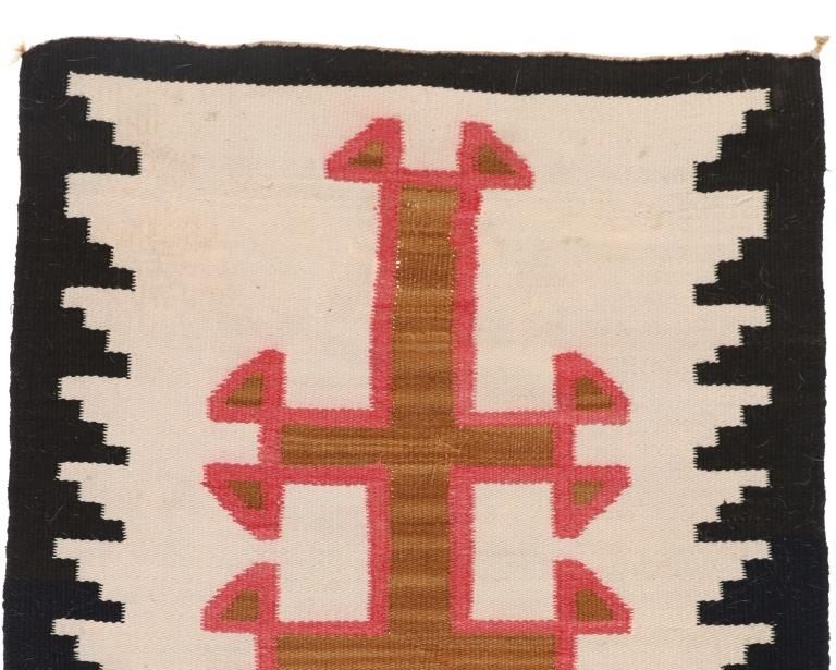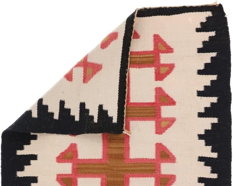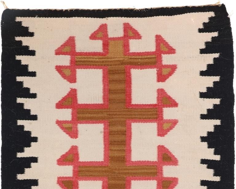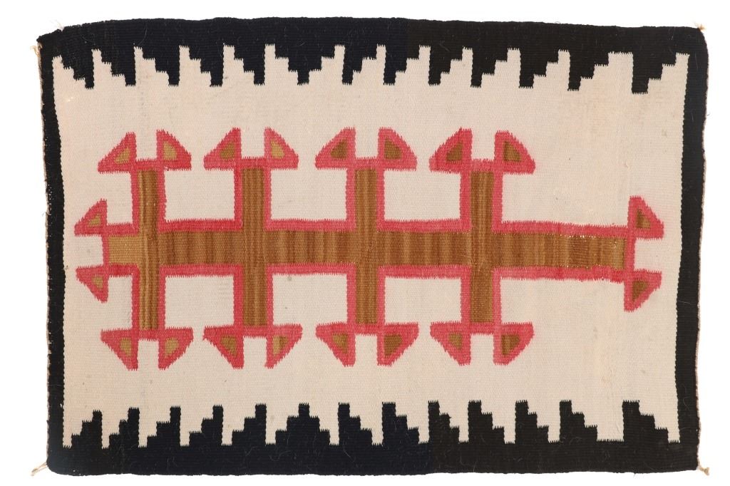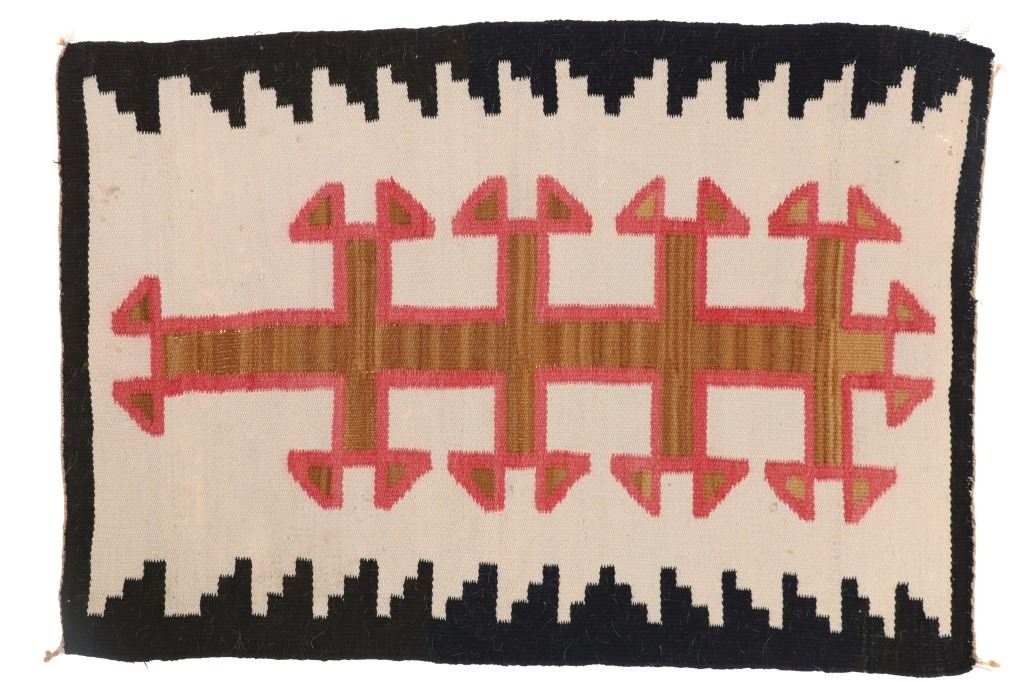 The lot features a circa 1940-1950's Navajo Regional Klagetoh wool weaving with unique cross design from a private-Bozeman, Montana collection. The piece exhibits a woven wool rug with visible lazy lines done with a large cross like unique design, a variation seen on other Klagetoh rugs done in brown / tans and red on a white / cream background with black stepped border. The rug is well kept with soft wool and only slight wear, no major damages, most of the edge in nice condition with small loss. Measures 41-inches by 28-inches.