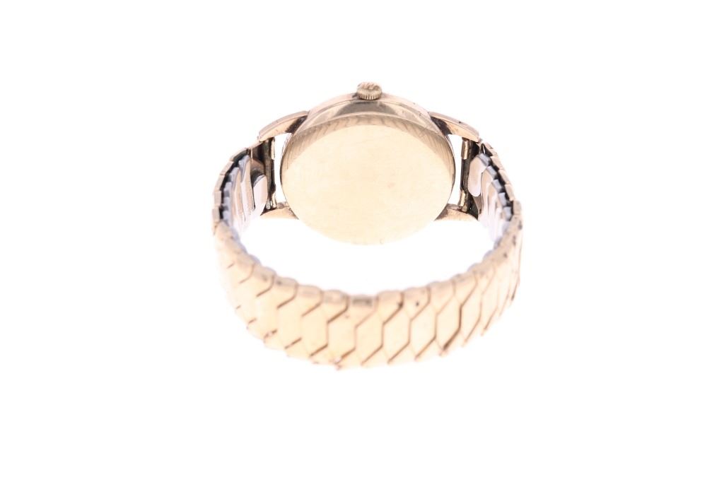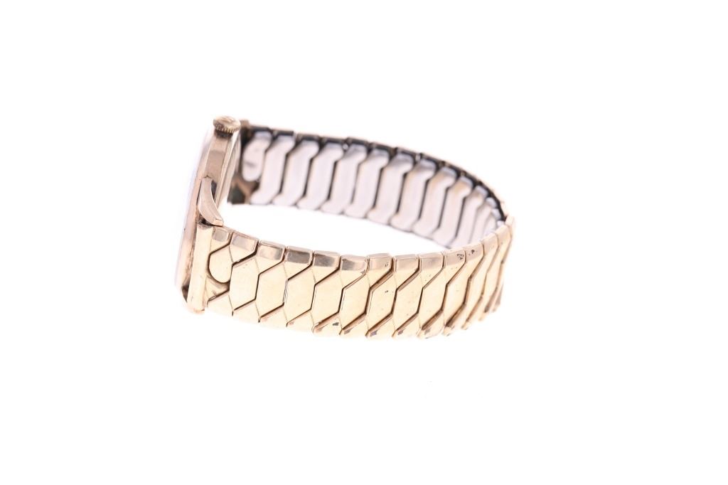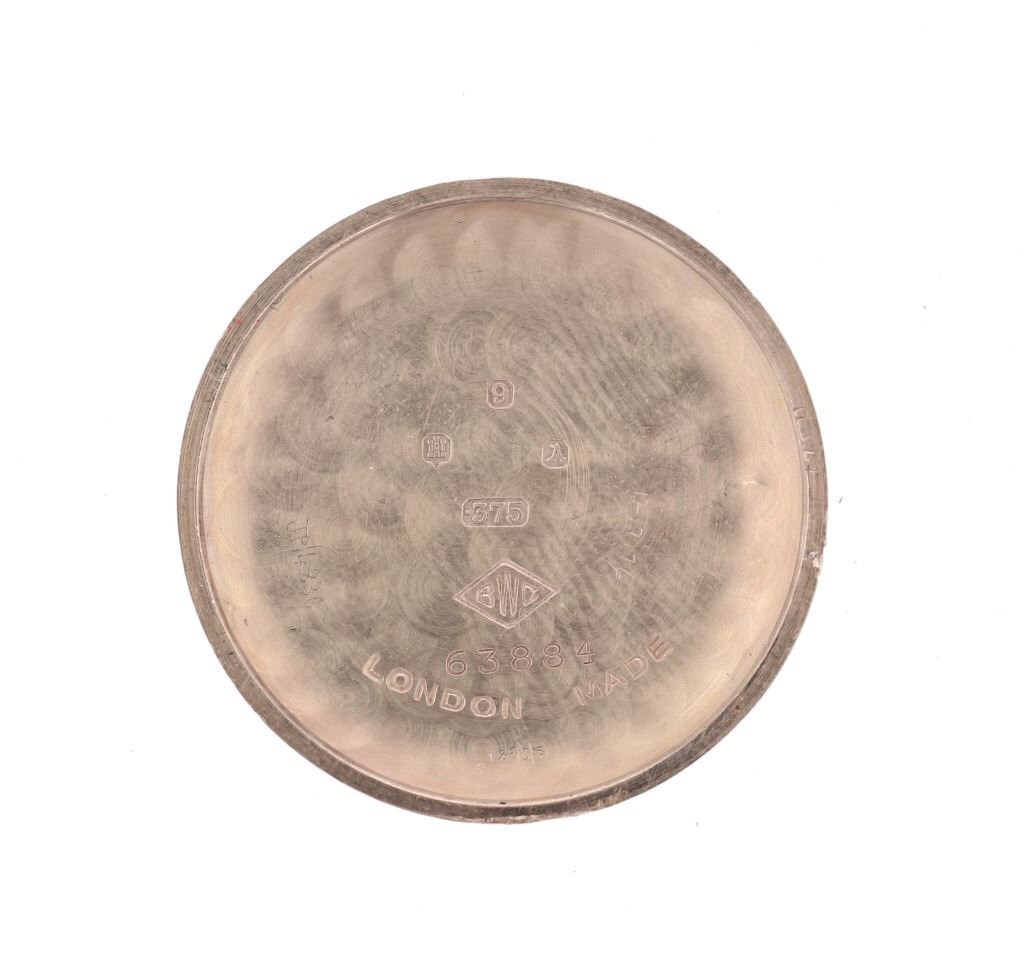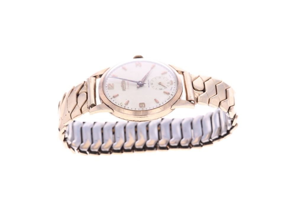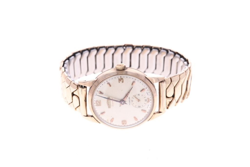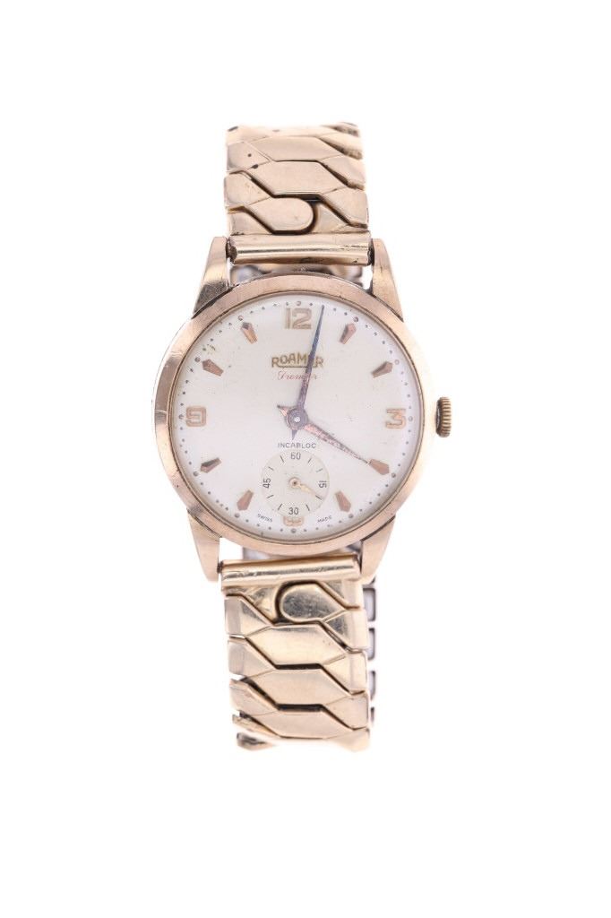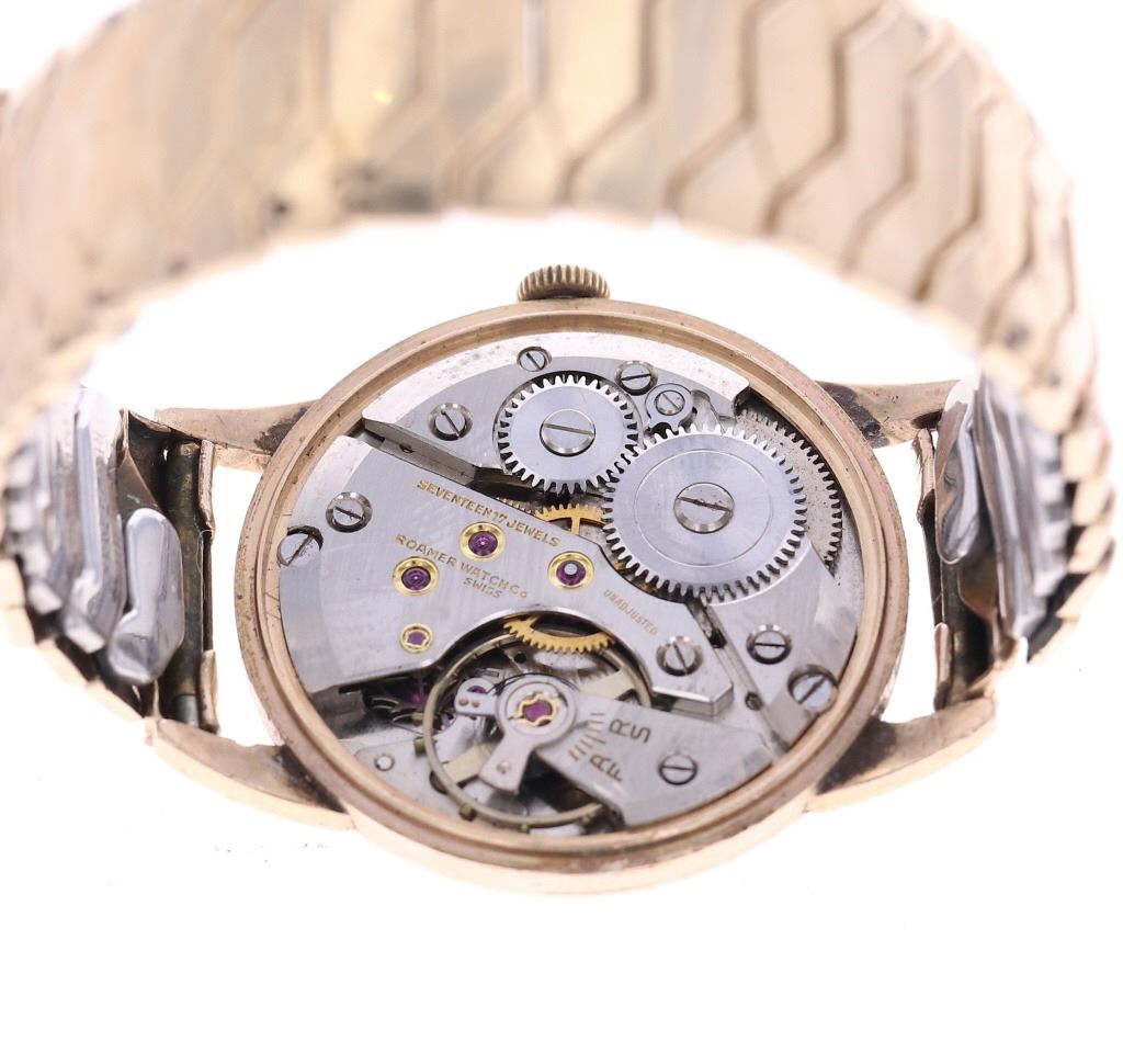 This is an original Roamer Premier Swiss made watch in a solid 9 karat yellow gold case dating to circa 1956. The watch case is marked BWC, likely British Watch Case Company and shows the .375 gold stamped for 9 karat / carat gold along with the Edinburgh British hallmark and "A" date mark placing the date of the watch at 1956. The watch movement is Swiss made Roamer Watch Co. with a manual wind seventeen 17 jewels movement. The face shows gold pointed indices with the numbers 12 / 3 / 9 all in gold with the dial marked ROAMER Premier at the center and SWISS MADE on the bottom. Below the case hardened style hands is the seconds dial marked above with INCABLOC and shows the small sweeping seconds hand. The watch shows an expandable 1950's period band which is marked Excalibur Reg. 860662 1/10 12 CT. R. GOLD / FT Model "50" Made in England 072, being thick 1/10 rolled 12 karat yellow gold. The case back is also marked on the inside London Made 63884. The watch winds up and works, appearing to keep good time. Beautiful, rare 9 karat solid gold cased swiss made watch with fantastic vintage style, could be worn by both a man or woman, truly a stylish piece.
