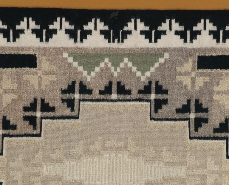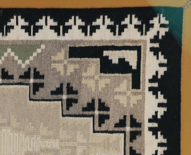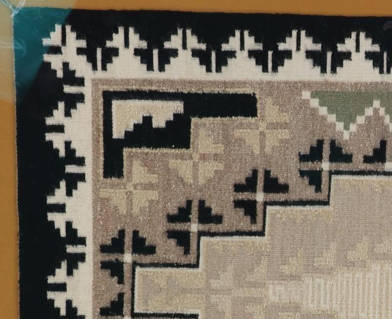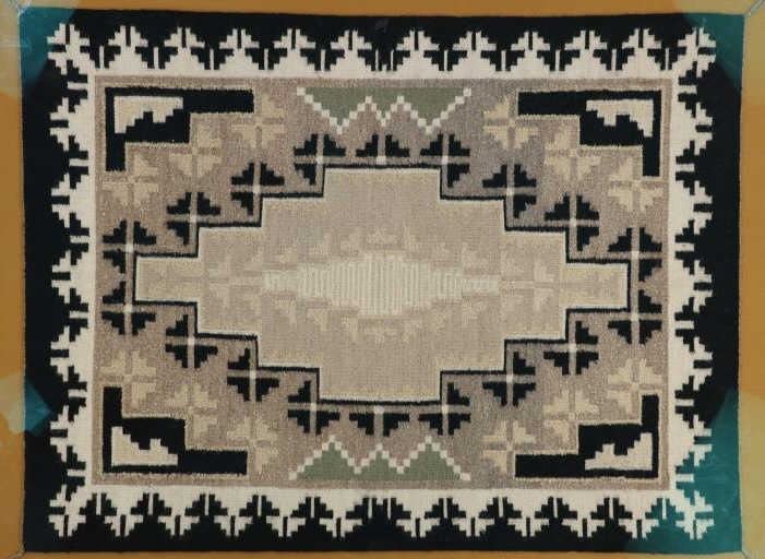 This is a fabulous, finely woven Navajo Two Grey Hills wool weaving, the rug dates to circa 1960-1970’s from the ex-Dr. Martin Gingras collection. The rug exhibits a classic Two Grey Hills Navajo rug with very tightly woven fine wools showing colors of black, cream / white, grey / tans / browns, yellow and light sage green. The Two Grey Hills style was started in 1914, by George Bloomfield and Ed Davis at the Toadlena and Two Grey Hills Trading Post. These Navajo rugs are characterized by natural browns, tan, gray, ivory, white, and black. It is not unusual for the blacks to be oven-dyed. The patterns usually have a central diamond motif and intricate patterns. The Two Grey Hills weavings are noted for their high quality construction. The trading post is located in northwest New Mexico, south of Shiprock and northeast of the Crystal area. This is a rare example with a light sage green coloring. For an example of Two Grey Hills from the second-half of the 20th-century with a light sage green see examples by Navajo weaver Gladys Shepard, who was most known for their Burntwater examples. The rug appears to have handspun wool with natural vegetal dye and aniline dyes with a very tight weave that appears well kept. The rug was examined in the frame. The framing is professionally done with antiglare glass. Provenance: From the ex-collection of Dr. Martin Gingras, Rochester, New York; ex-Hindman Freeman’s auction. Frame measures 45.25-inches by 36-inches and 1-inch thick, visible rug area totals 41.5-inches by 31-inches including fringes, body of rug is 37-inches by 28-inches.