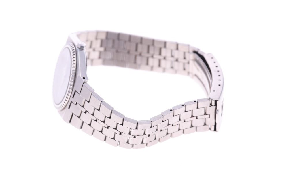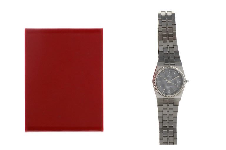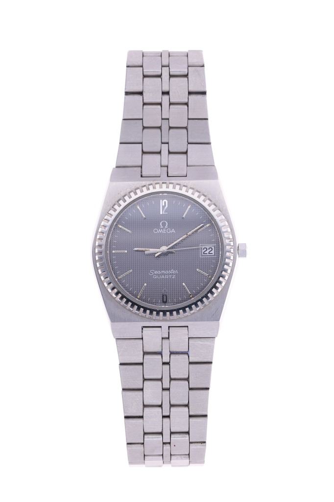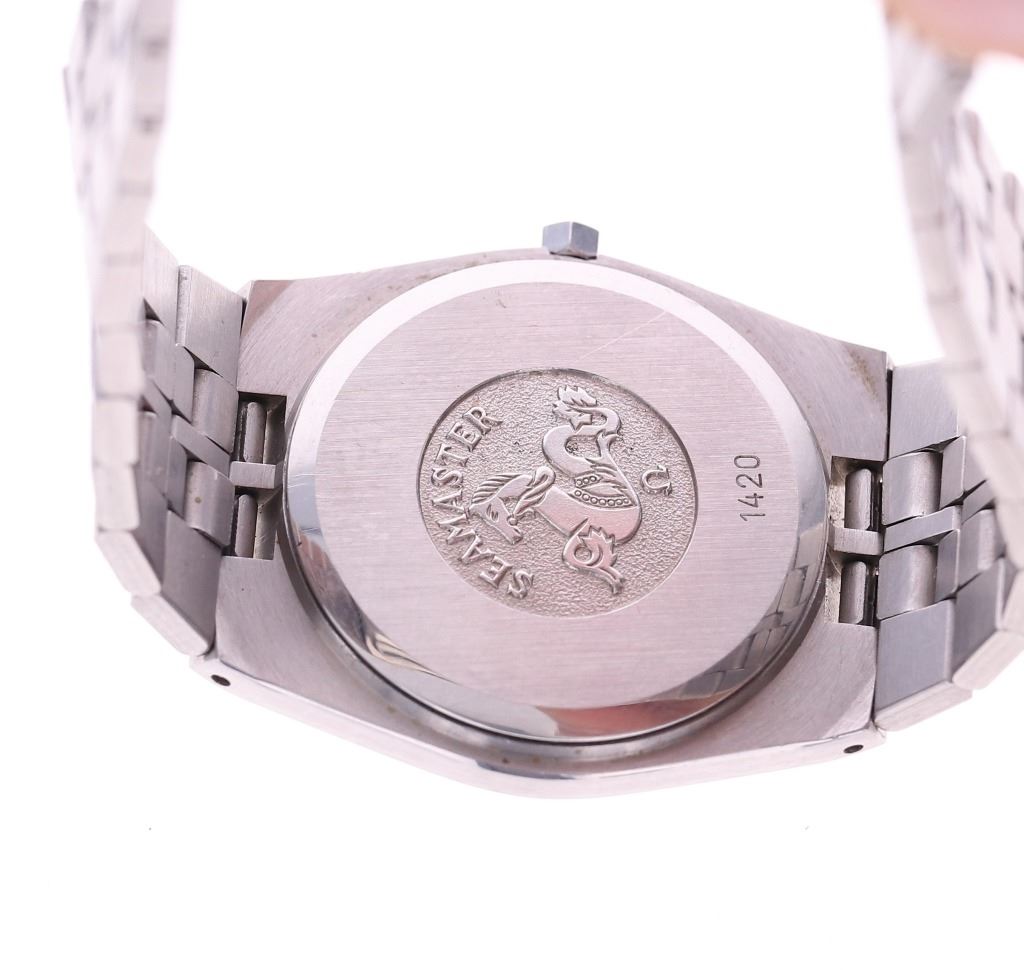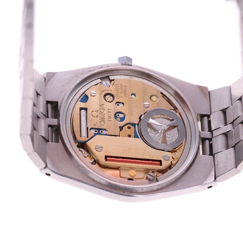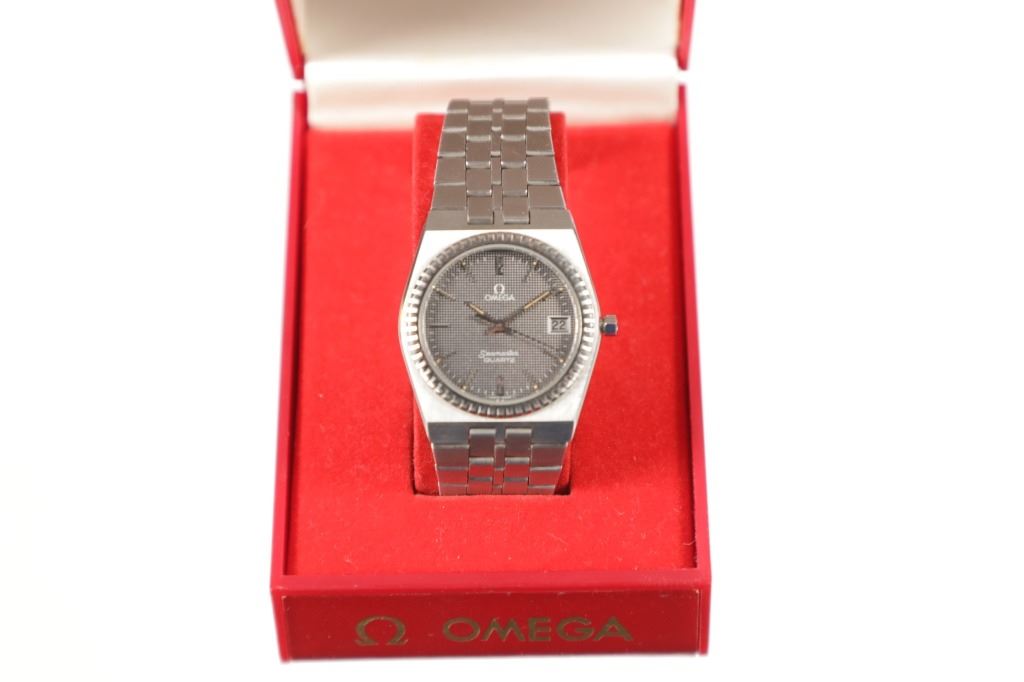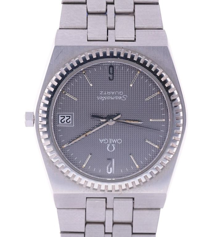 This is an original circa 1968 Swiss made Omega Seamaster Quartz Caliber 1420 Reference number 196.0233 / 396.0931 wrist watch in the original box. The watch has a caliber 1420 7 Jewels Omega Watch Co. Swiss made movement with a serial number of 26153858 dating the watch to circa 1968. The watch shows a rare grey or silver waffle dial (similar to a Audemars Piguet Royal Oak) with silver hash indices, with a 12 at top and 6 at bottom having a date window at 3, Omega logo and name at the top and Seamaster Quartz below the silver hands. The watch has sapphire crystal surrounded by a fluted ridged stainless steel bezel. The watch also has the original stainless steel Omega 1387/1/398 bracelet with Omega marked clasp. The back of the case is marked Seamaster with the famed Omega Seahorse, the Omega symbol below as well as 1420. The inside of the case back is marked with the Omega symbol, Omega Watch Co. inside a triangle above FAB. SUISSE SWISS MADE MLB 196.0233 / 396.0931 and at the top Acier Inoxydable. This design of watch having the raised stainless bezel with angular case with integral bracelet is so popular that in current years Tissot created the Tissot PRX in its nearly identical form to this Omega Seamaster Cal. 1420. The design of this Omega is very similar to that of the Vacheron Constantin 222. The watch comes in its original red Omega box with gold lettering. The watch has a new battery and appears to be working. There are a few expected wear scuffs, but mostly well kept. This exact variation of the Omega Seamaster is highly collectible with the only identical examples found being sold for between $1,750 and above. The watch fits a large wrist. Box measures 3 5/8” by 2.75” by 2 7/8”.