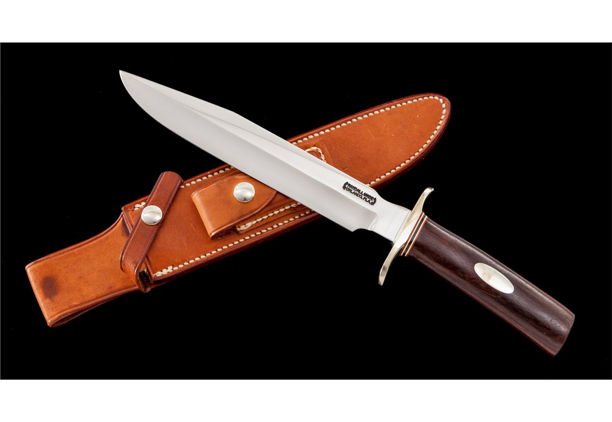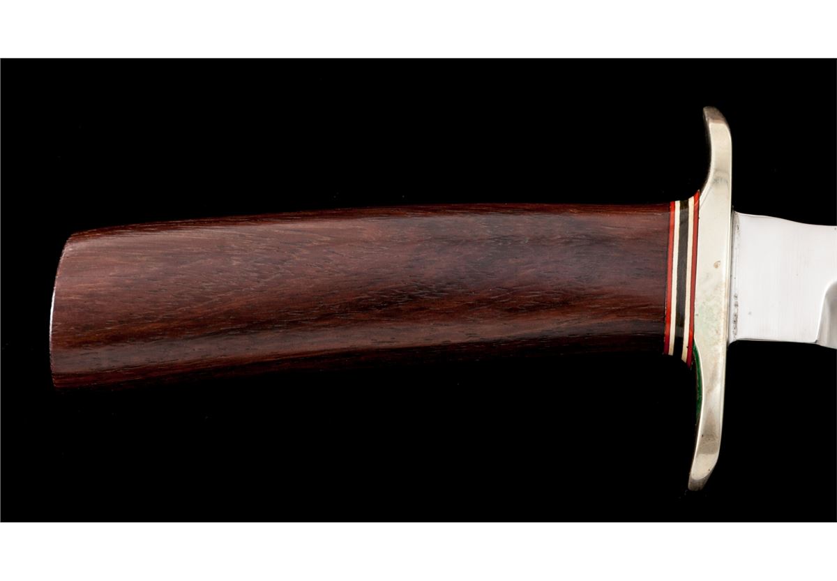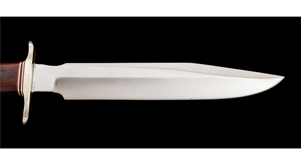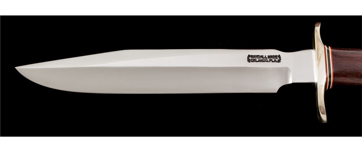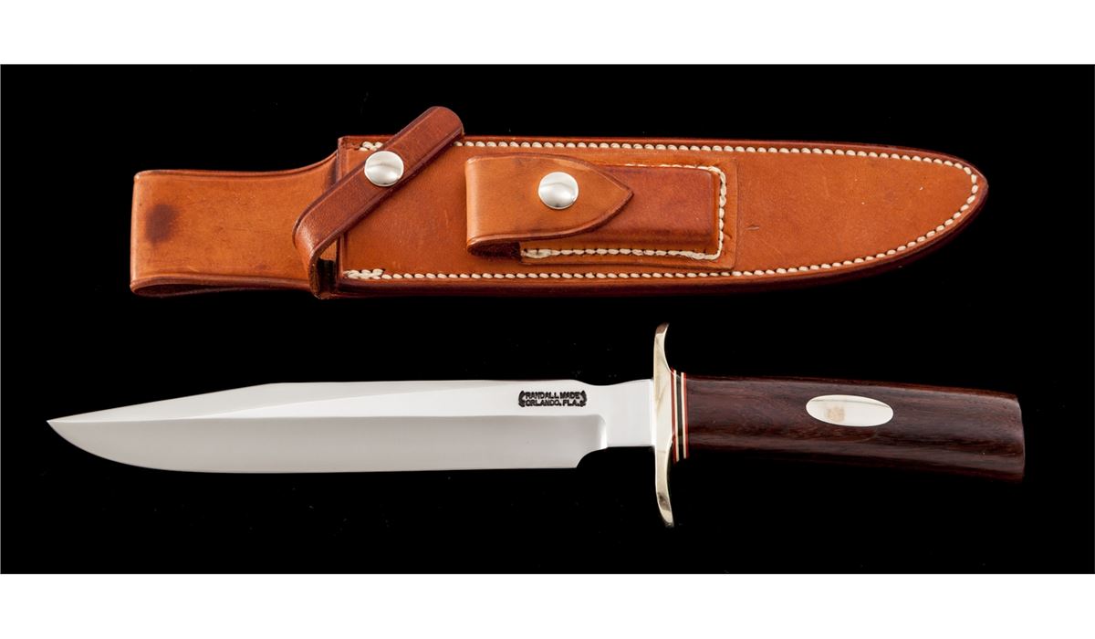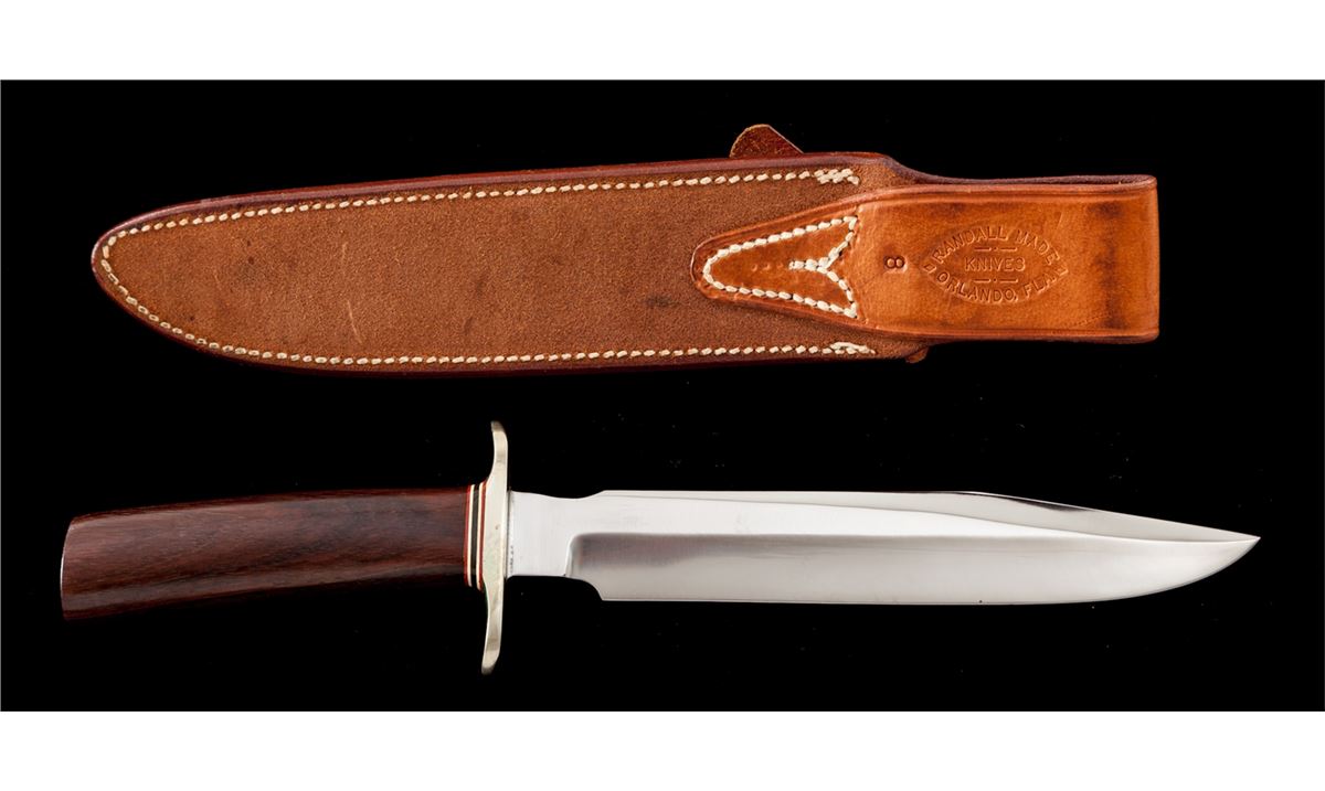 Circa 1970s Randall Model 1 ''All Purpose Fighting Knife'', 8'' blade marked ''RANDALL MADE/ORLANDO, FLA.''; 12-3/4'' overall length, wood handle with blank inlaid nickel silver shield, nickel silver full guard, with five multi-colored spacers (four thin and one larger dark blue/gray center spacer). Johnson roughback sheath stamped with the ''Randall'' football shaped logo and ''8'' on back side of belt loop, smooth snaps, with unmarked salmon colored sharpening stone. Condition is fine to near excellent overall. Blade retains the original edge and shows no signs of use. Guard with moderate discoloration and toning due to prolonged contact with leather sheath. Handle with moderate impressions and marks from handling. Sheath with light scuffs and scratches; stitching and seams remain tight. Sharpening stone is unused with small amounts of verdigris present. Est.: $500-$700. (Ian Shein estate)