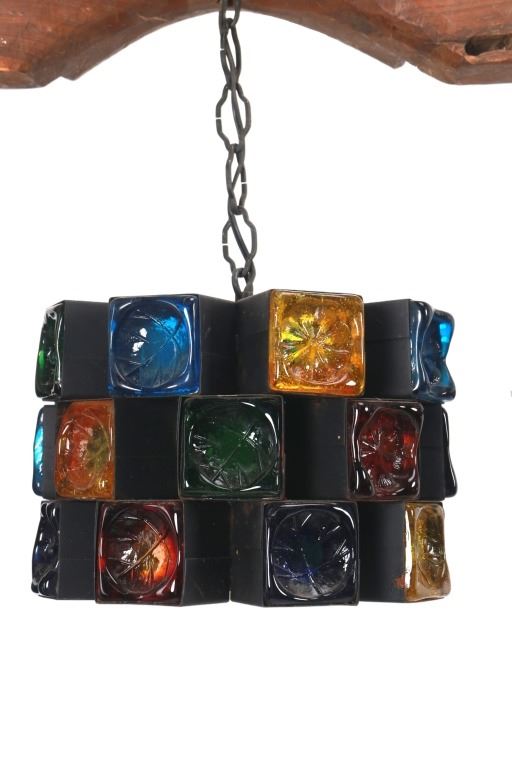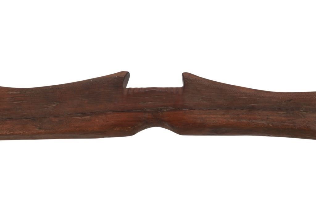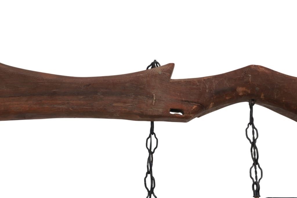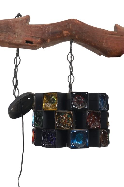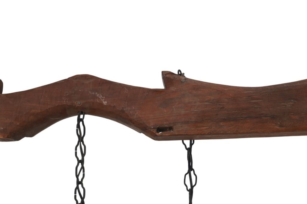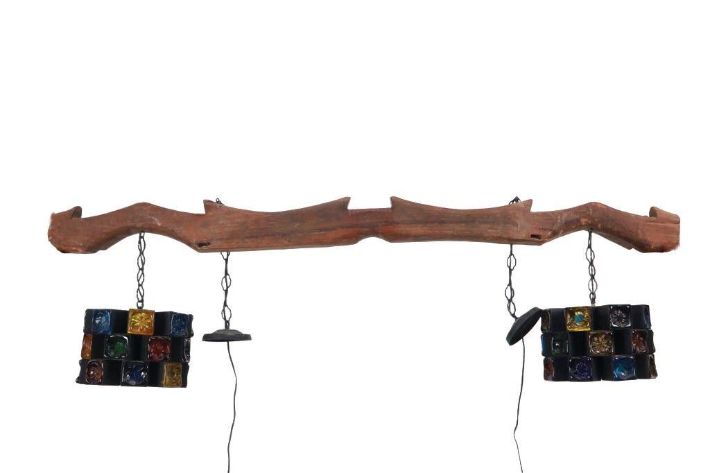 Featured in this lot is this custom Guatemalan ox yoke ceiling light circa 1973. Provenance: Collector acquired the Ox yoke from a farmer in Guatemala for $35 in 1973 and contracted the custom light fixture from Guatemalan bottles, being shaped and blown into the piece we see here. The light fixture features a wonderfully and professionally crafted Guatemalan ox yoke, metal, and shaped and blown Guatemalan glass construction. This is a ceiling light with two mounts that support the yoke which supports the lamps. The condition of this Guatemalan custom overhead light is in well preserved condition with some patina adorning the fixtures themselves but otherwise shows a well preserved overall condition. The measurements of this ceiling light fixture 66 1/2" x 10 3/4" x 14 1/2" (These measurements are for shipping). The collective weight of this ceiling light is