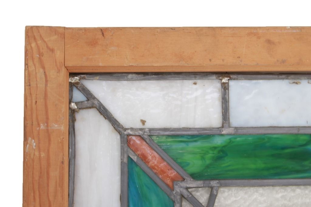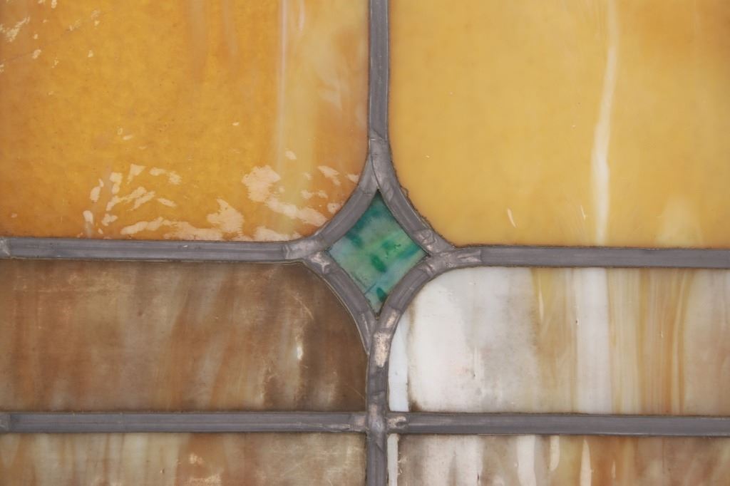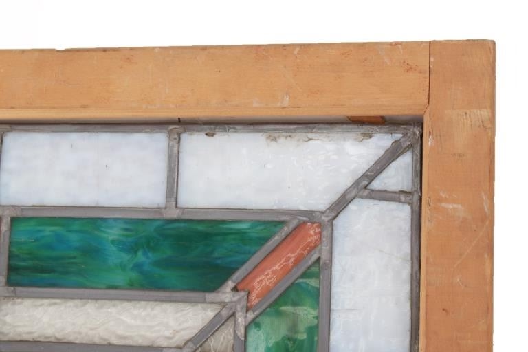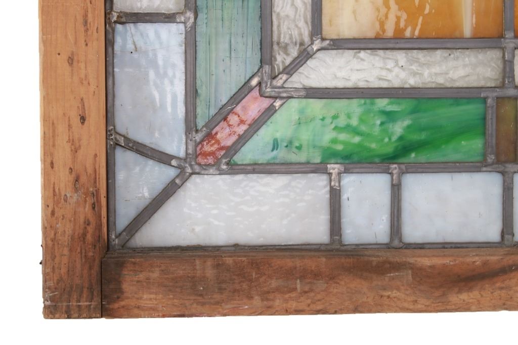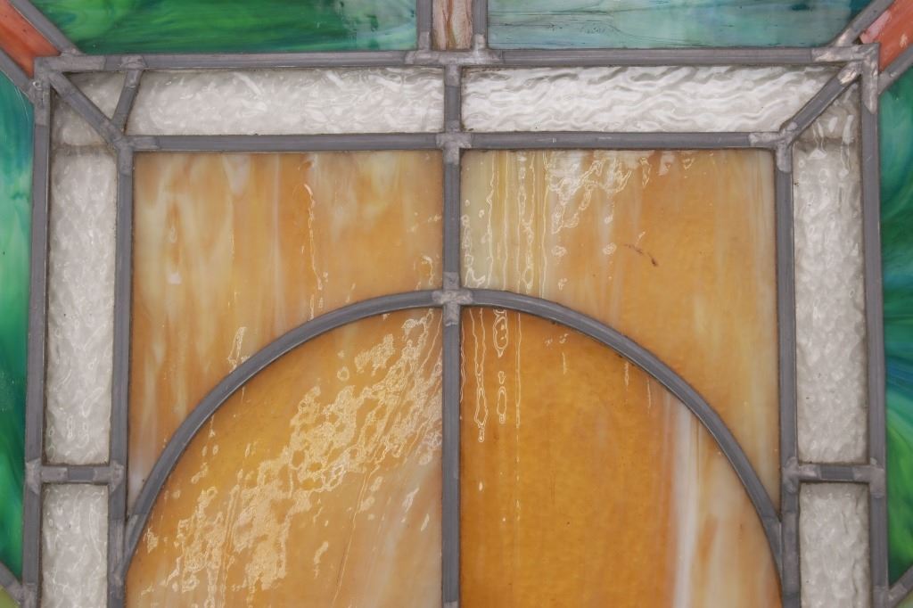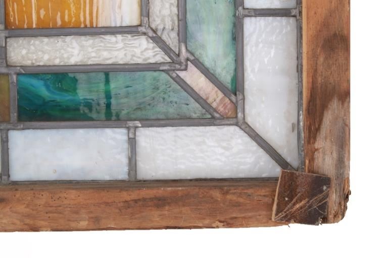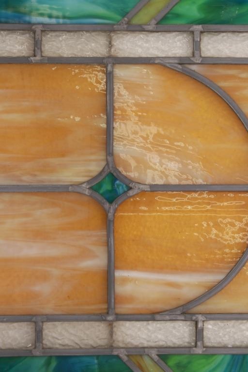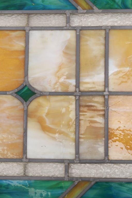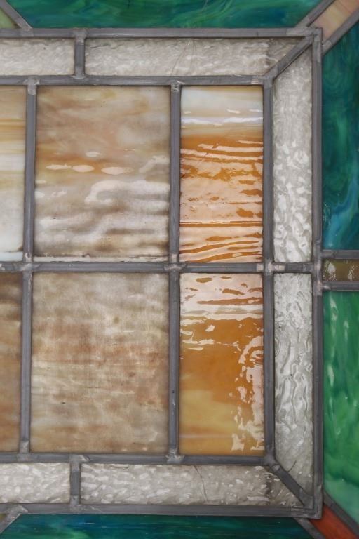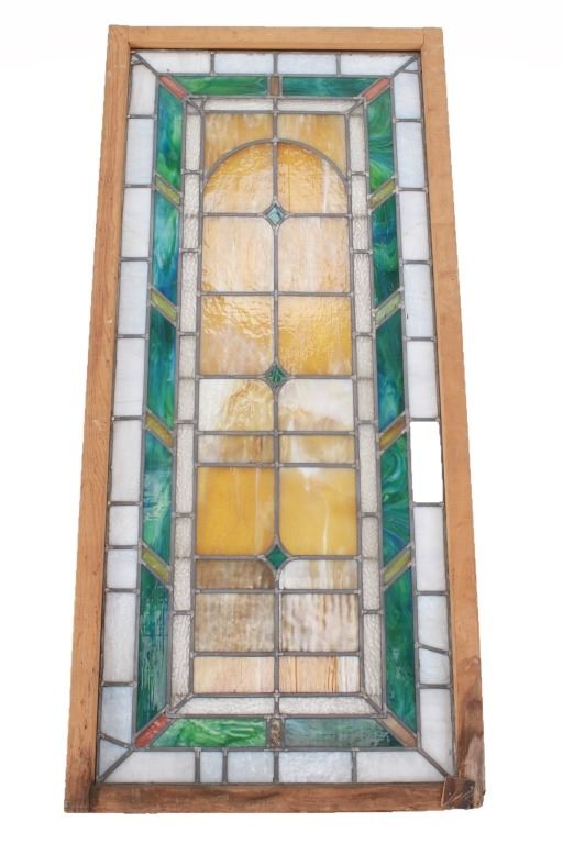 Featured in this lot is this Montana stained glass church window circa 19th century. The papal window shows a wonderfully and professionally crafted stained glass and lead construction with a wood frame to keep it together. The glass window shows segments of slate and stained glass with coloration of off white, green, and yellow with brown. The depiction is of a bordered doorway with layers and the glass is textured with a bubble feeling to the texturing. The condition of this stain glass church window is preserved with some severing of the lead seam and the glass and pushed in segments of the stain glass. The measurements of this stain glass window is 72" x 31 1/8" x 1 1/4".