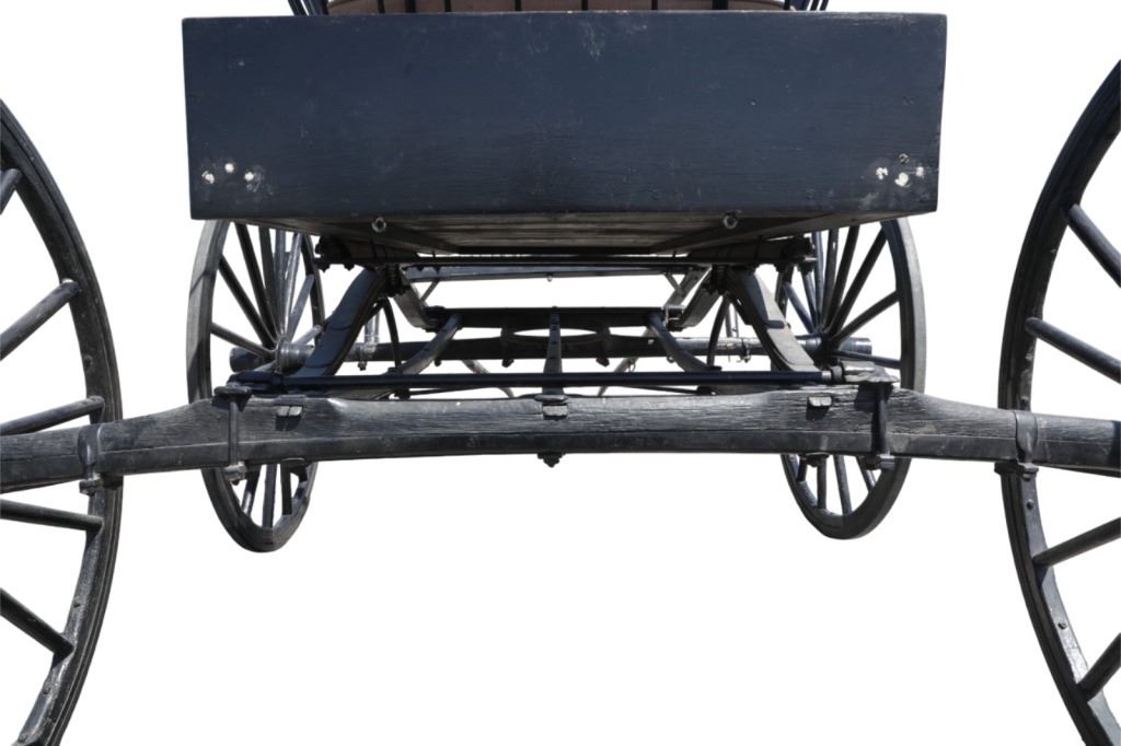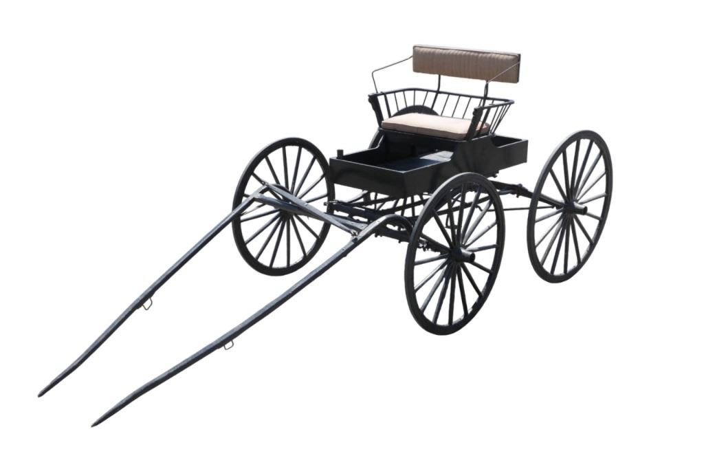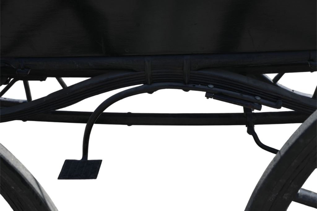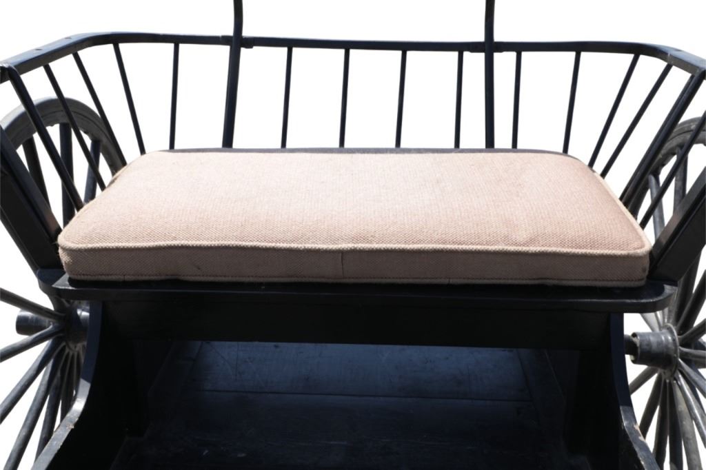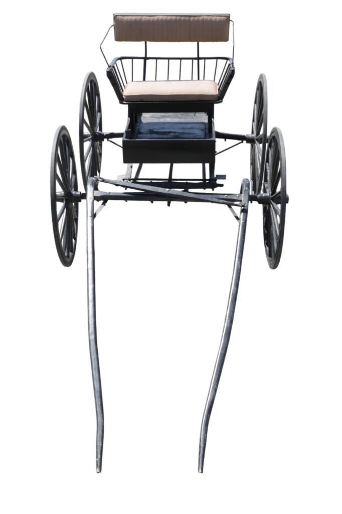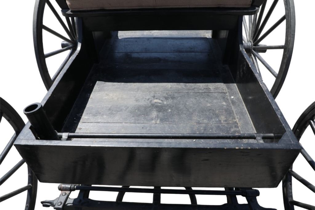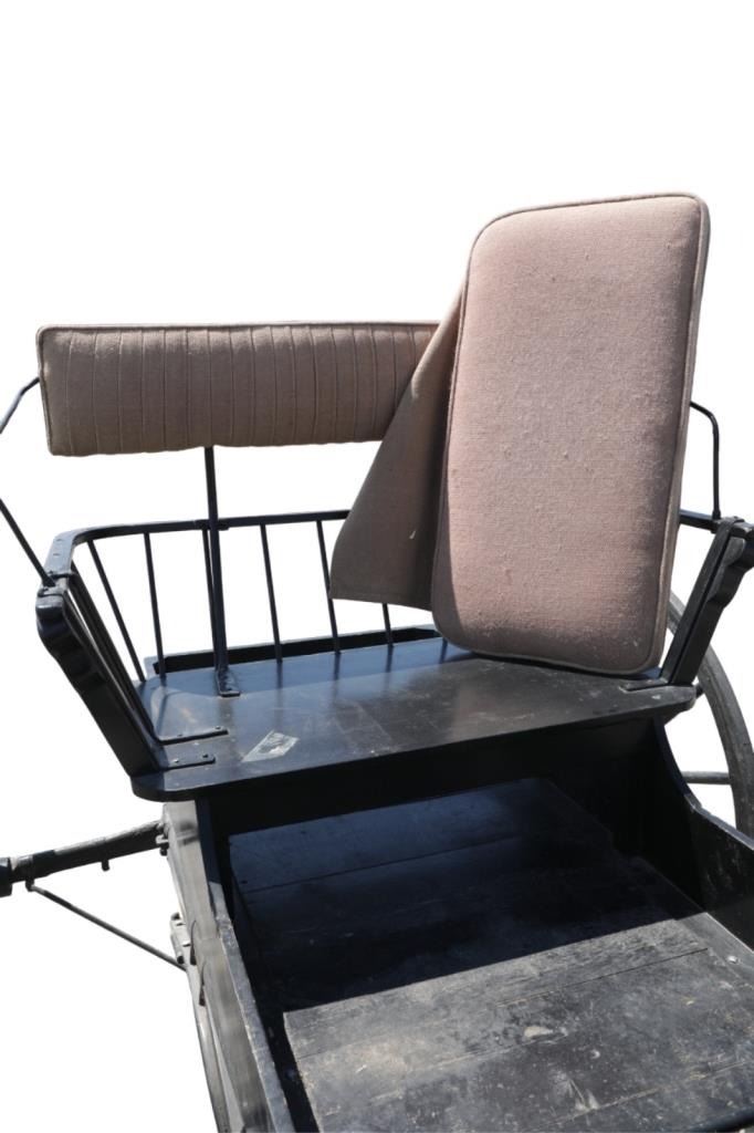 Featured in this lot is this iconic five spring streamline carriage circa 19th century with restoration. The carriage is wonderfully and professionally crafted wooden and iron construction that shows black lacquer finish and preserve layer to the wrought iron implements. This is a four wheel horse drawn streamline carriage made for speedy assembly and used for speedy transportation. The five spring design is iconic for being much smoother than carriages with less springs due to the condition of roads and made them much more desirable for transportation of goods and personnel. This carriage comes complete with the original yoke shown present with complete restoration consistent with the carriage itself, although the D-Clip shown is modern, the rest of the construction and implements would have been originally constructed in the 19th century when the carriage was made. The seat on top shows an upholstered and removable cushion with a seat back and some slight storage in the back for amenities or luggage. The carriage features step down sides with wrought iron framing parts possibly custom forge made due to the lack of a makers mark. The condition of this of this carriage is well preserved with some weathering wear consistent with age and use with the yoke showing similar condition but otherwise shows minimal oxidation to the springs or other implements of the carriage and shows a well preserved overall condition. The measurements of this carriage is 67" H x 172" L x 71 1/2 W. The collective weight of this carriage is