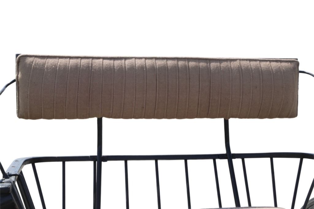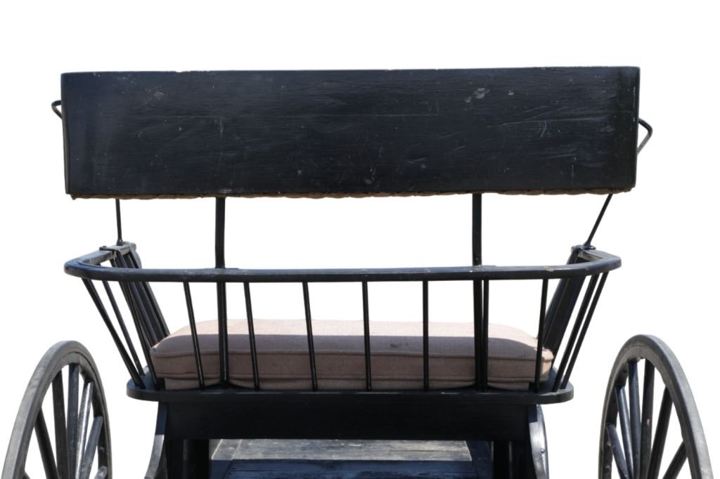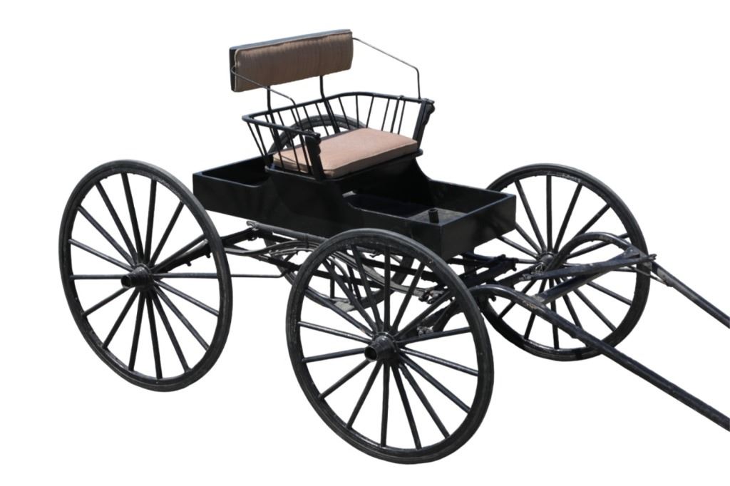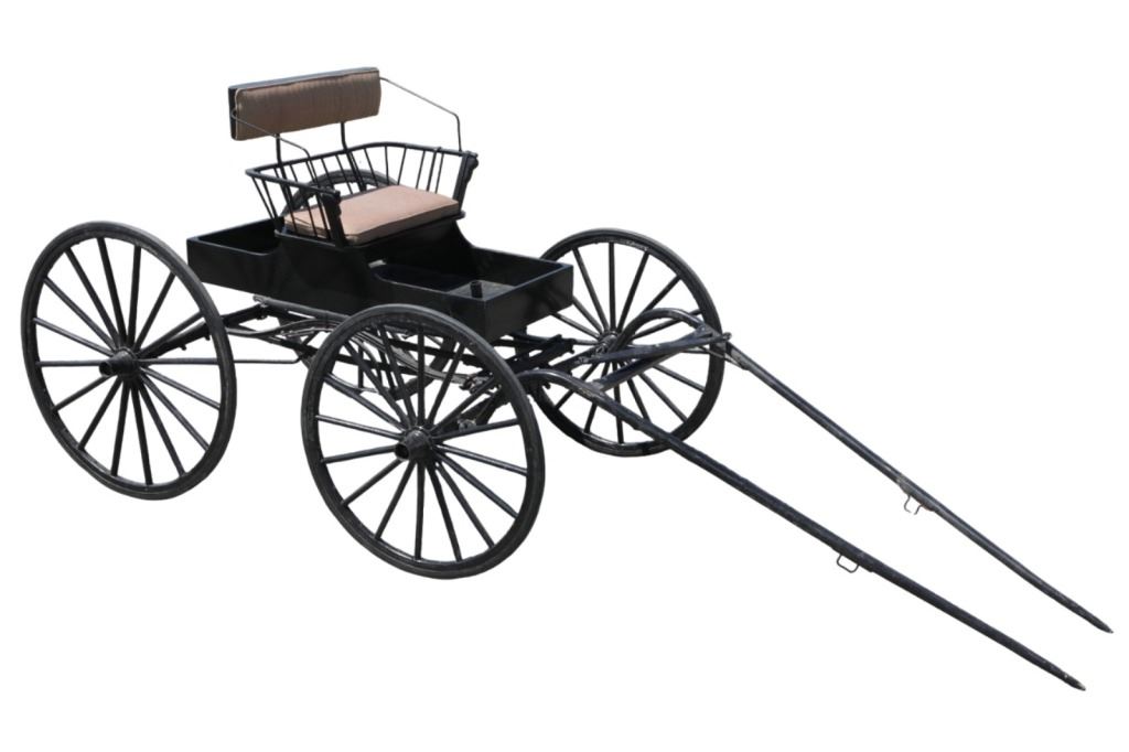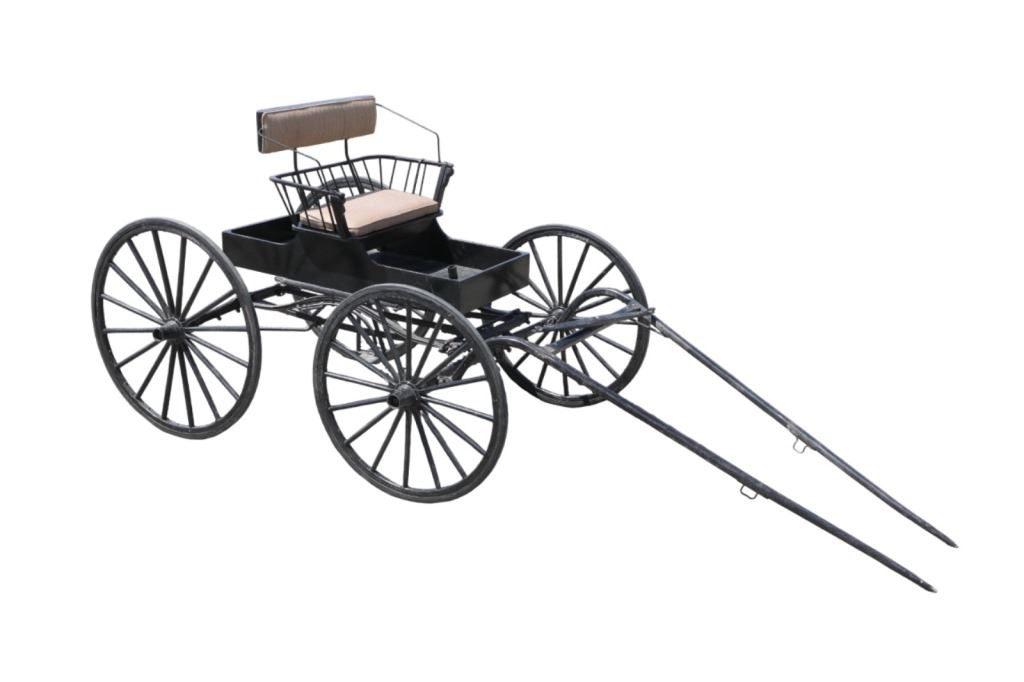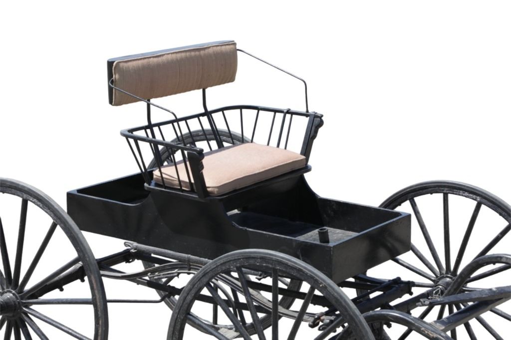 Featured in this lot is this iconic five spring streamline carriage circa 19th century with restoration. The carriage is wonderfully and professionally crafted wooden and iron construction that shows black lacquer finish and preserve layer to the wrought iron implements. This is a four wheel horse drawn streamline carriage made for speedy assembly and used for speedy transportation. The five spring design is iconic for being much smoother than carriages with less springs due to the condition of roads and made them much more desirable for transportation of goods and personnel. This carriage comes complete with the original yoke shown present with complete restoration consistent with the carriage itself, although the D-Clip shown is modern, the rest of the construction and implements would have been originally constructed in the 19th century when the carriage was made. The seat on top shows an upholstered and removable cushion with a seat back and some slight storage in the back for amenities or luggage. The carriage features step down sides with wrought iron framing parts possibly custom forge made due to the lack of a makers mark. The condition of this of this carriage is well preserved with some weathering wear consistent with age and use with the yoke showing similar condition but otherwise shows minimal oxidation to the springs or other implements of the carriage and shows a well preserved overall condition. The measurements of this carriage is 67" H x 172" L x 71 1/2 W. The collective weight of this carriage is