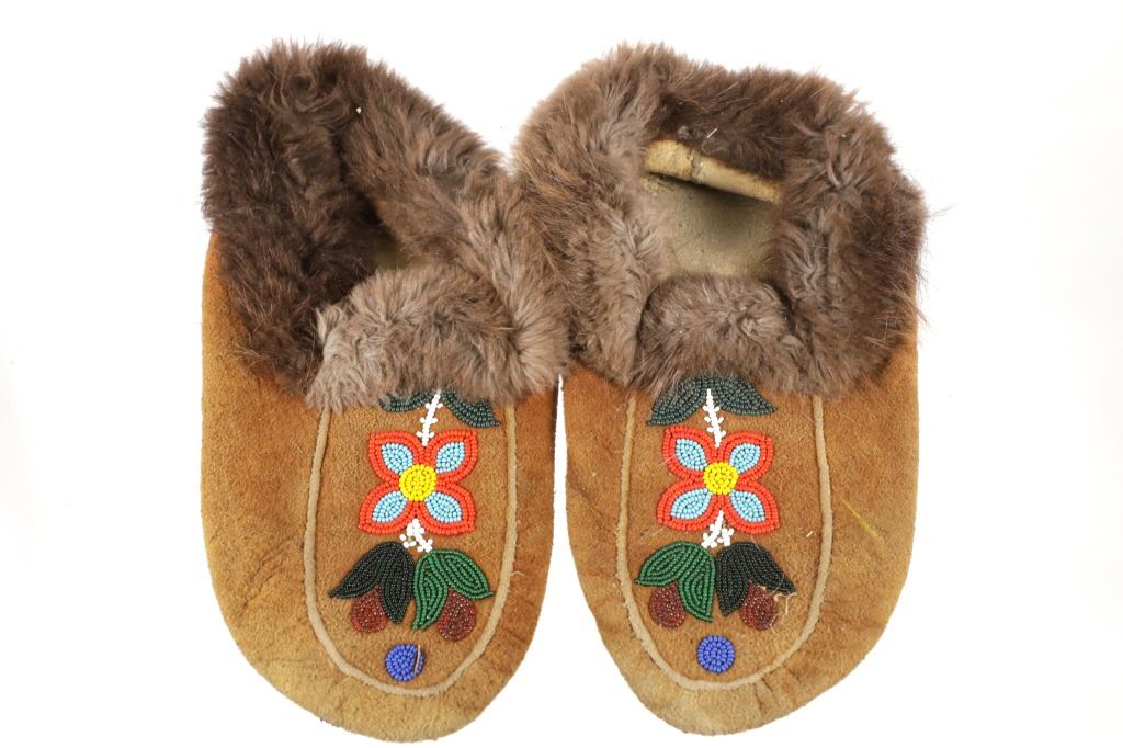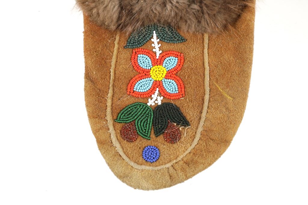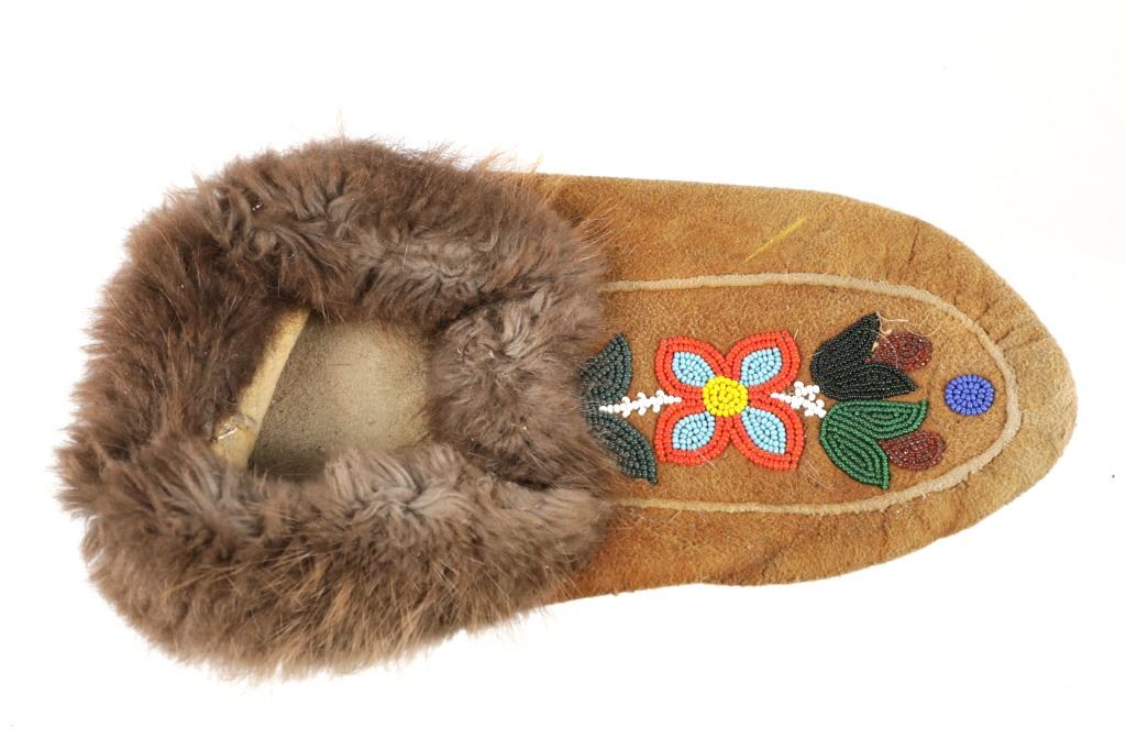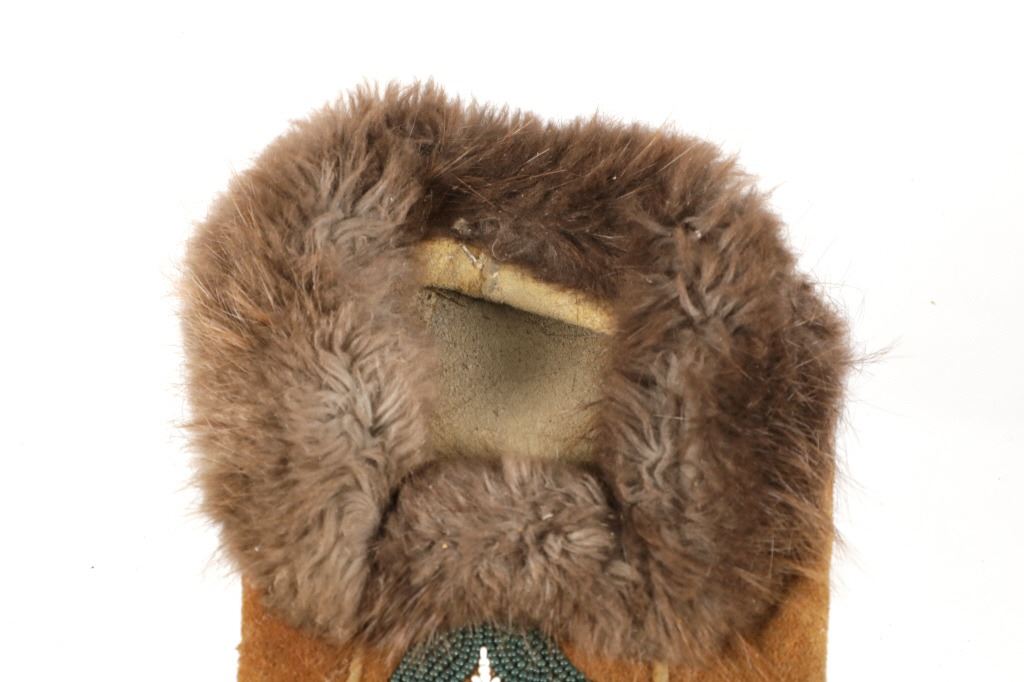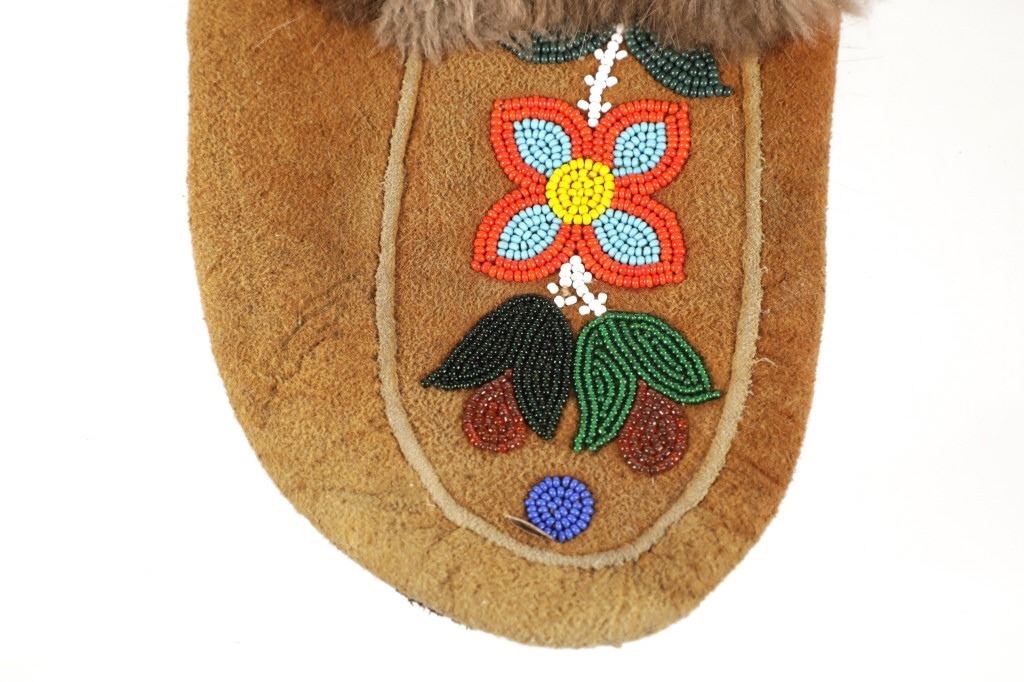 Featured in this lot is this Ojibwe moose hide beaded mocassins circa 20th century. The mocassins features a wonderfully and professionally crafted Indian tanned moose hide, rabbit fur, and trade seed beads construction that shows a floral arrangement that includes coloration such as Pumpkin orange, chalk white, green, black, maroon, sky blue, blue, and yellow. The condition of this pair of Ojibwe mocassins is good with no obvious signs of damage and shows good overall condition. The measurements of this pair of mocassins is 11 3/4" x 5 5/8" x 3". The collective weight of this pair of mocassins is 6oz.
