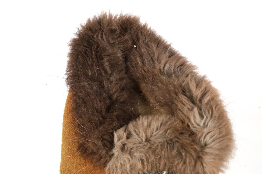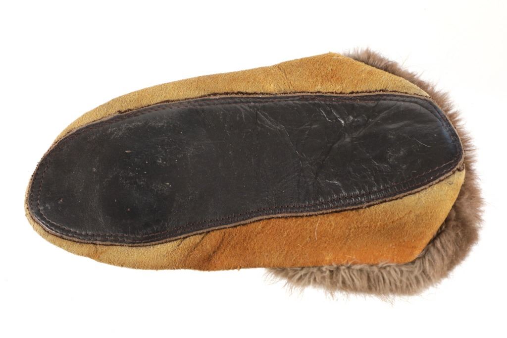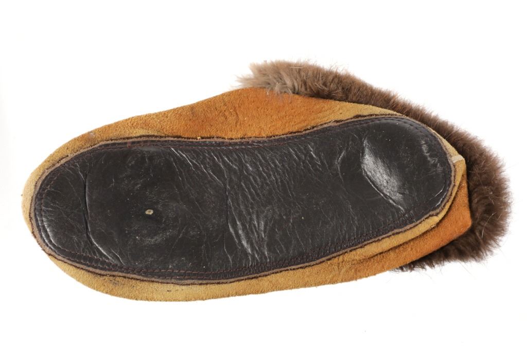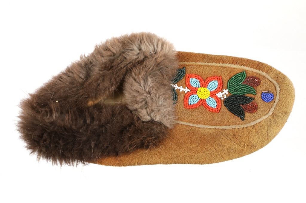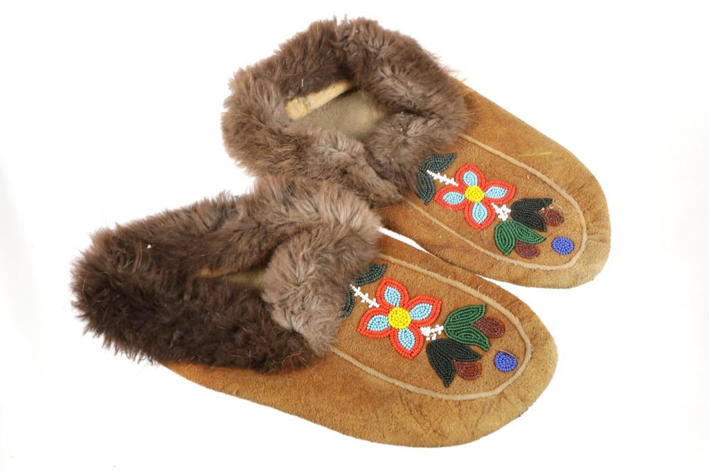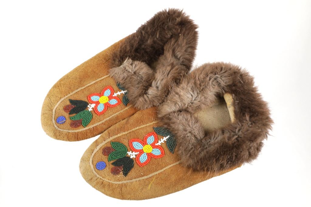 Featured in this lot is this Ojibwe moose hide beaded mocassins circa 20th century. The mocassins features a wonderfully and professionally crafted Indian tanned moose hide, rabbit fur, and trade seed beads construction that shows a floral arrangement that includes coloration such as Pumpkin orange, chalk white, green, black, maroon, sky blue, blue, and yellow. The condition of this pair of Ojibwe mocassins is good with no obvious signs of damage and shows good overall condition. The measurements of this pair of mocassins is 11 3/4" x 5 5/8" x 3". The collective weight of this pair of mocassins is 6oz.