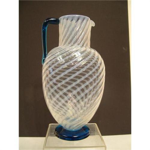 AN EXCLENT MID 19Th.CENT.EWER.IT HAS 20 WHITE OPALESCENT RIBS AND A WONDERFUL BLUE APPLIED HANDLE AND FOOT.THE FOOT HAS BEEN GROUND AND POLISHED AND SHOWING THE CORRECT WEAR FOR AN 1850 EWER.THE PONTAL IS ALSO GROUND AND POLISHED.