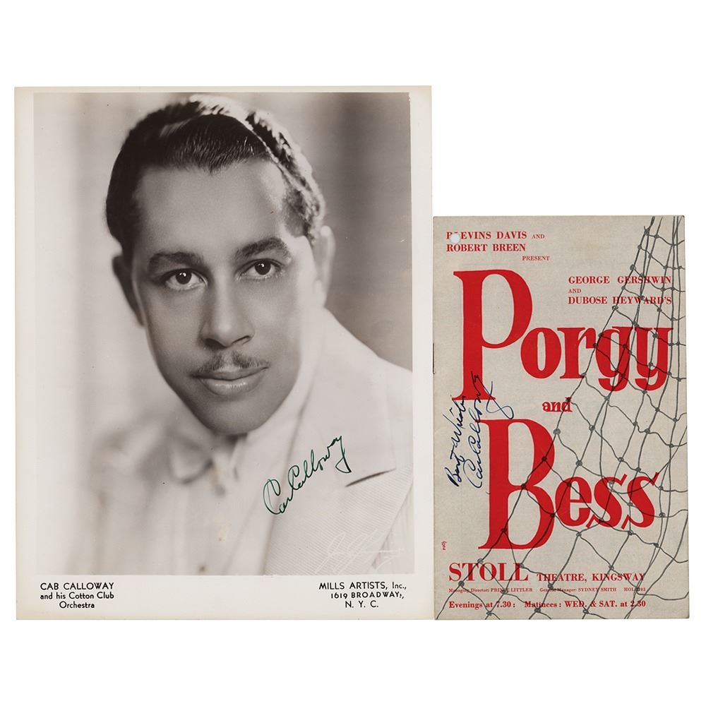Two items: a vintage glossy 8 x 10 Mills Artists photo of Calloway, signed in fountain pen, "Cab Calloway"; and a program for George Gershwin and Dubose Heyward's Porgy and Bess at the Stoll Theatre, signed on the front cover in fountain pen, "Best Wishes, Cab Calloway." In fine condition, with light handling wear, and a punch hole, to the program.