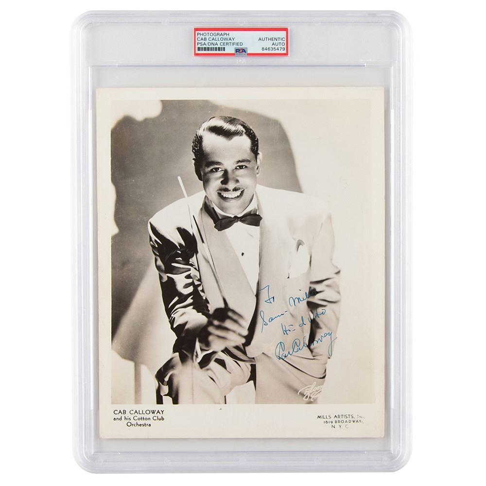 Vintage glossy 8 x 10 publicity photo of Calloway in a wonderful front-facing pose holding his bandleader baton, signed and inscribed in fountain pen, "To Sam Miller, Hi di ho, Cab Calloway.& rdquo; In fine condition. Encapsulated in a PSA/DNA authentication holder.