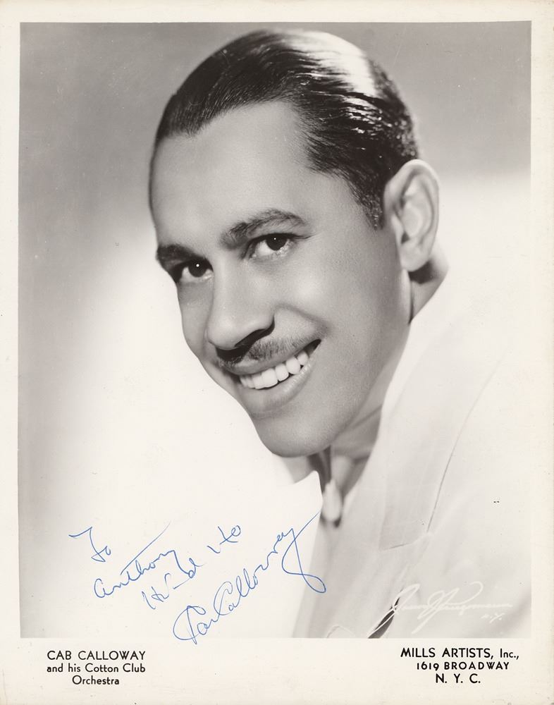 Glossy 8 x 10 James J. Kriegsmann photo of Calloway as the leader of the Cotton Club Orchestra, signed and inscribed in blue ballpoint, "To Anthony, Hi-di-Ho, Cab Calloway." In very good to fine condition, with surface impressions from another item that was signed on top of this one.