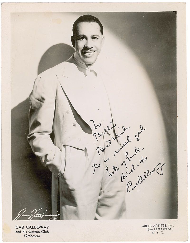 Vintage glossy 8 x 10 publicity photo, signed and inscribed in fountain pen “To Billie, Best wishes to a swell gal. Lots of luck. Hi de Ho, Cab Calloway.” In very good condition, with scattered creases, surface marks, a couple trivial edge tears, and some light toning to left border.