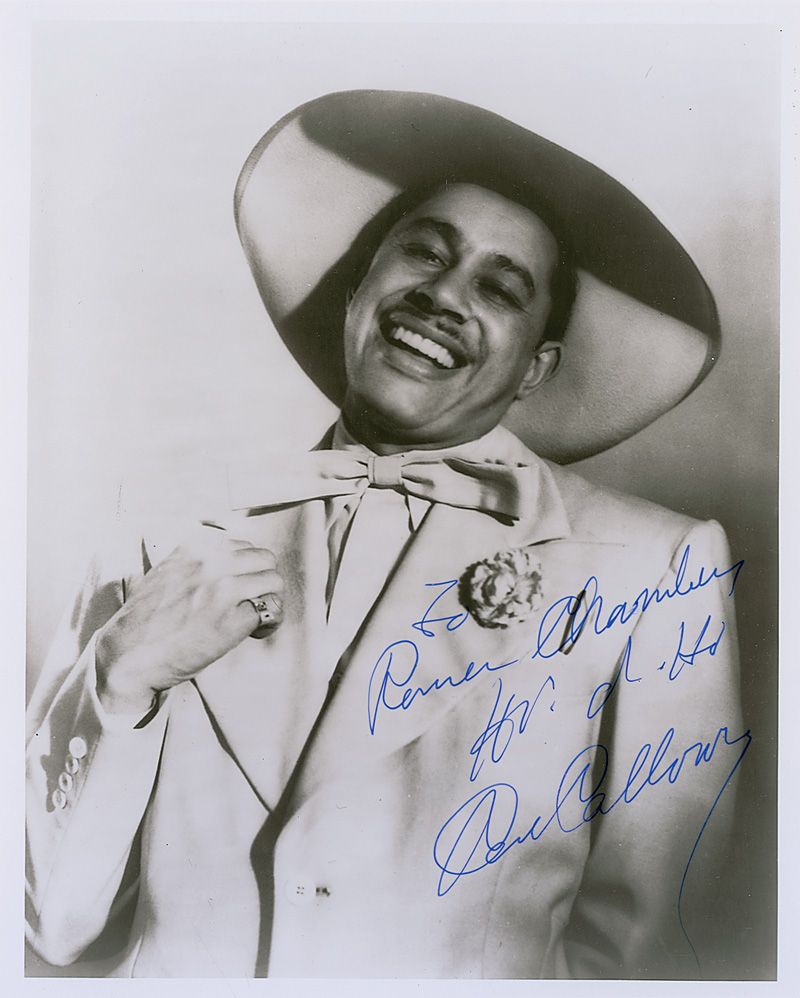 Glossy 8 x 10 photo of Calloway in a hat and bow tie, signed and inscribed in blue ink “To Rene Chambley, Hi-Di-Ho, Cab Calloway.” In fine condition.
