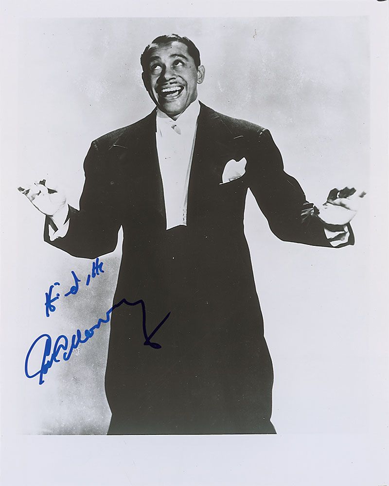 Glossy 8 x 10 photo of Calloway in a white tie and tails, signed in person in blue felt tip, “Hi-de-ho Cab Calloway.” In fine condition. Originally obtained by in-person specialist Mike Wehrmann.
