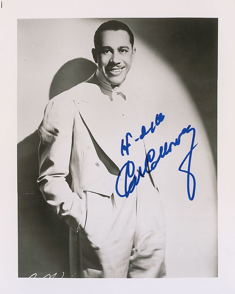Glossy 8 x 10 photo of Calloway in a white tie and tails, signed in blue felt tip, “Hi-d-Ho, Cab Calloway.” In fine condition, with a couple minor corner tip creases as well as a couple of fingerprints.