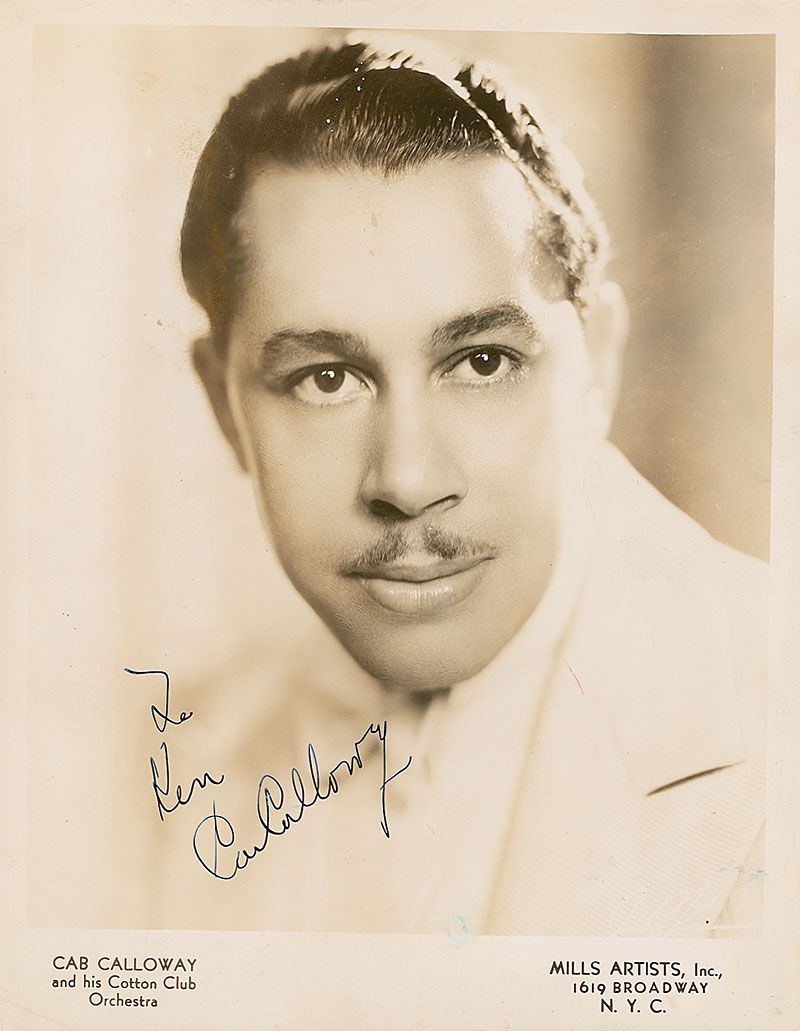 Vintage glossy 8 x 10 publicity photo of Calloway in a bright white suit, signed and inscribed in fountain pen, “To Ken, Cab Calloway.” In fine condition, with some trivial stray ink marks.