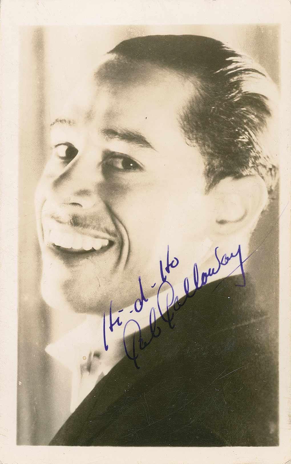 Vintage glossy 3.5 x 5.75 postcard photo, signed in purple fountain pen, “Hi-d-ho, Cab Calloway.” In fine condition, with scattered light surface marks, and light contrast to portion of signature against dark portion of image.