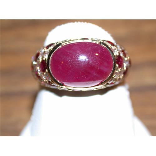 Diamonds & Rubies: 5 Kt. Cabachon Ruby center stone. 14 small Cabachon rubies set in the band - .28 Kt. Great Color Rubies. 48 Diamond weighing .5 Ct.