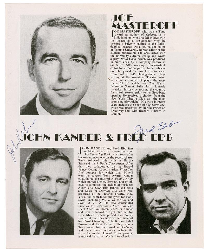 Colorful Cabaret program, 9 x 11.25, signed inside in blue ink above their respective photos by John Kander and Fred Ebb. Also signed in blue felt tip by actress Lila Kedrova. In fine condition, with mild handling wear.