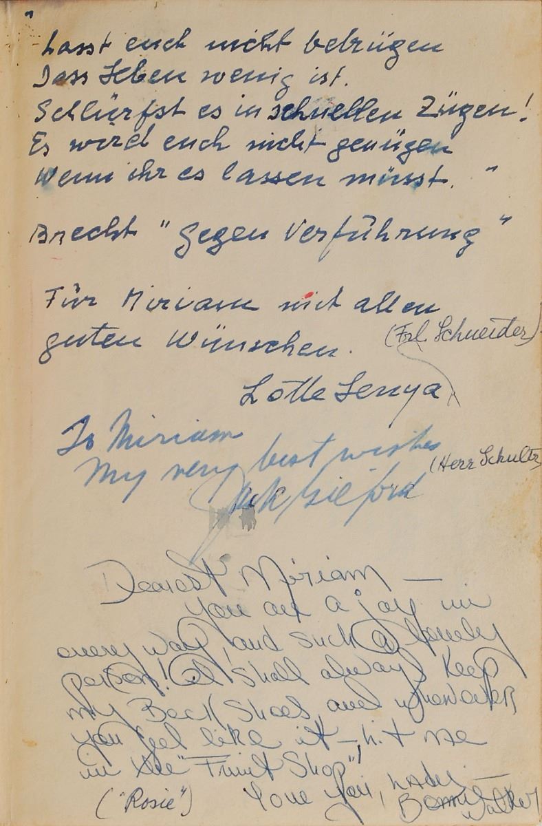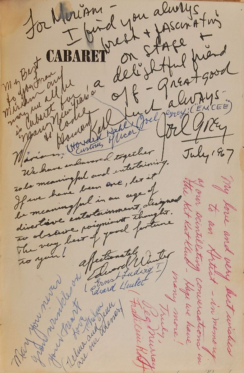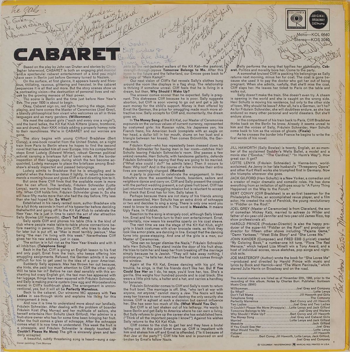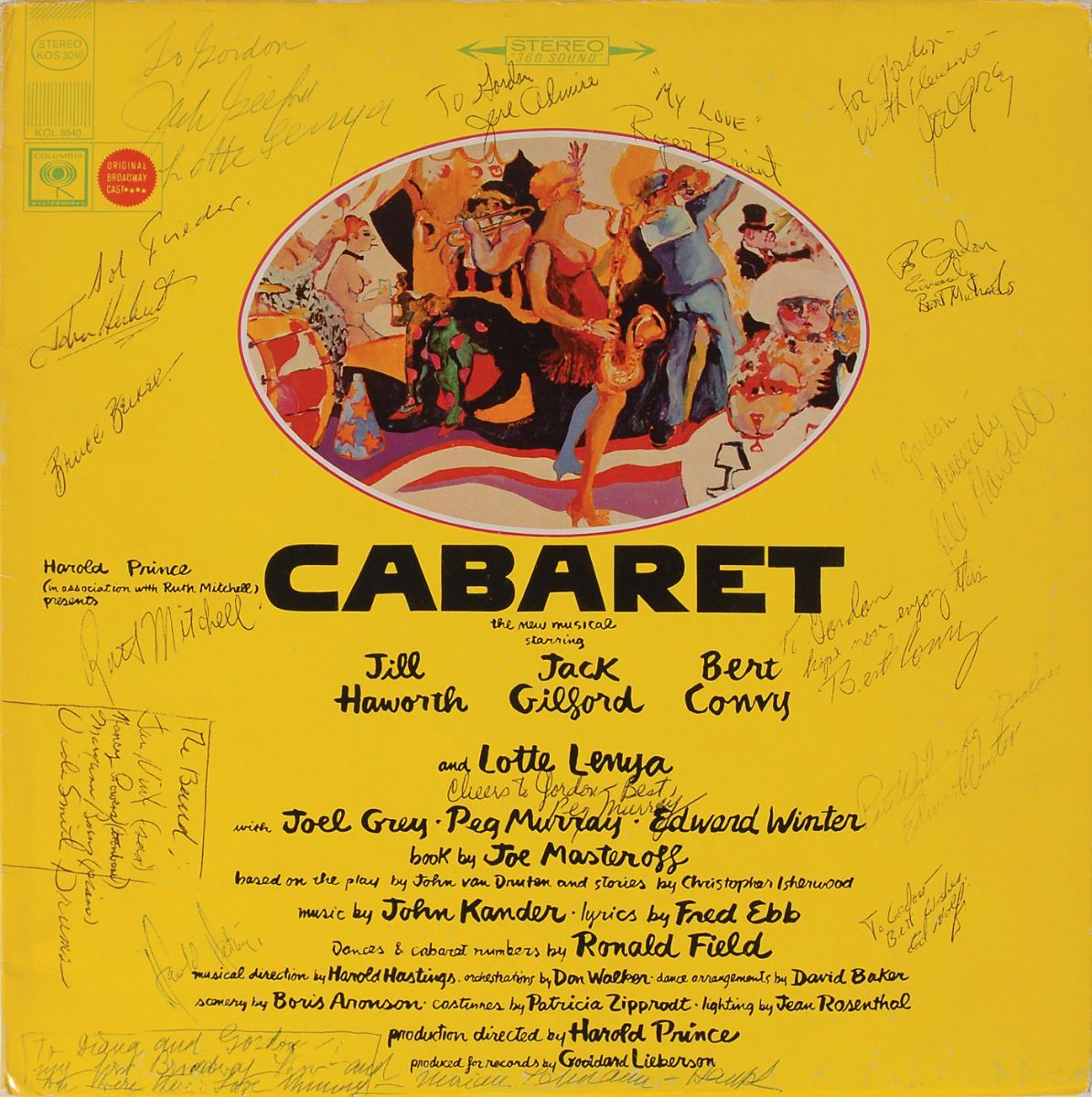 Two items: a hardcover edition of Harold Prince’s Cabaret, signed and inscribed inside by many members of the cast including Lotte Lenya, Jack Gilford, Joel Grey, and Bert Convy; and a Cabaret soundtrack album, signed and inscribed on the front and back by numerous members of the cast, again including Lotte Lenya, Jack Gilford, Joel Grey, and Bert Convy. In overall very good to fine condition, with tape stains to some pages of the book, a few detached, and some pages taped in.