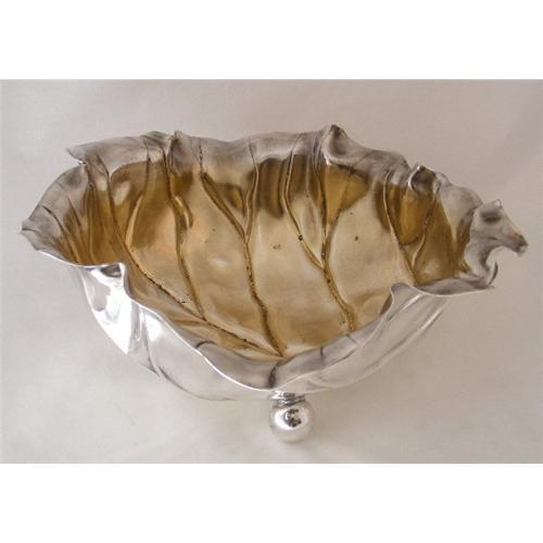 A realistically modeled cabbage leaf bowl. Immaculate condition. The inside is gilded so the the fruit will not darken the silver. There are three ball feet.
