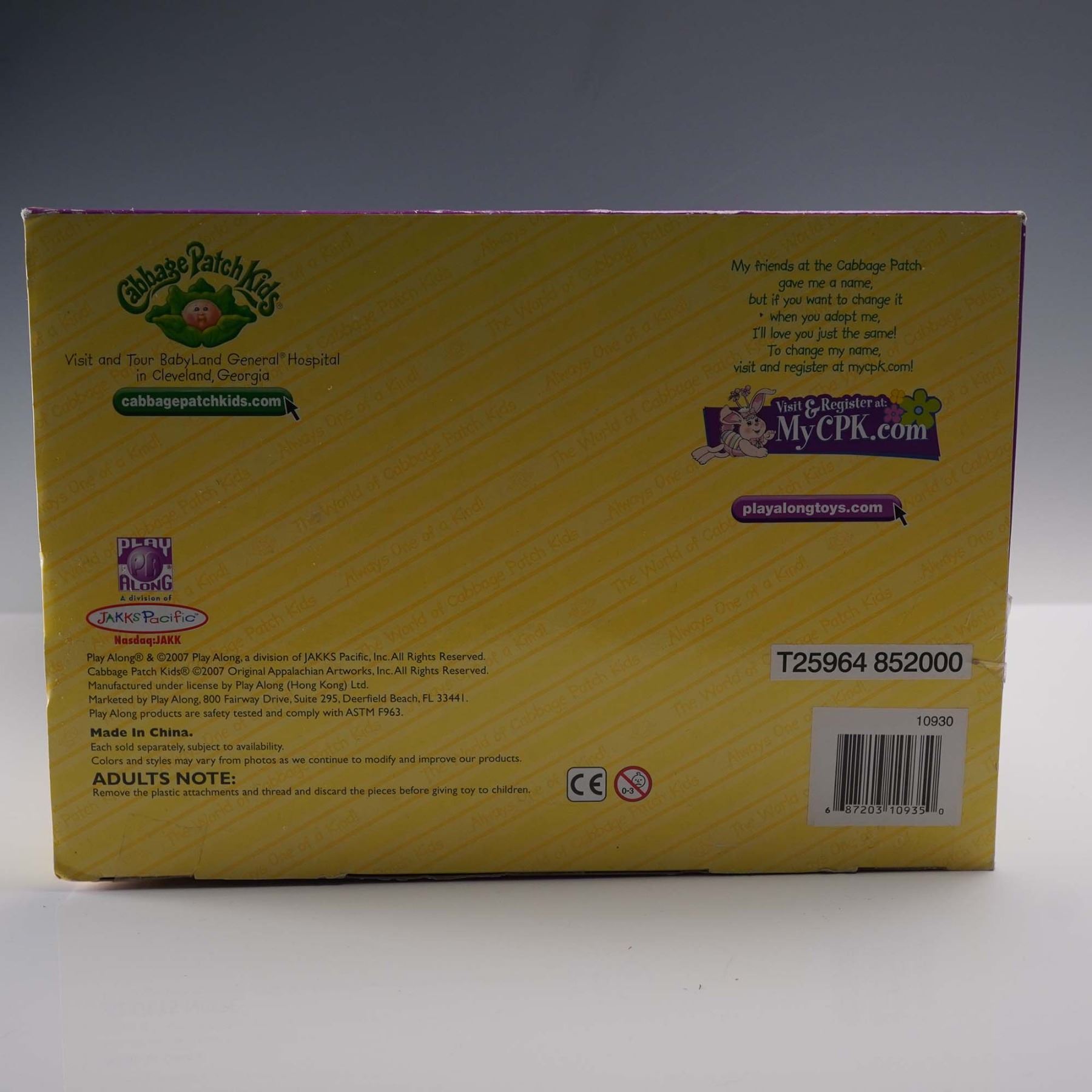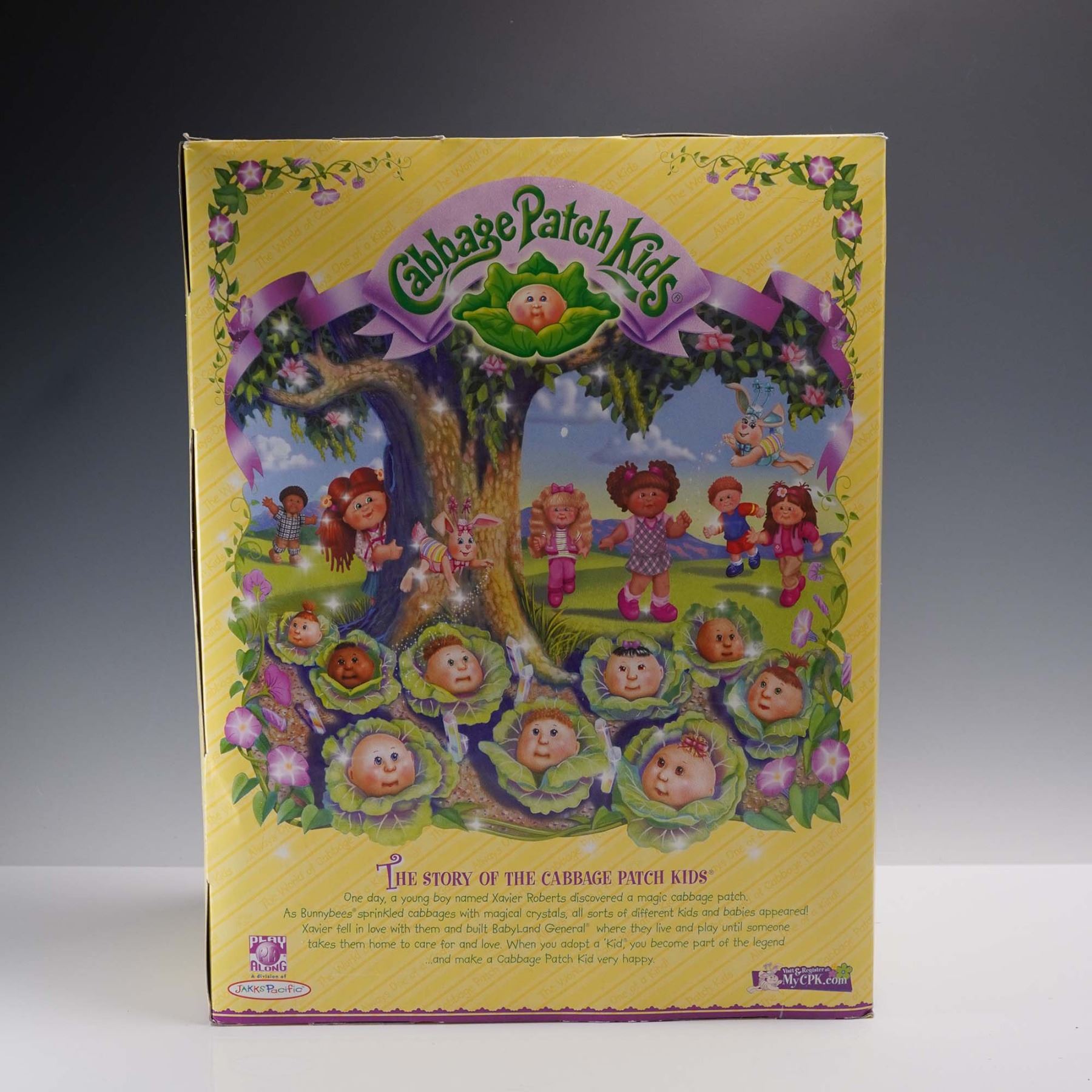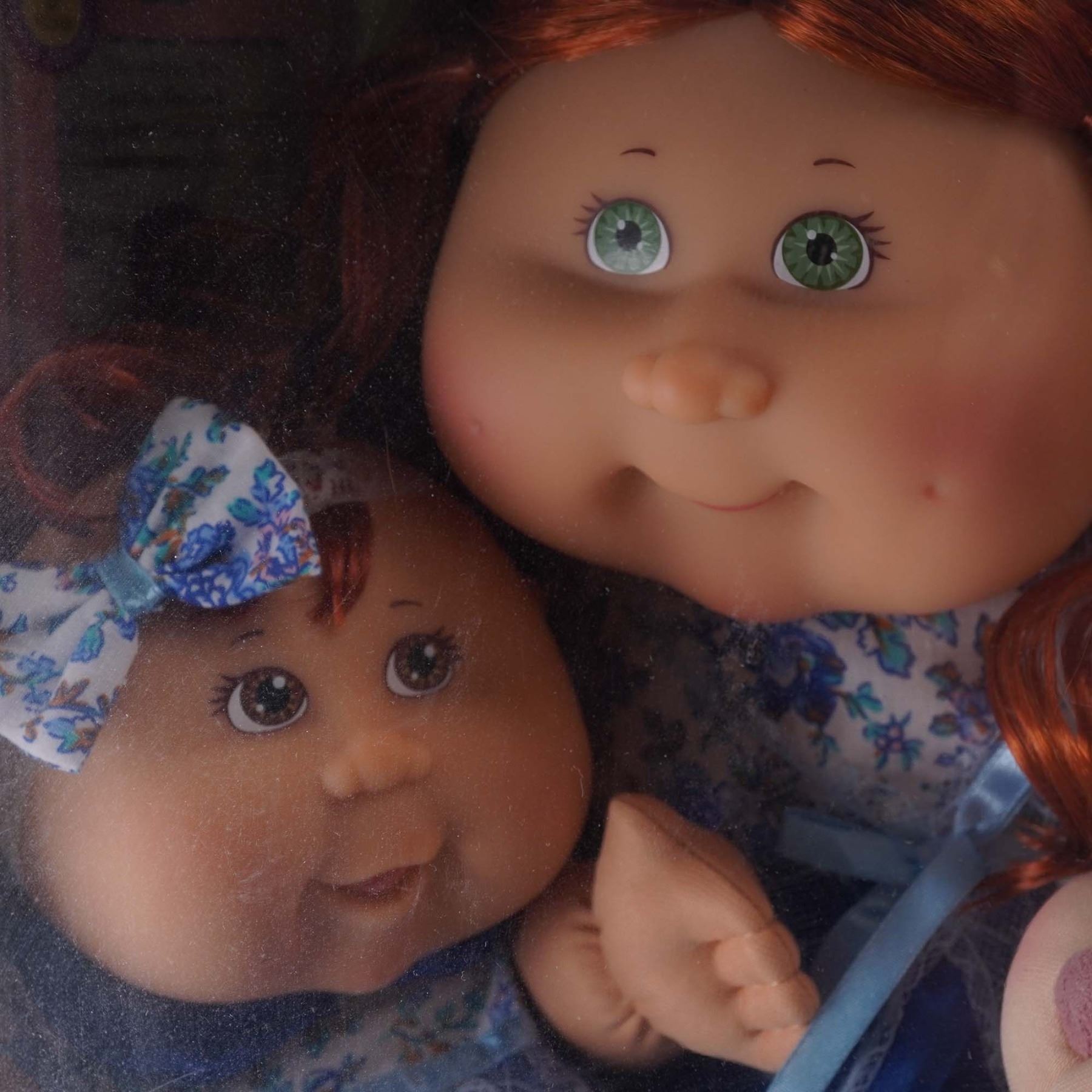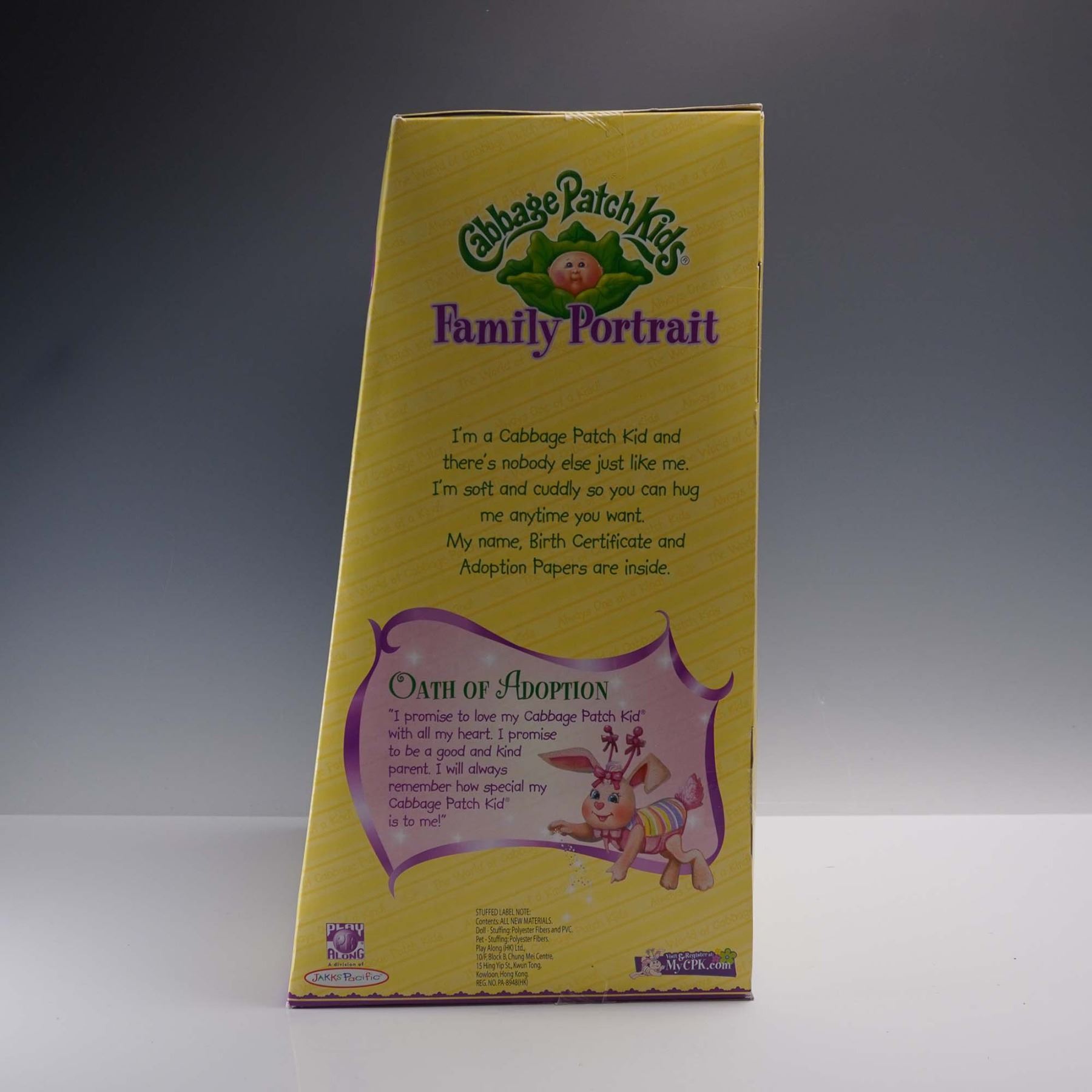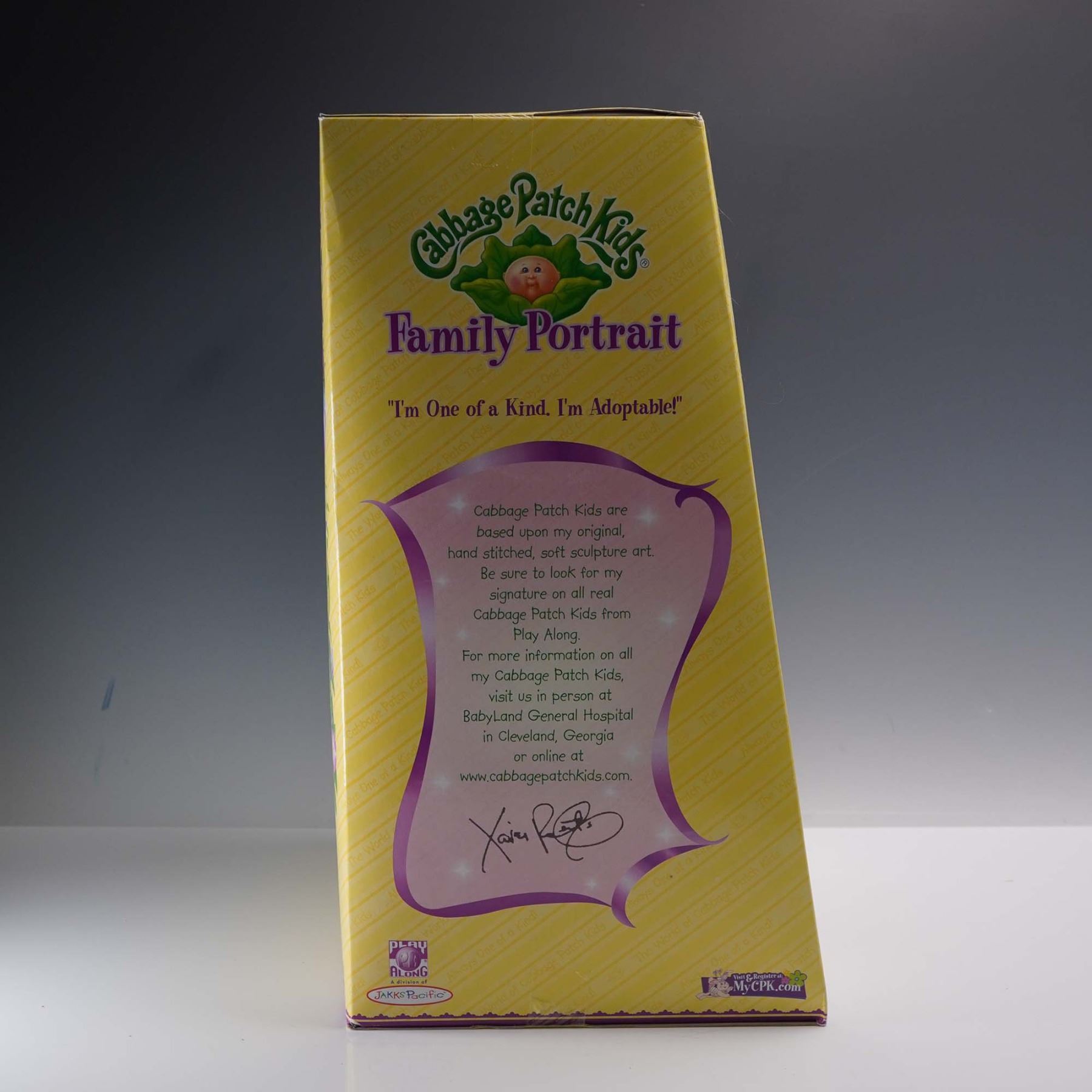 Classic Cabbage Patch Kids Family Portrait boxed set by Play Along, featuring a coordinated trio of plush figures including a 16-inch Cabbage Patch Kid with red hair in a blue floral dress, a matching CPK Newborn in a blue outfit with bow headband, and a white CPK Puppy with pink bows. The box highlights the feeding feature where the newborn's face changes from clean to messy and back again. All items remain sealed in their original packaging, which is brightly decorated and well-preserved. A delightful and nostalgic addition to any Cabbage Patch collection.