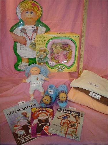 "Cabbage Patch" Assortment: 1) Cabbage Patch Kids Pin-Ups #3934, New, Never opened. 2) Blue Cabbage Patch Slippers. 3) Cabbage Patch Doll. 4) Box of Cabbage Patch Sewing Necessities. 5) Cabbage Patch Kids Romper
