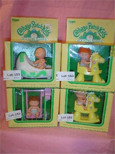 "Cabbage Patch Kids" by Tomy. 4 Boxes: Rocking Babies #2596 Red Hair on Horse, Rocking Babies #2596 Yellow Hair on Horse, Rocking Babies #2596 In Baby Cradle, Rocking Babies #2596 In Swing. All new, Never opened