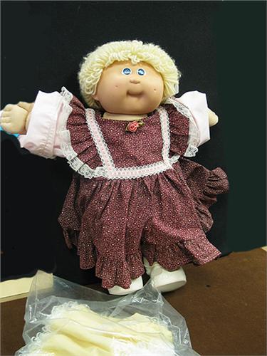 Cabbage Patch doll with a T-shirt on under the dress reading "Cabbage Patch Baby land General Hospital Cleveland, Georgia c1990"