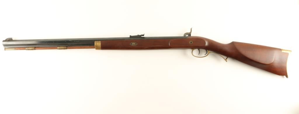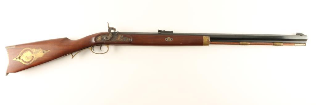 Modern production percussion .50 caliber plains rifle, manufactured in Italy. Features a blued 28" heavy octagonal barrel, large blade front sight, adjustable rear sporting sight, wood ram rod, brass furniture, double set triggers, case hardened lock, serrated hammer spur, patch box and one piece smooth walnut shoulder stock with cheek rest & crescent buttplate. Rifle exhibits approximately 87% of it's original finish with scattered light surface rust. Brass parts show areas of heavy oxidation. Action works well, bore is clear and wood stock is good with a chip at the toe. Condition is near good. ***Antique Firearm***