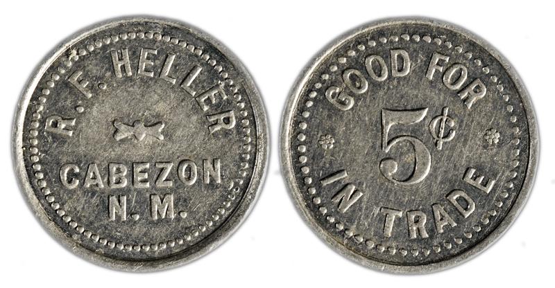 Obverse: R.F. Heller / Cabezon / N.M.; reverse: Good for / 5c/ In Trade. AL, 21mm. Extremely fine condition. Former ranch town near Cabezon peak established on the Ojo Del Espirito Santo Land Grant.