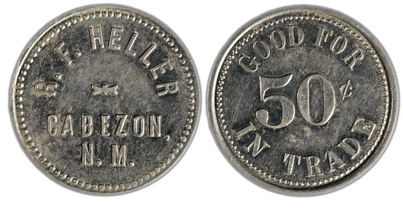 Obverse: R.F. Heller / Cabezon / N. M. ; reverse: Good for / 50c /In Trade. AL, 30mm. Extremely fine condition. Purchased from Hal Birt in 1980. Former ranch town near Cabezon peak established on the Ojo Del Espirito Santo Land Grant.