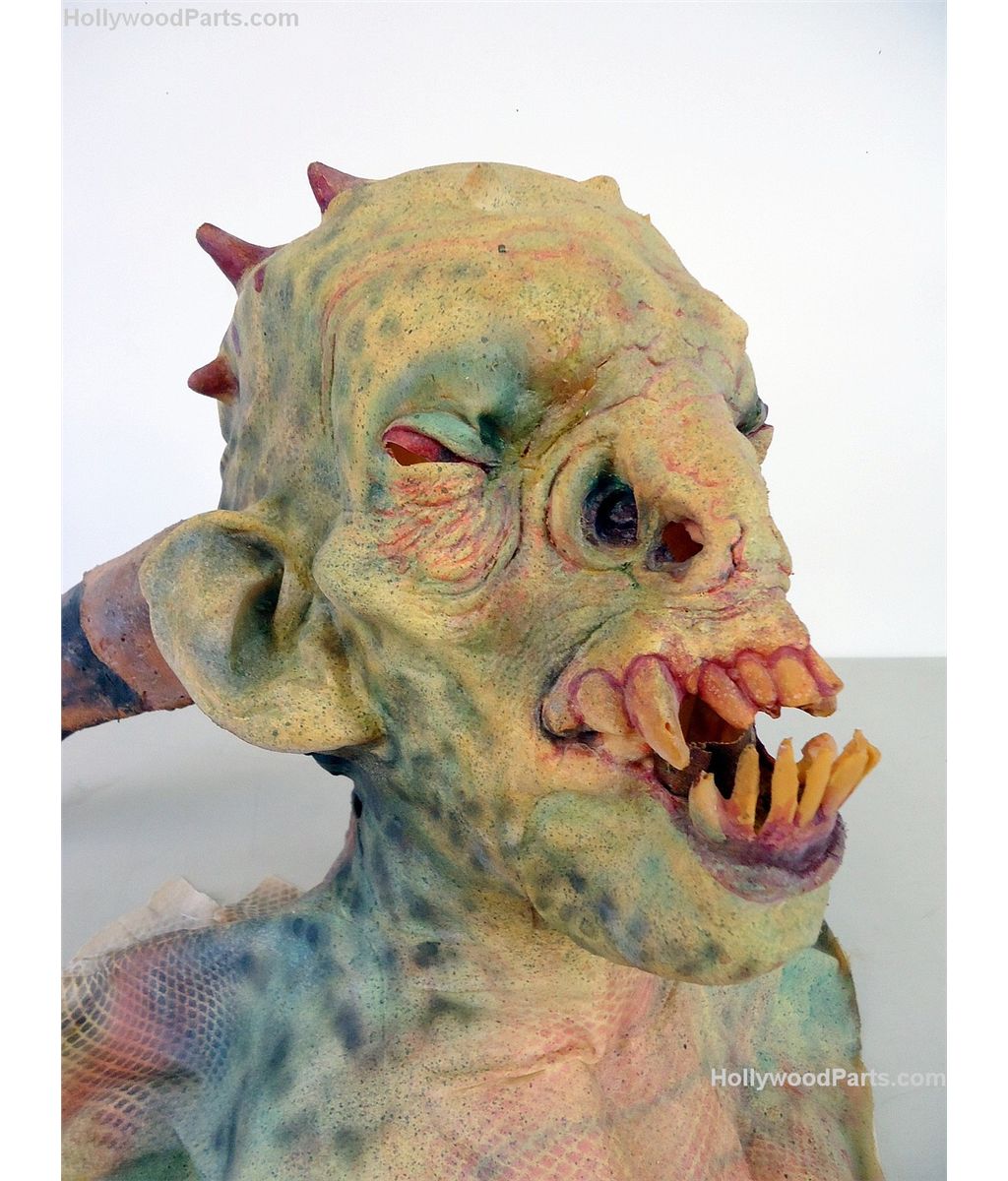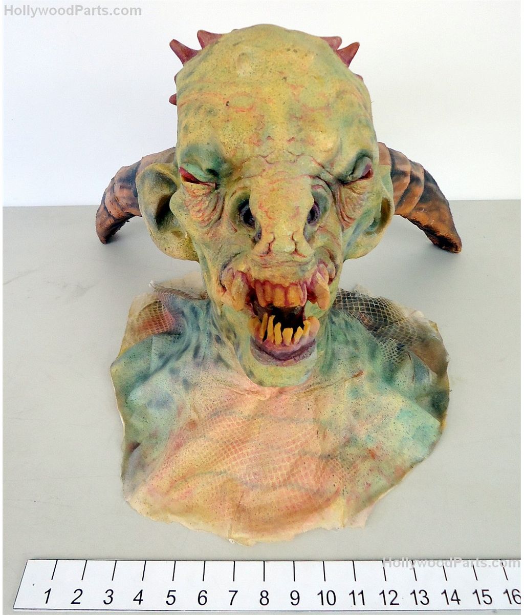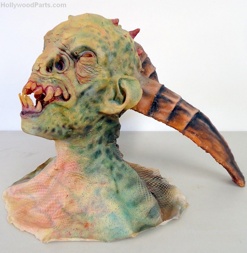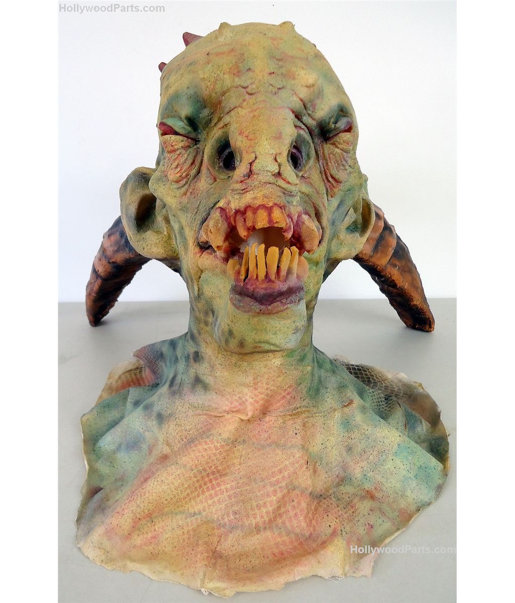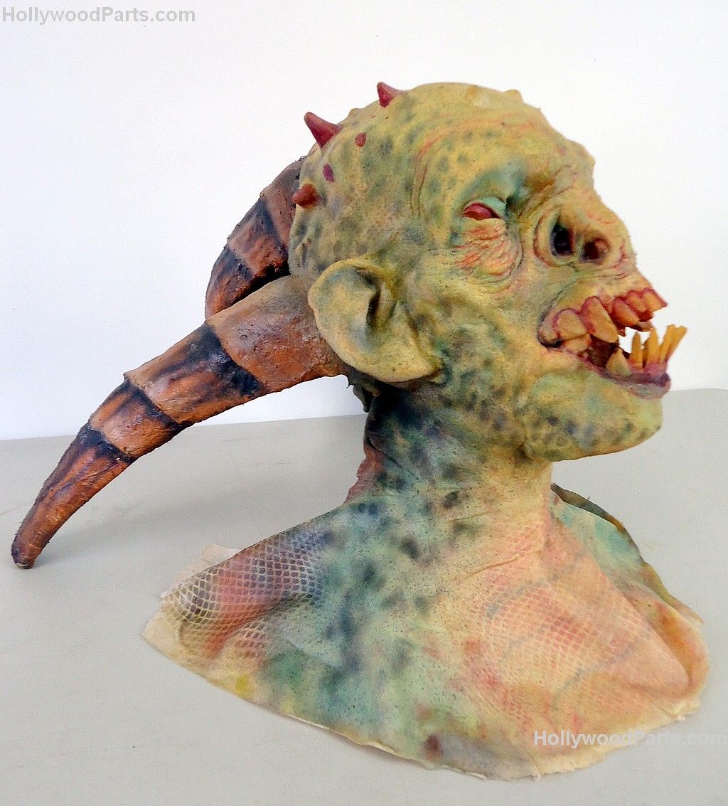 Three-horned original design goblin bust mask made of latex from custom mold. Cloth shround is covered in painted resin and features a button closure in the back to put the mask on.