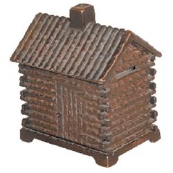 Cabin cast iron bank w/combination lock, highly detailed casting, side coin entry, traces of original gold paint, 4.75"H.