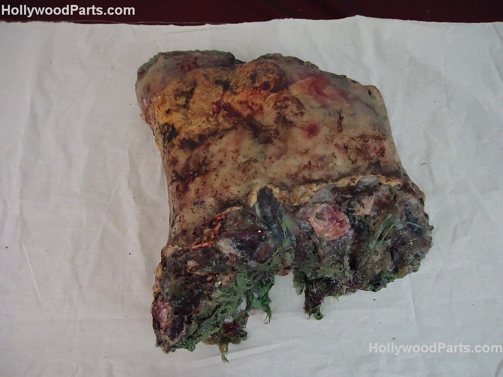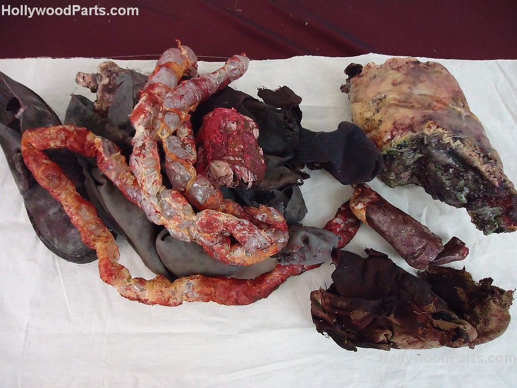 Set of prop latex and resin body parts carried by Judah Buckner. Parts are painted and splattered with fake blood. Mangled body parts are intestines, kidney and stomach with realistic looking tissue. Screen used in Cabin In The Woods.