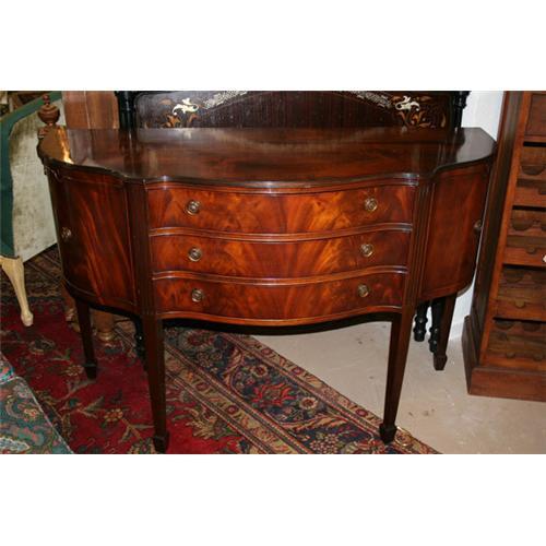 Graceful George III mahogany sideboard having three central drawers, two doors and fluted legs ending in spade feet. This lovely sideboard was purchased in London and dates from the first quarter of the 20th cnetury.