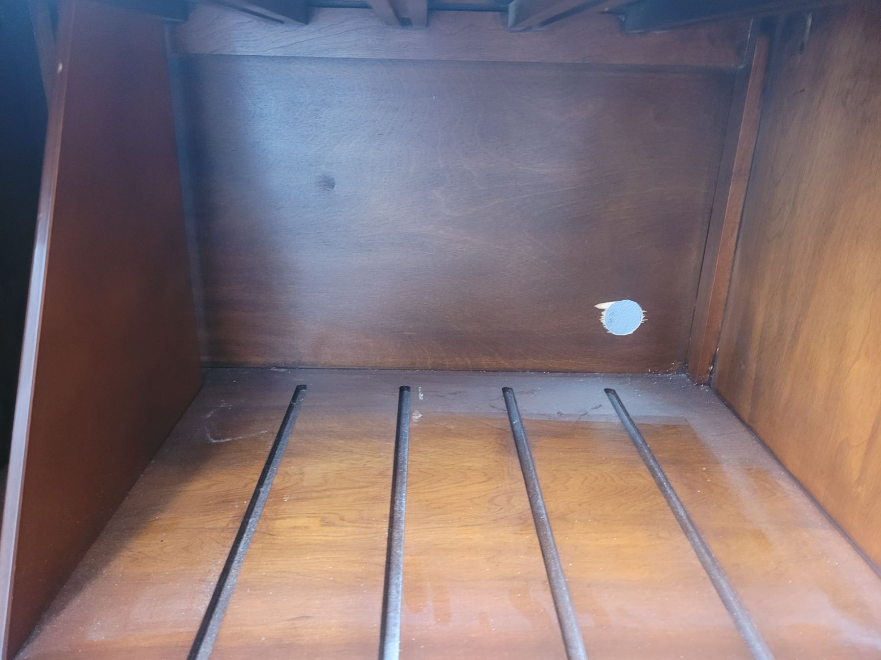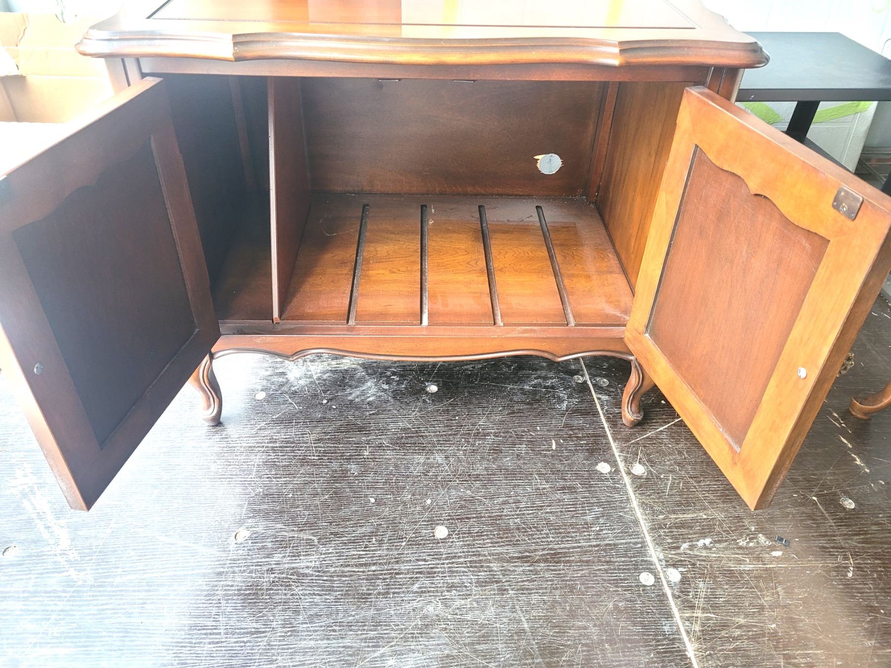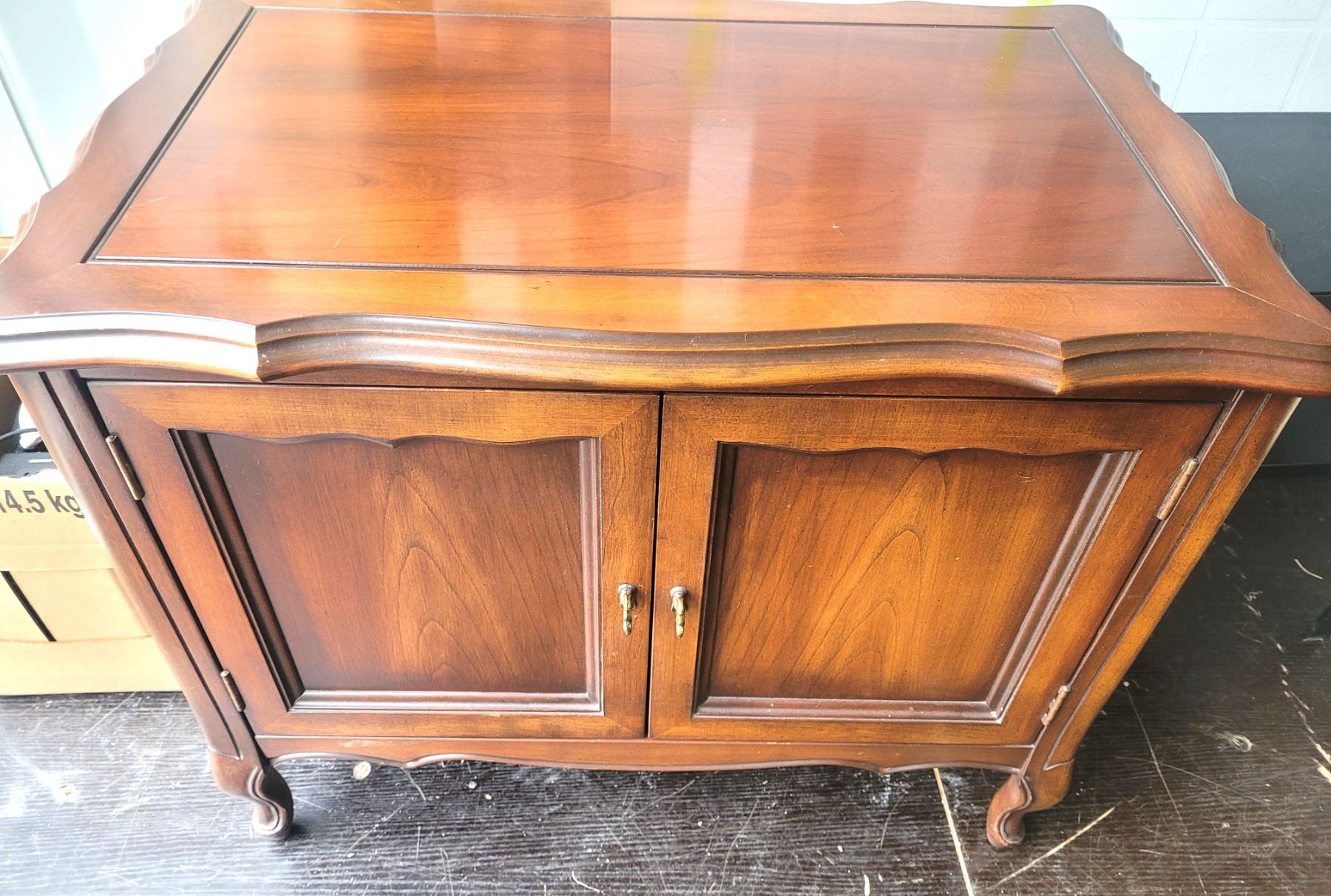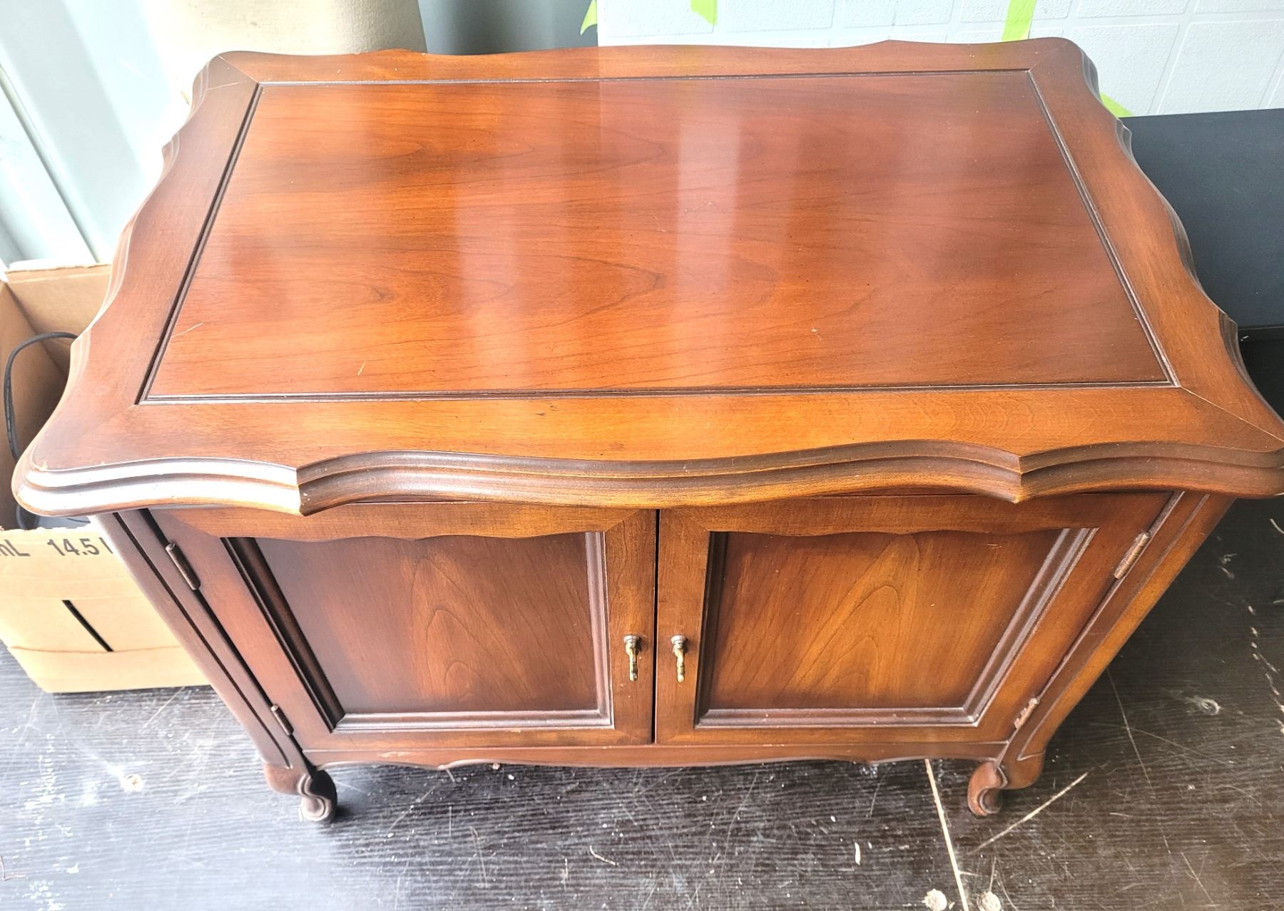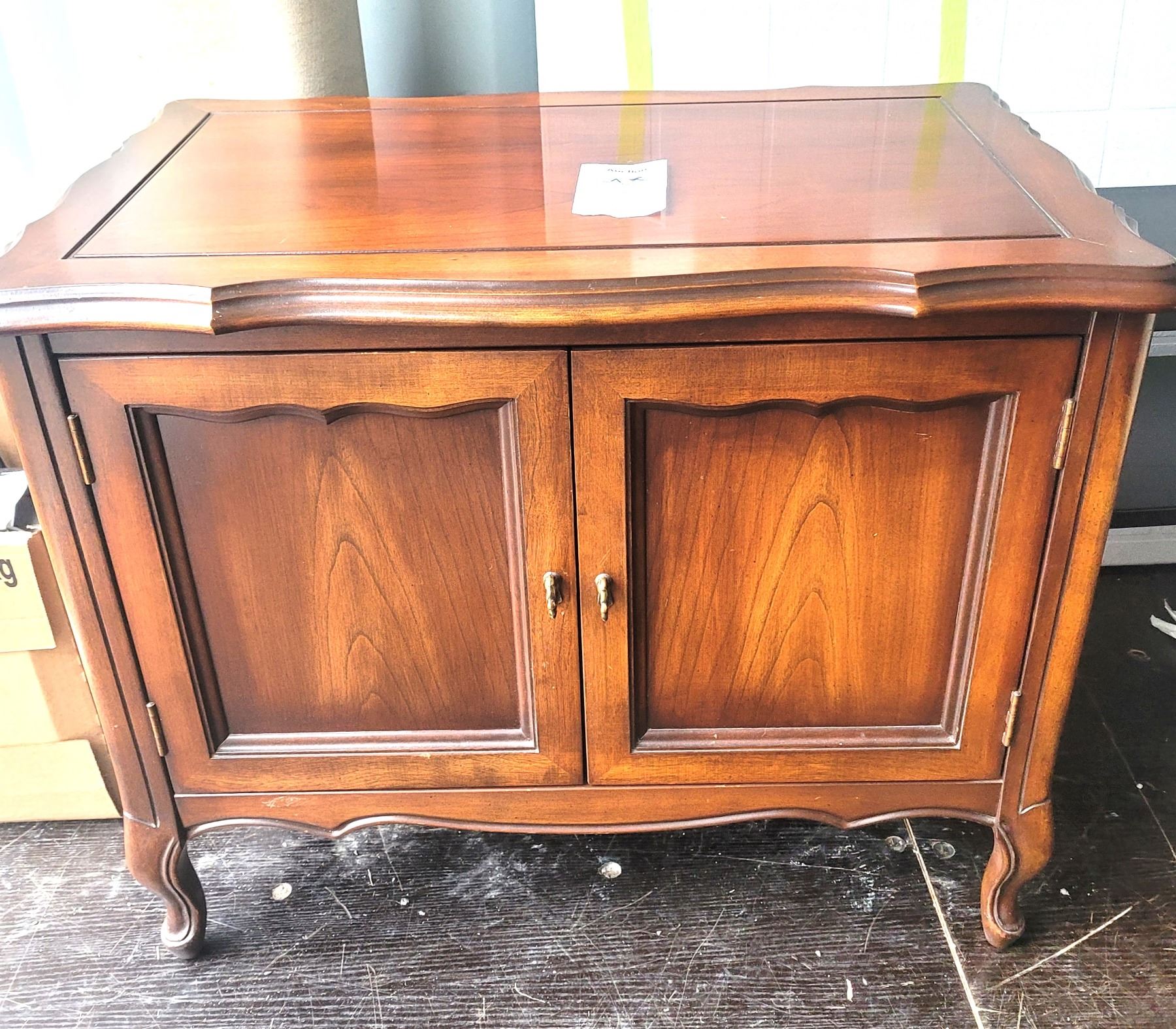 Cabinet was converted from a record cabinet to a tv cabinet, note hole in the back for wiring. Pickup at 11 am