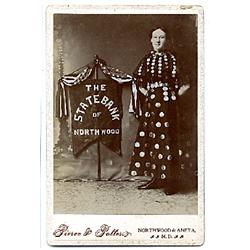 OF NORTHWOOD N.D. Cabinet by Pierce & Potter, Northwood & Aneta, N.D. Many years ago Be-hold presented some amazing examples of the use of women adorned by symbols of the products being advertised. Now they have become a little more familiar, and I haven't had a great example in years-- now here's a doozy. The objects attached to her dress are meant to represent coins.