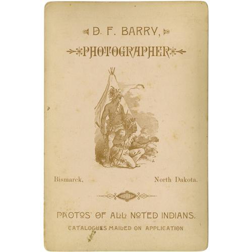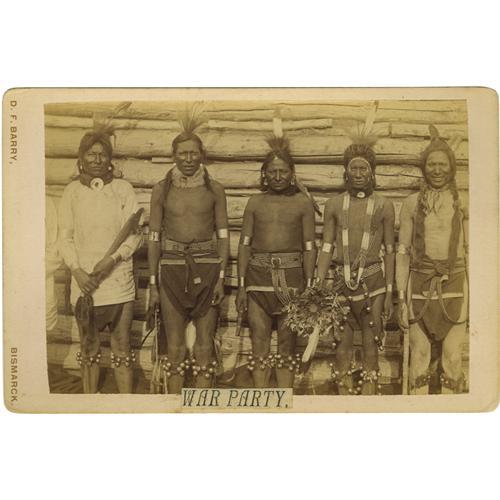 <B>Cabinet Card - Field photograph entitled "War Party"</B></I><BR>Circa 1890<BR>Length 6 1/2 in. Width 4 1/4 in.<BR><BR>The photo depicts five Hunkpapa Sioux dancers posed in front of a log cabin at Standing Rock Agency. The dancers are wearing breechcloths, leather belts studded with brass tacks, dance bells around their calves, etc. Photograph by D. F. Barry with his imprint on the front. Printed on the reverse is his advertisement for "Photos of All Noted Indians". Very good condition.<BR><BR>